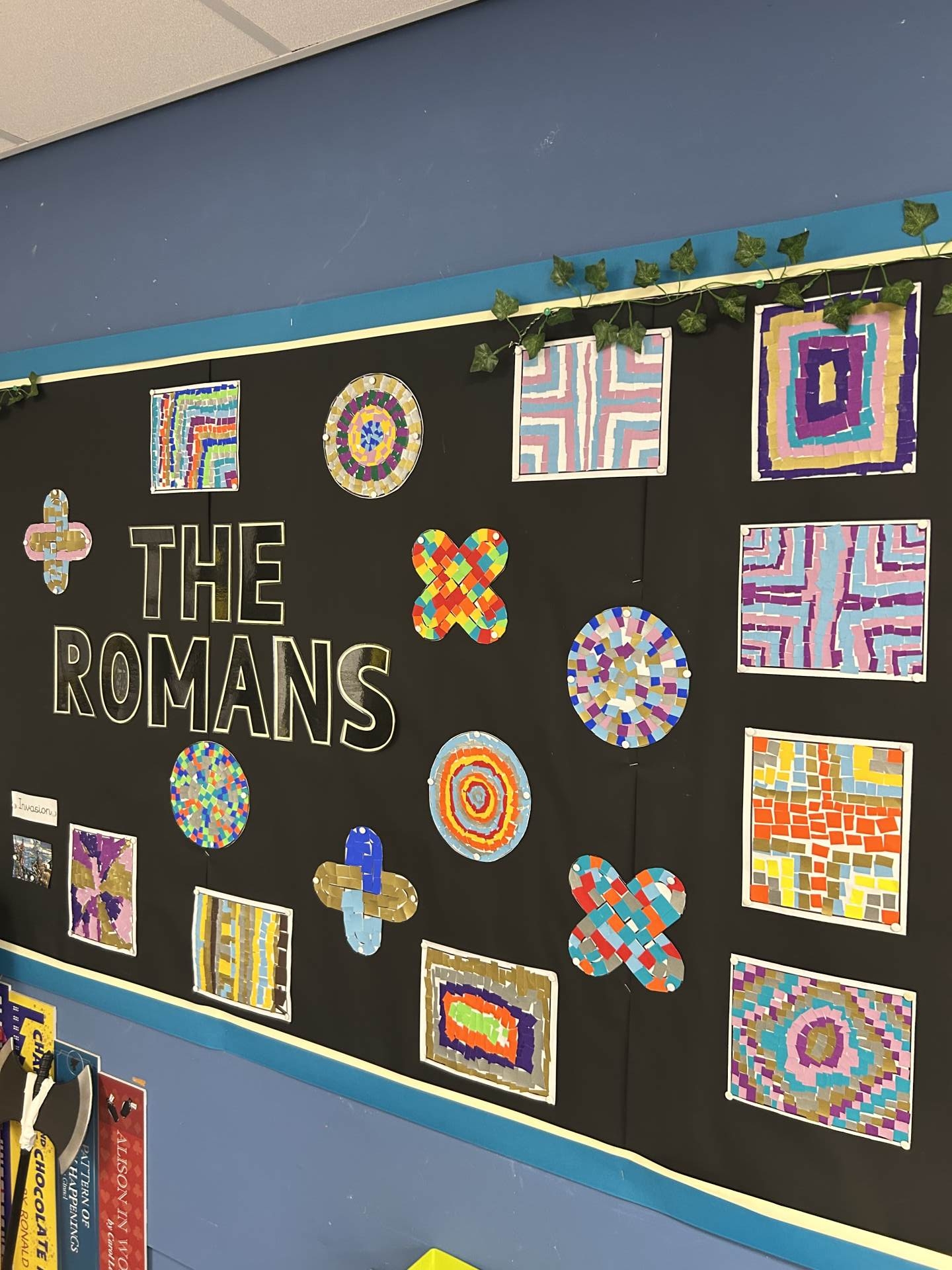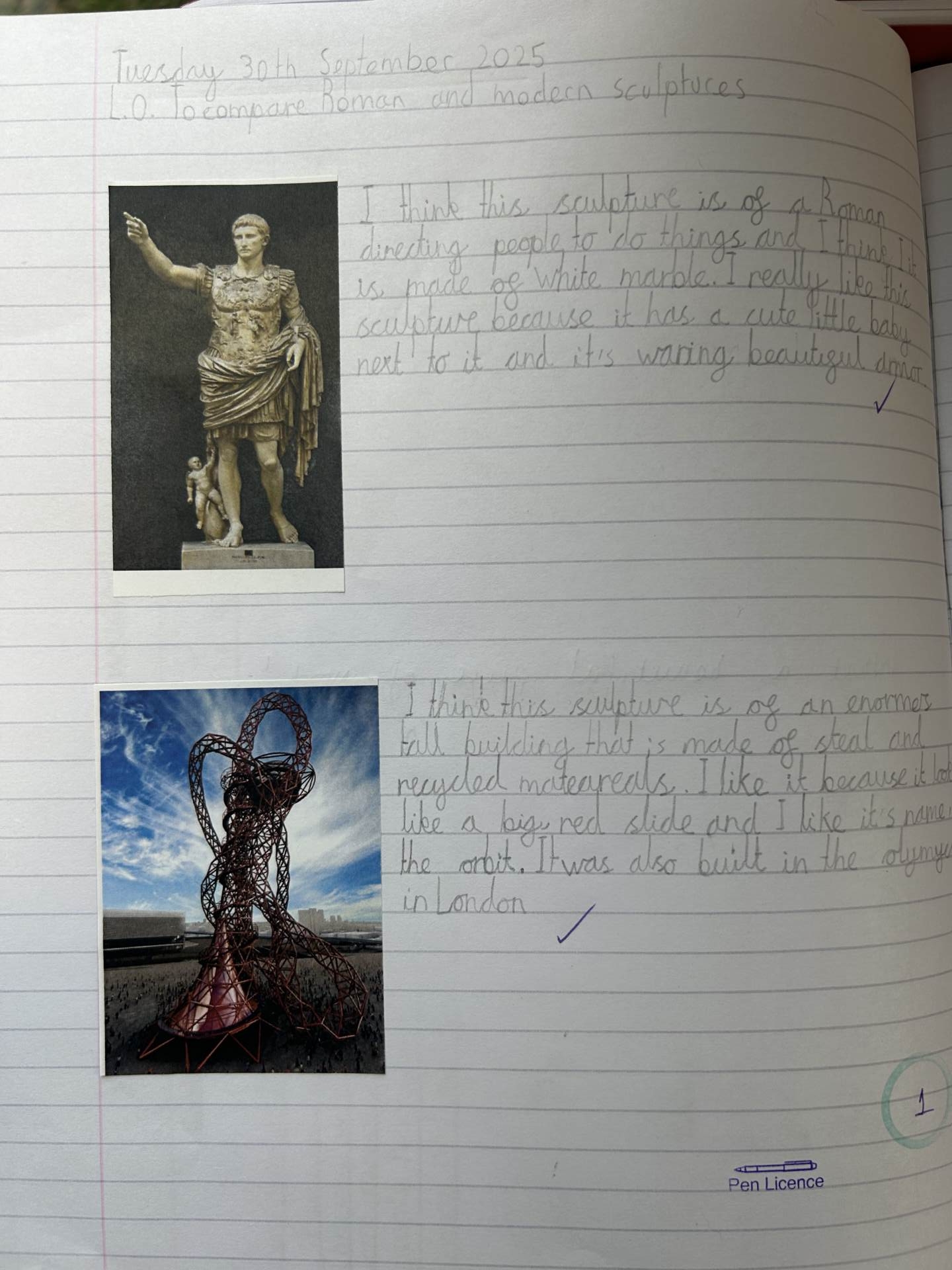 Each year we focus on a different art skill. We ask the children to complete an art objective for example: draw the human body. We then teach age appropriate skills to develop their skills and knowledge of that objective (body proportions, hatching and cross hatching, shadow edging).