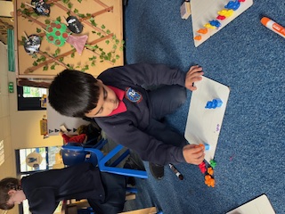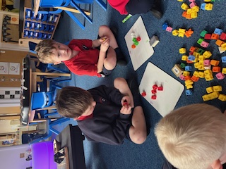 We then moved on to exploring composition, thinking about the different ways each number can be made. The children used practical resources to build the numbers and discussed their ideas with their peers, beginning to use simple mathematical language to explain their choices.