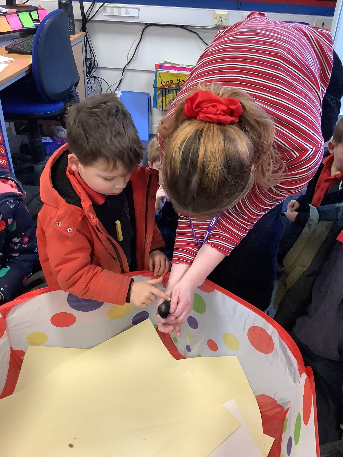 The children have enjoyed the responsibility of taking care of our chicks and they have ensured that they are warm and have enough food and clean water to drink. They've also enjoyed a great number of cuddles too! We have loved having the chicks in our classroom and will definitely miss them next week!