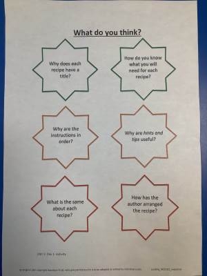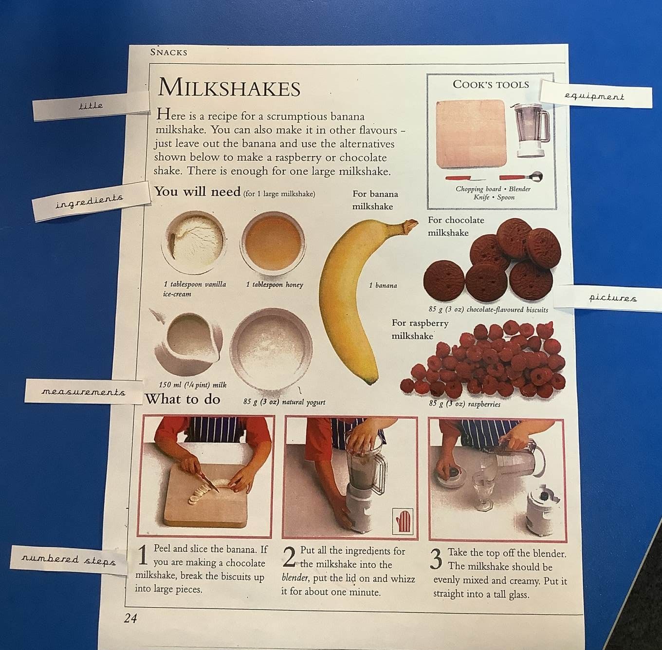 For our new English unit we are looking at instructions. We explored a variety of recipes to see what they all had in common. We answered some key questions in partners and then discussed our answers as a whole class.