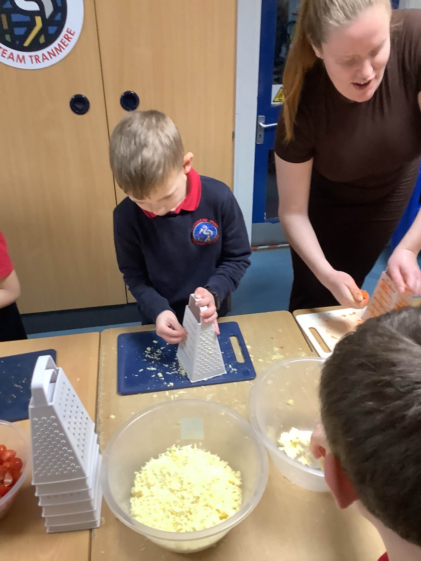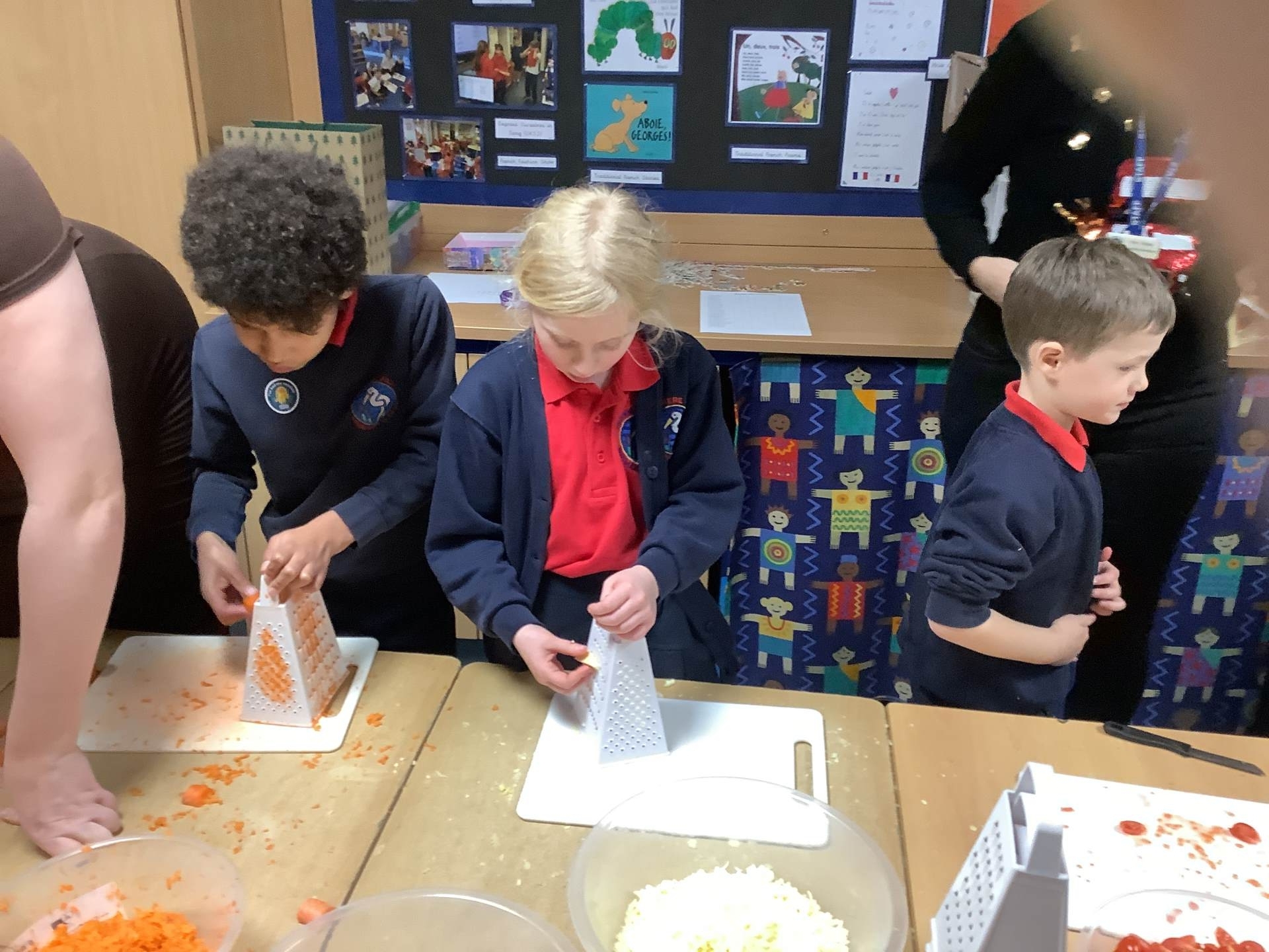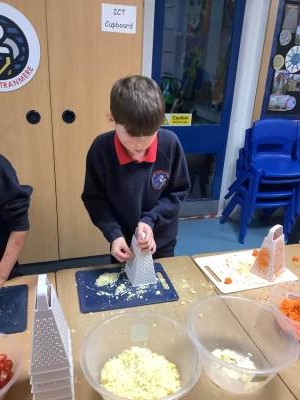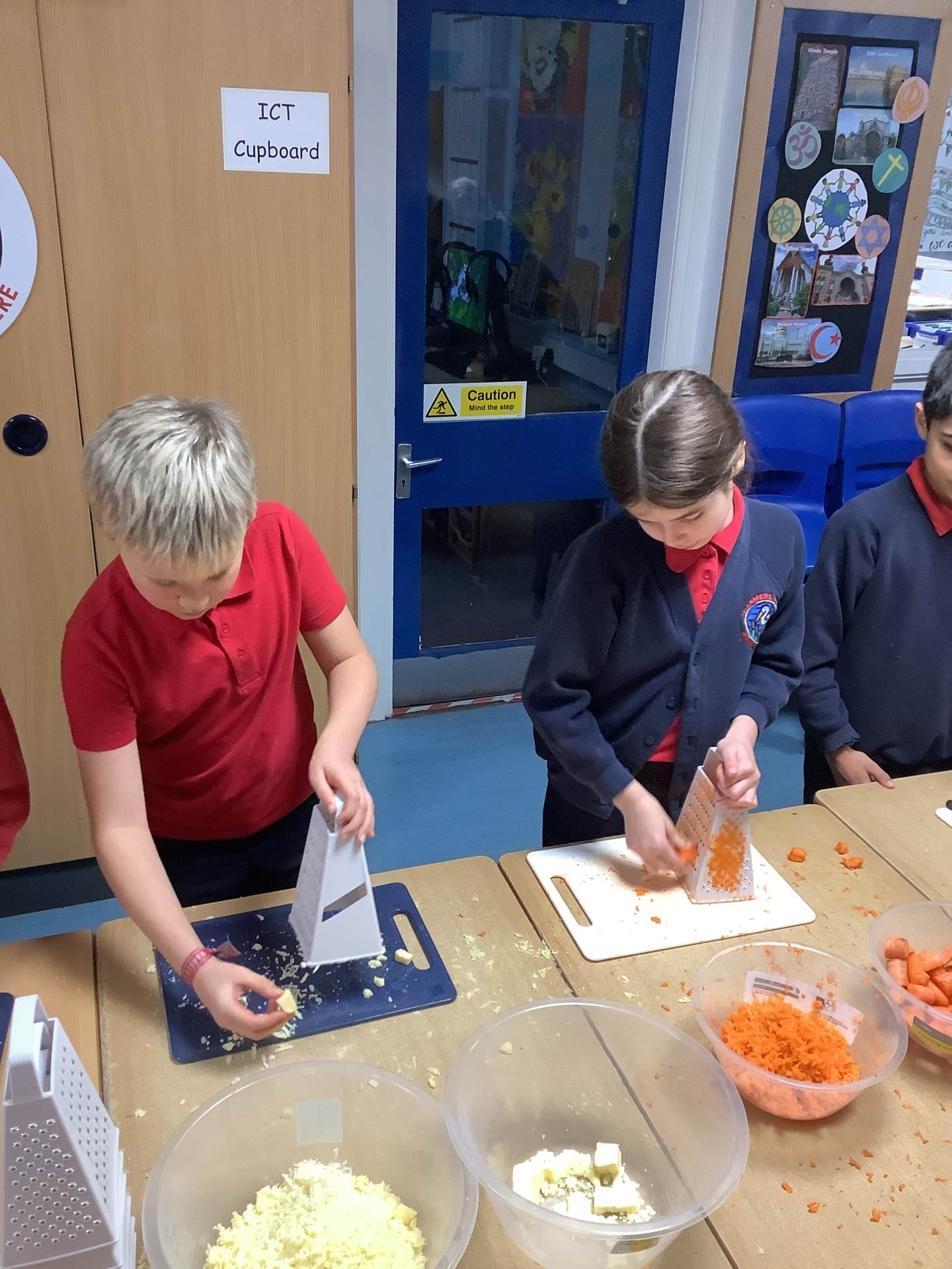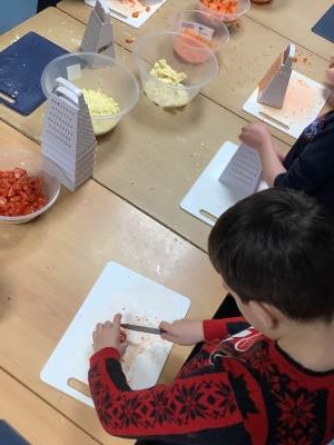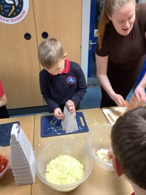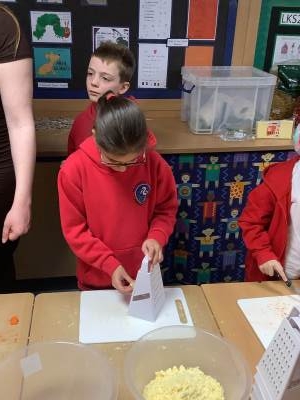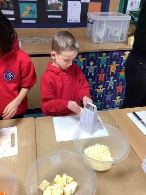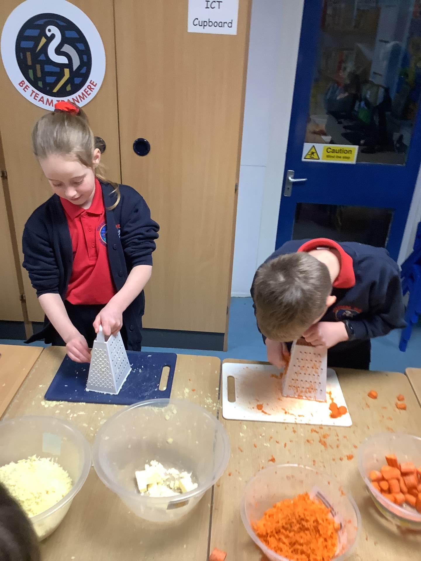 On Wednesday, Lower Key Stage Two made their own healthy pasta bake - it was packed with vegetables! To make it, we boiled pasta, grated cheese and carrot, chopped peppers and tomatoes, snipped spring onions and basil. We then added our own tomato sauce and mixed it all together. Once done, we baked it in the oven and our pasta bake was finished! We loved tasting it at home. Have a look at how much fun we had when we created it!
