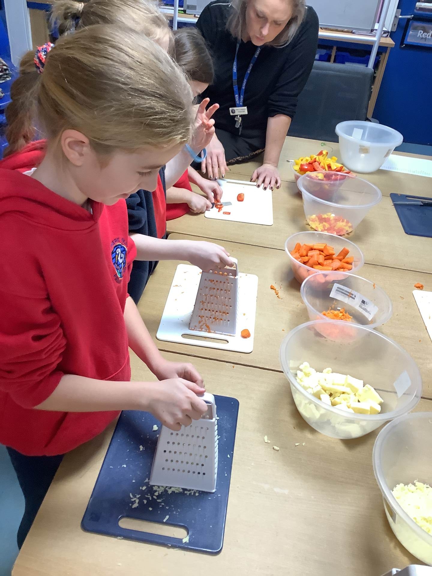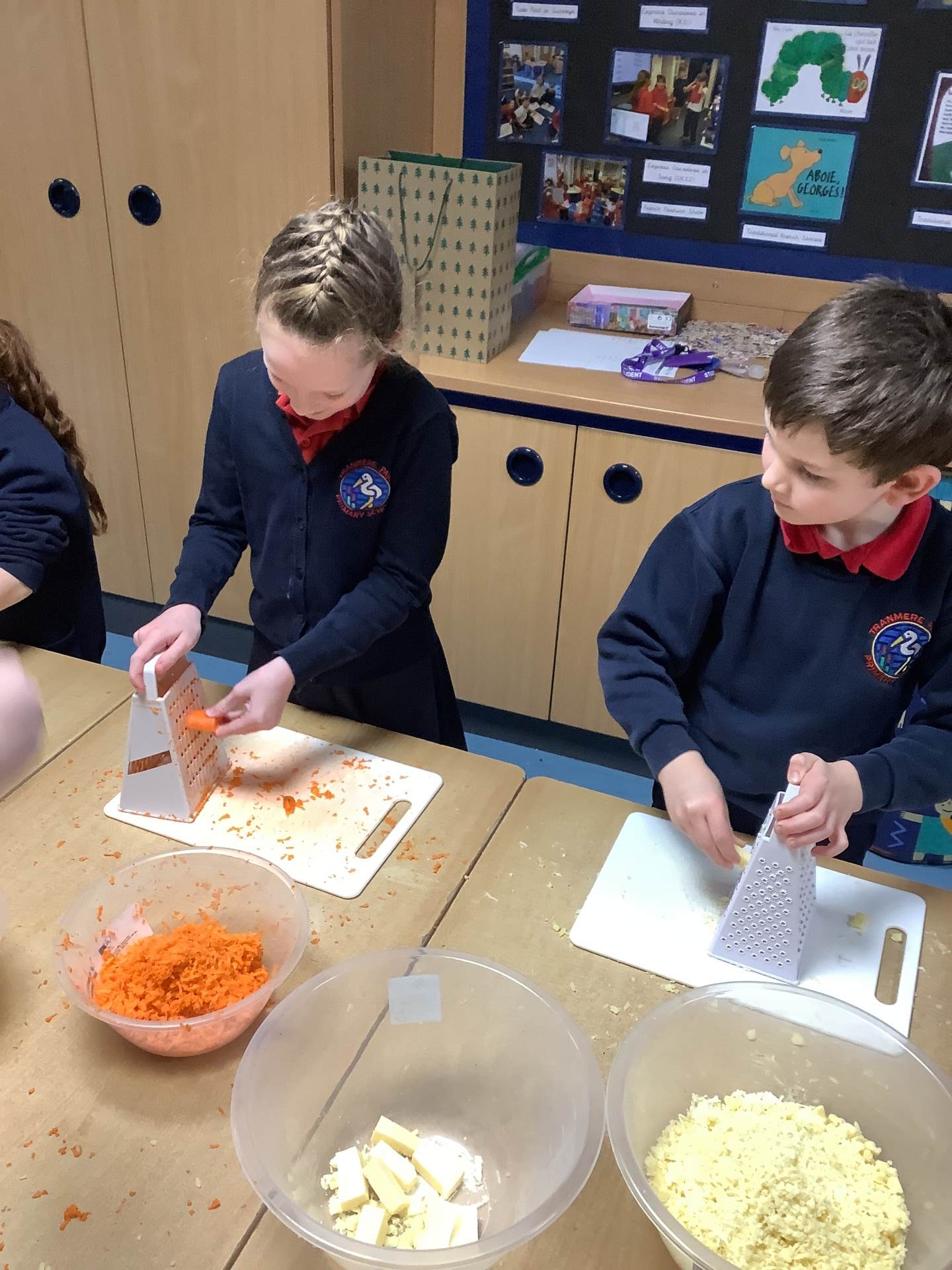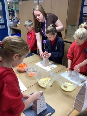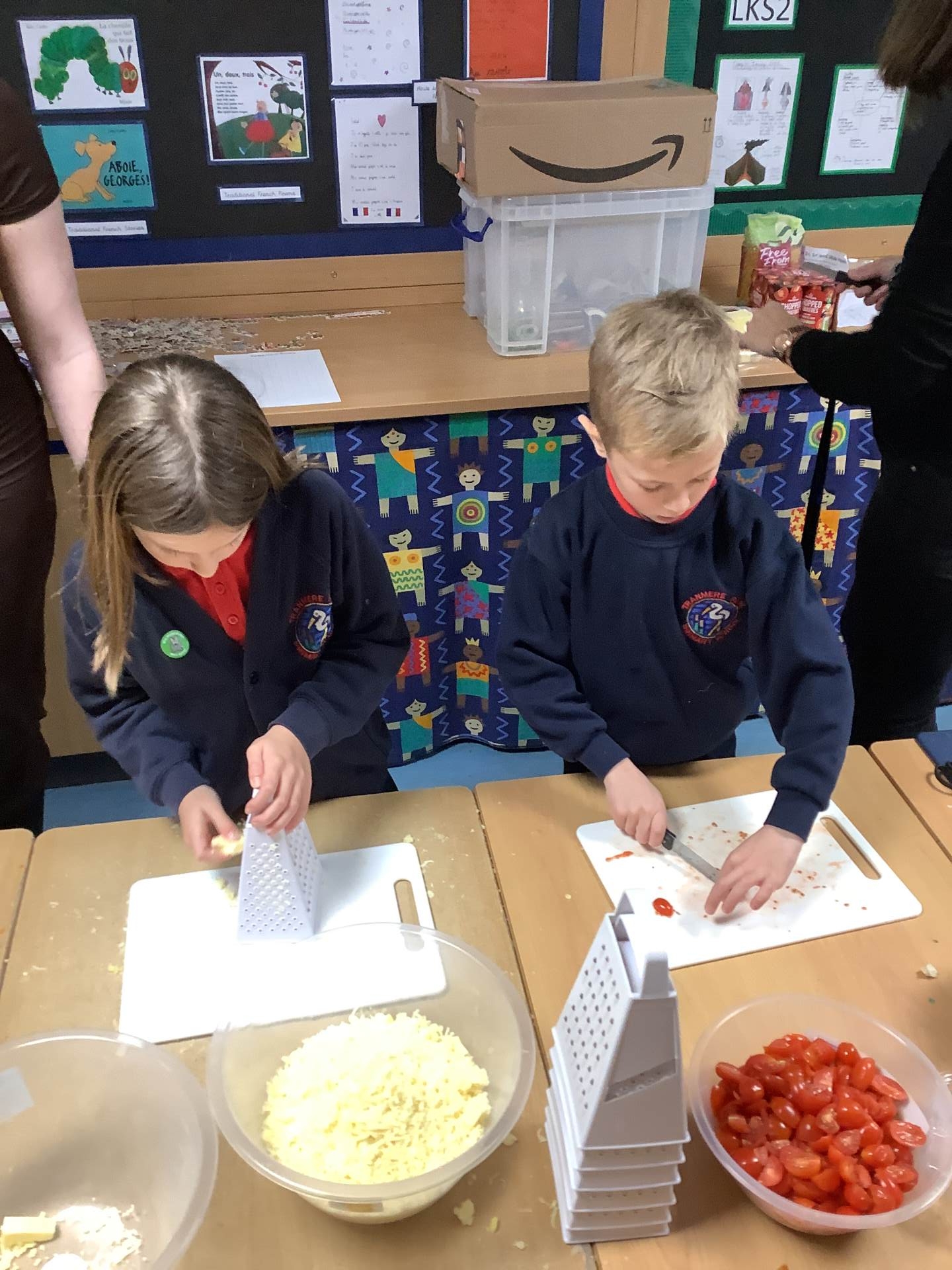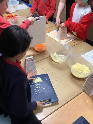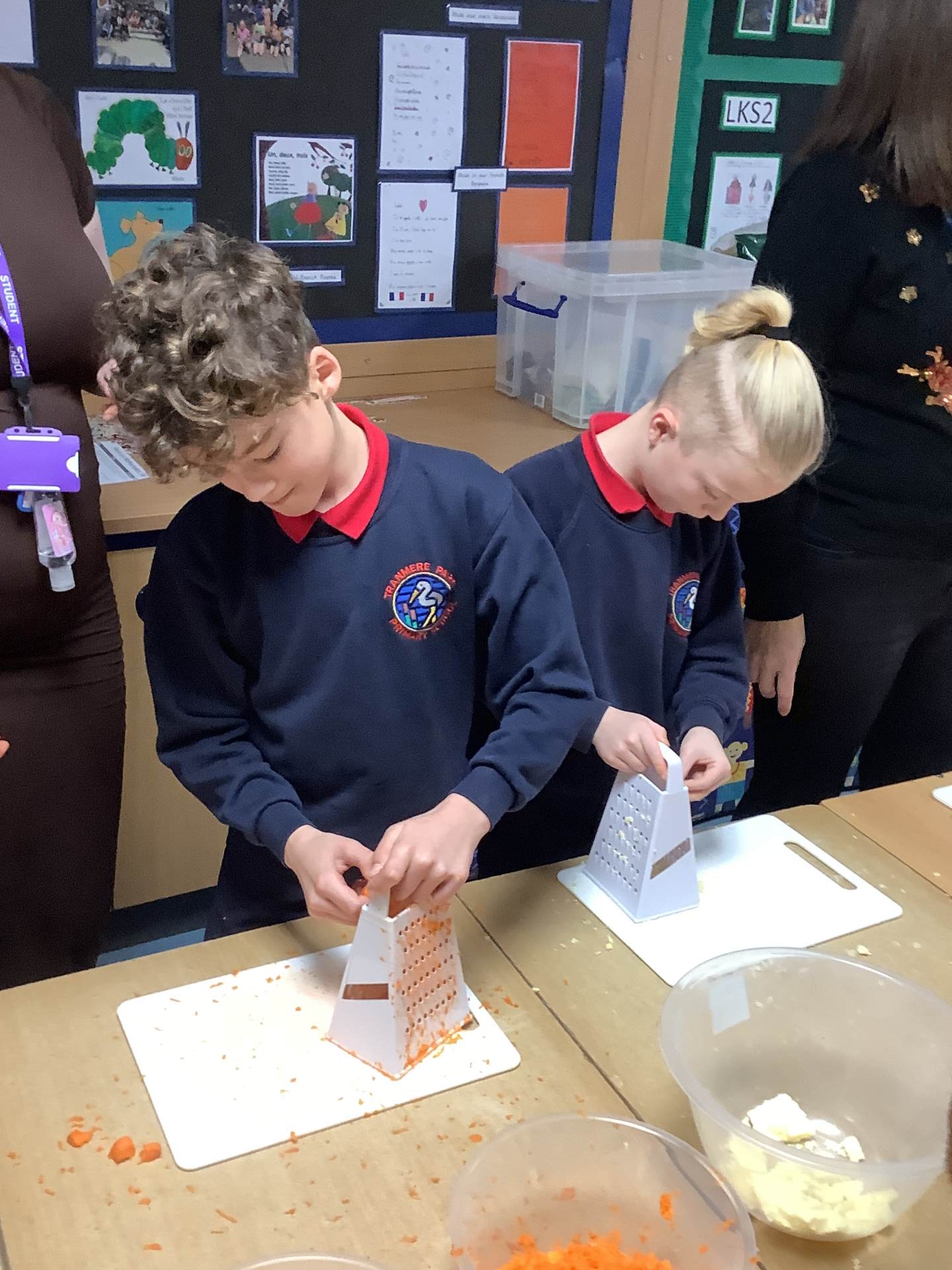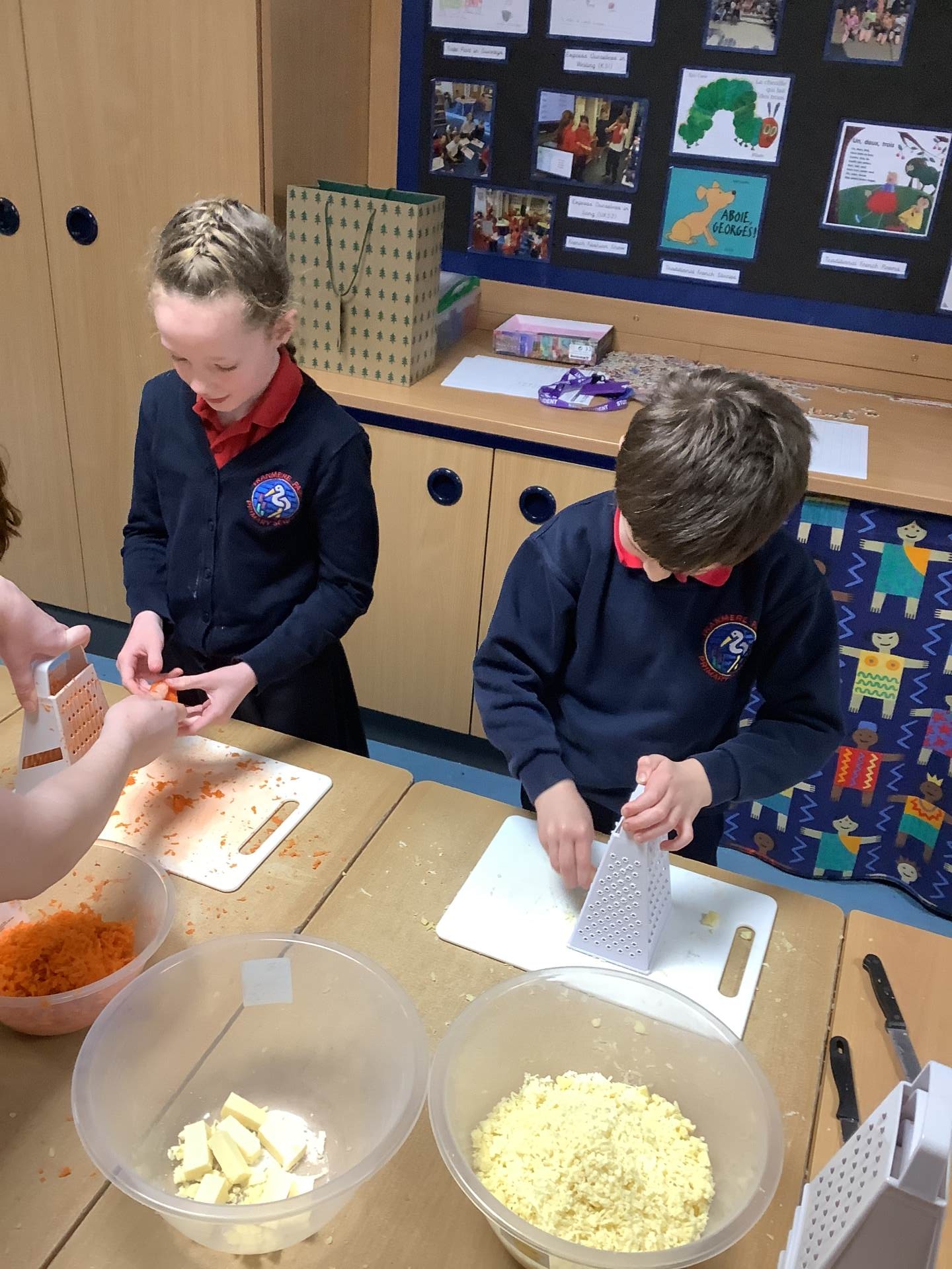 On Wednesday, Lower Key Stage Two made their own healthy pasta bake - it was packed with vegetables! To make it, we boiled pasta, grated cheese and carrot, chopped peppers and tomatoes, snipped spring onions and basil. We then added our own tomato sauce and mixed it all together. Once done, we baked it in the oven and our pasta bake was finished! We loved tasting it at home. Have a look at how much fun we had when we created it!