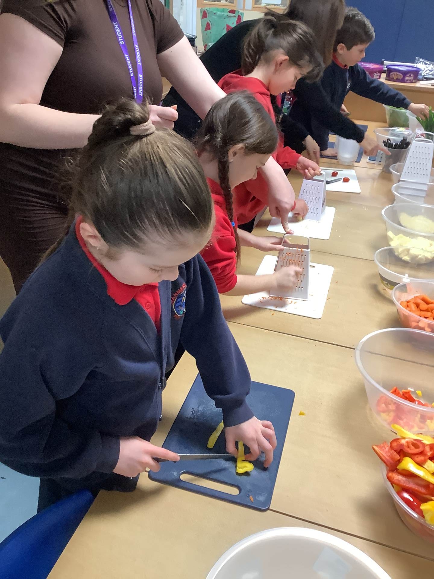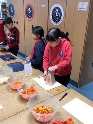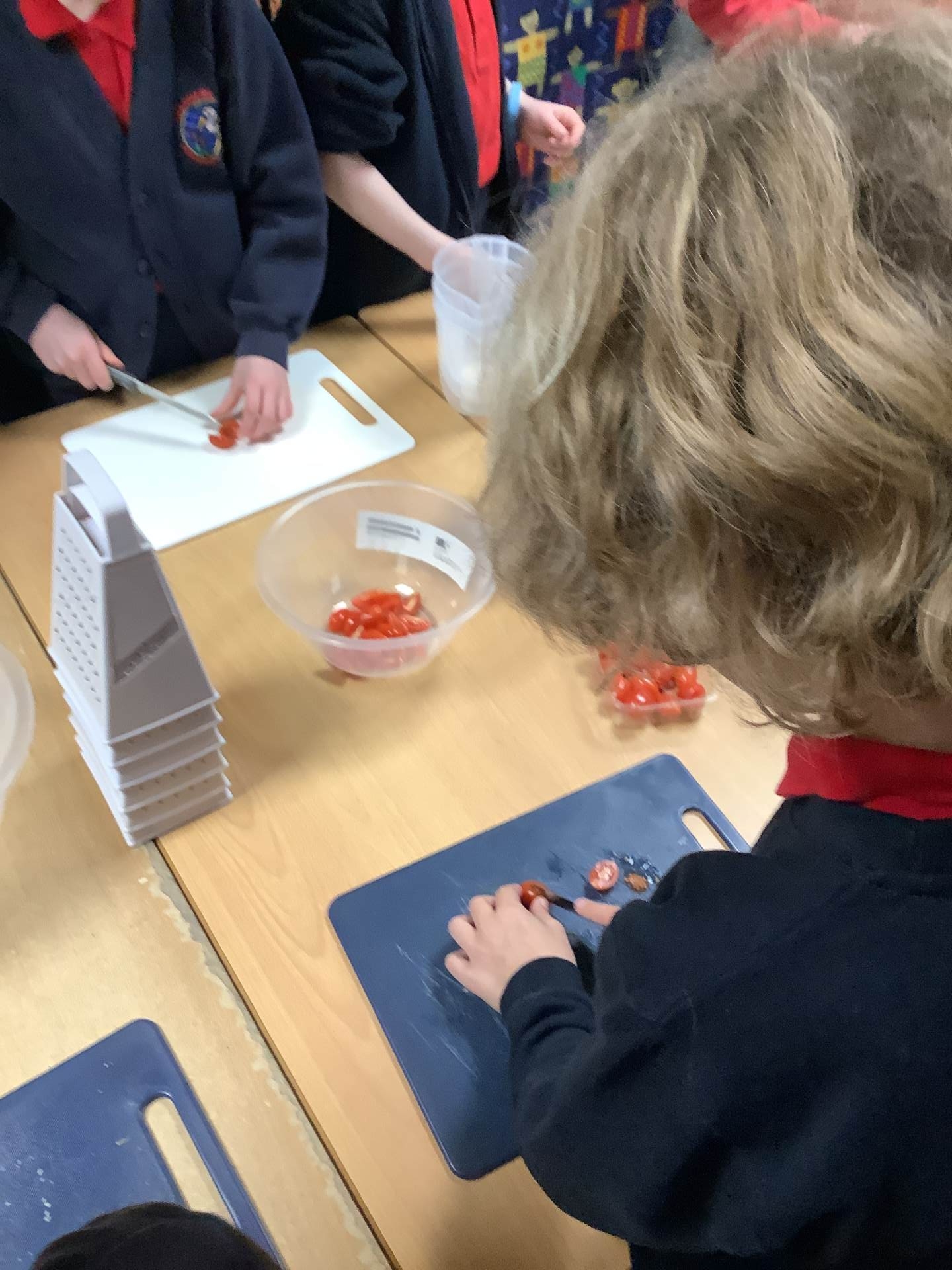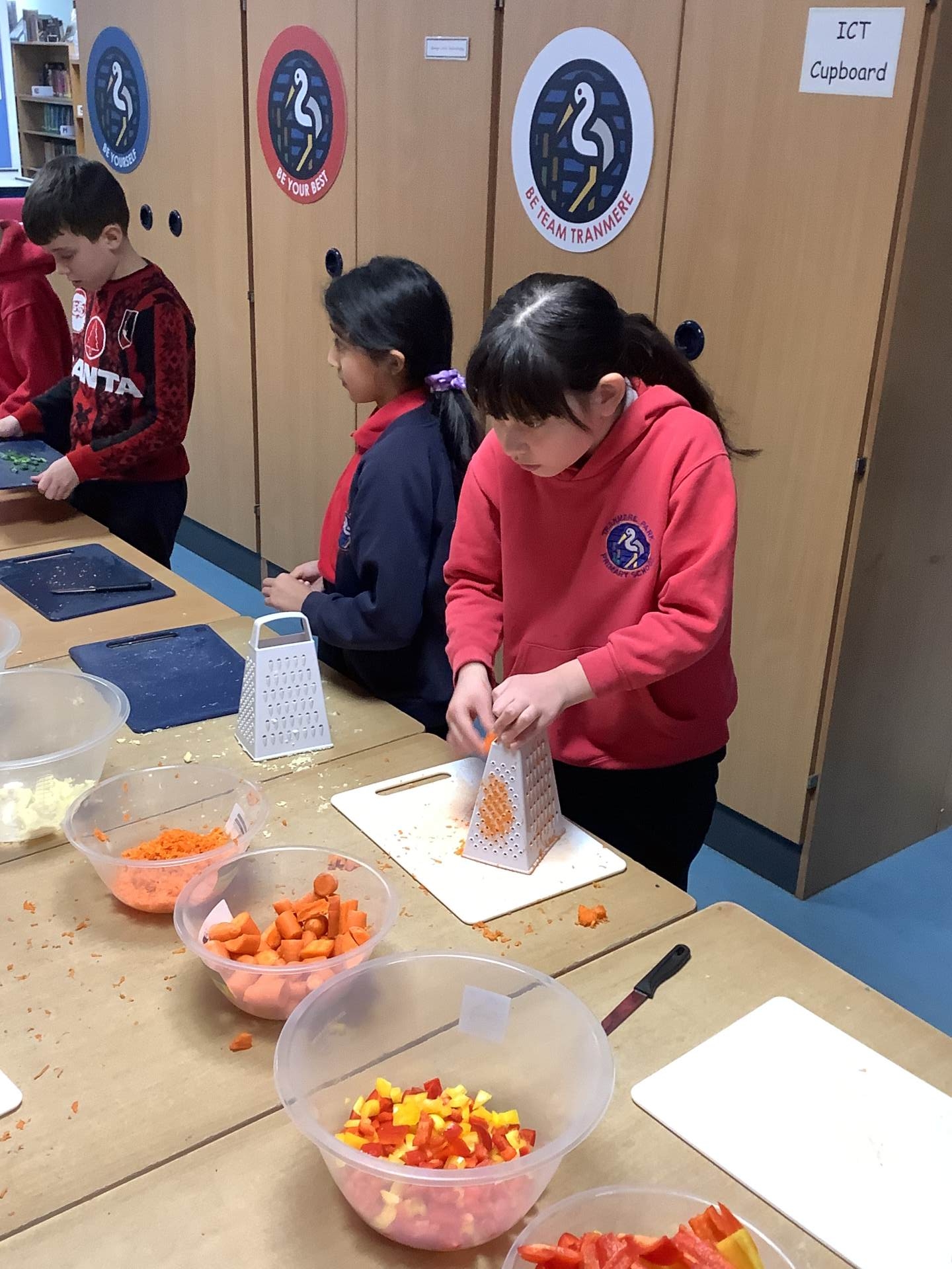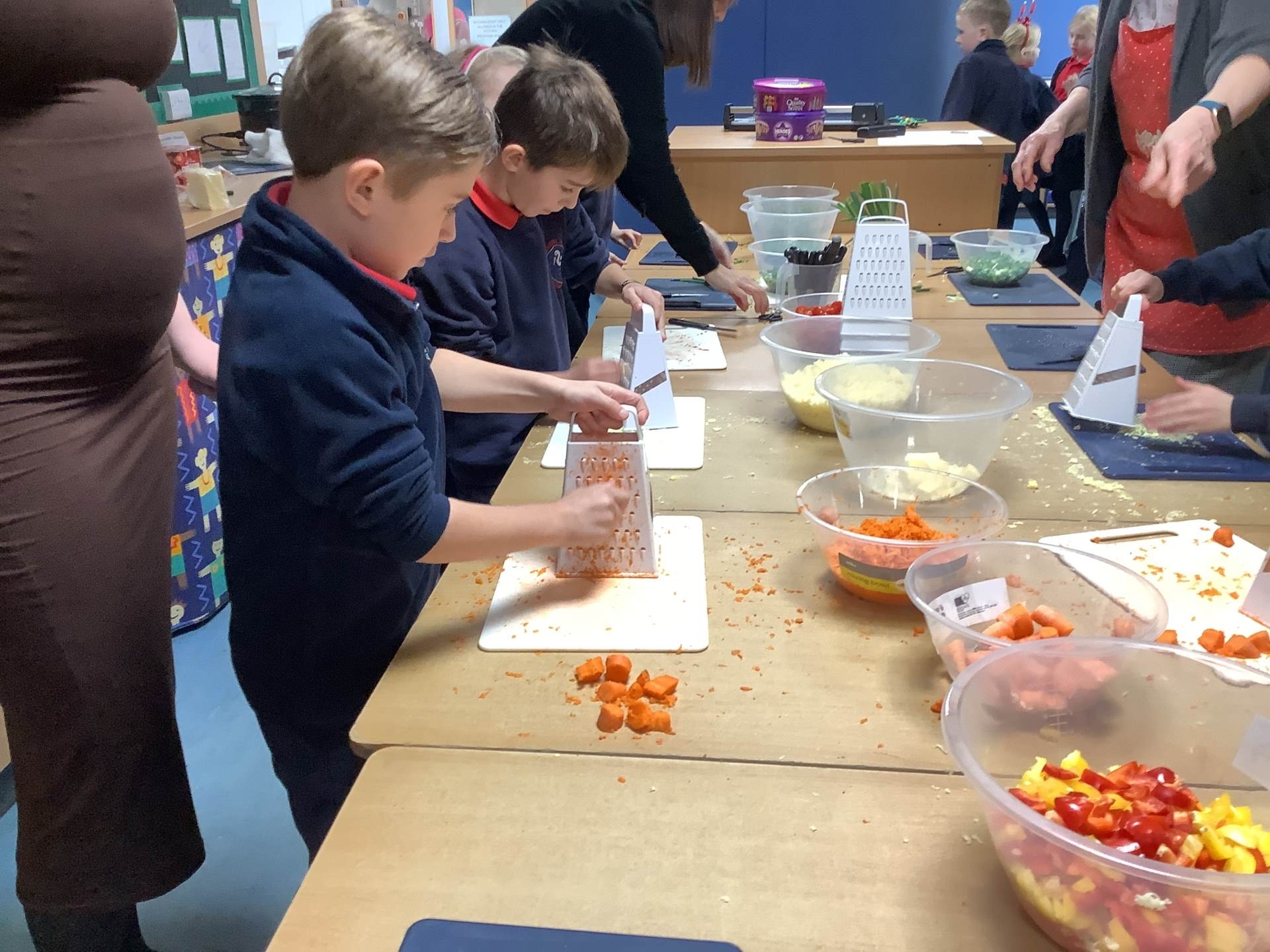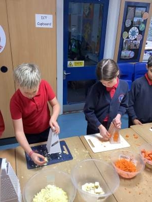 On Wednesday, Lower Key Stage Two made their own healthy pasta bake - it was packed with vegetables! To make it, we boiled pasta, grated cheese and carrot, chopped peppers and tomatoes, snipped spring onions and basil. We then added our own tomato sauce and mixed it all together. Once done, we baked it in the oven and our pasta bake was finished! We loved tasting it at home. Have a look at how much fun we had when we created it!