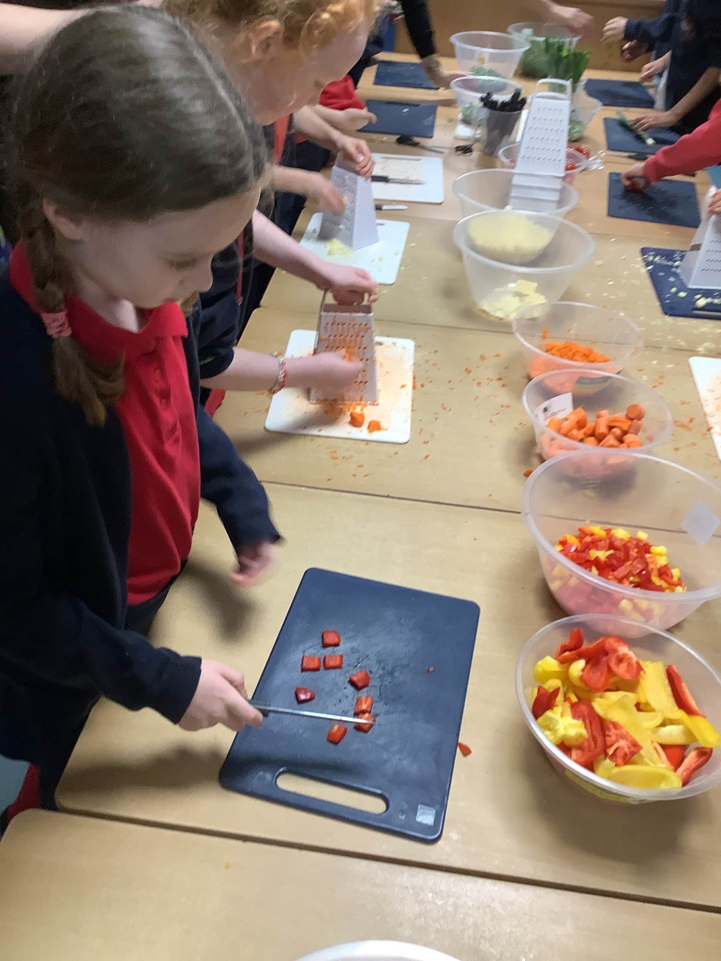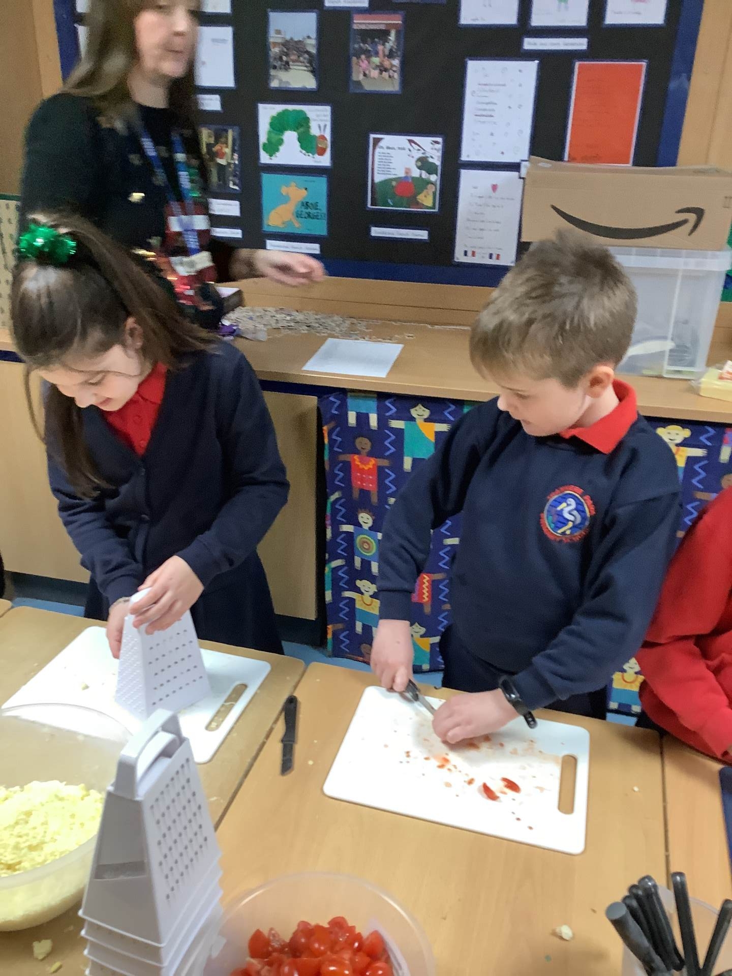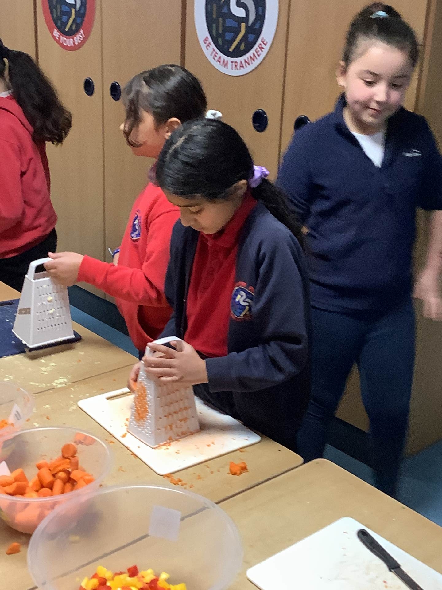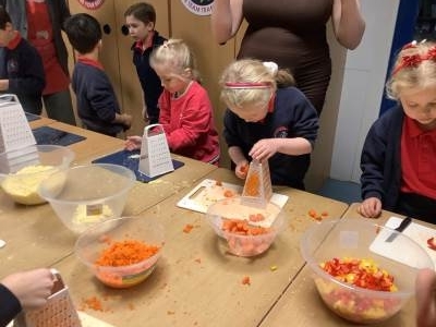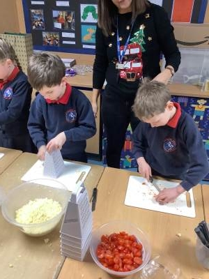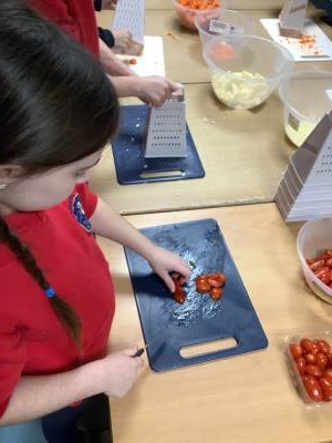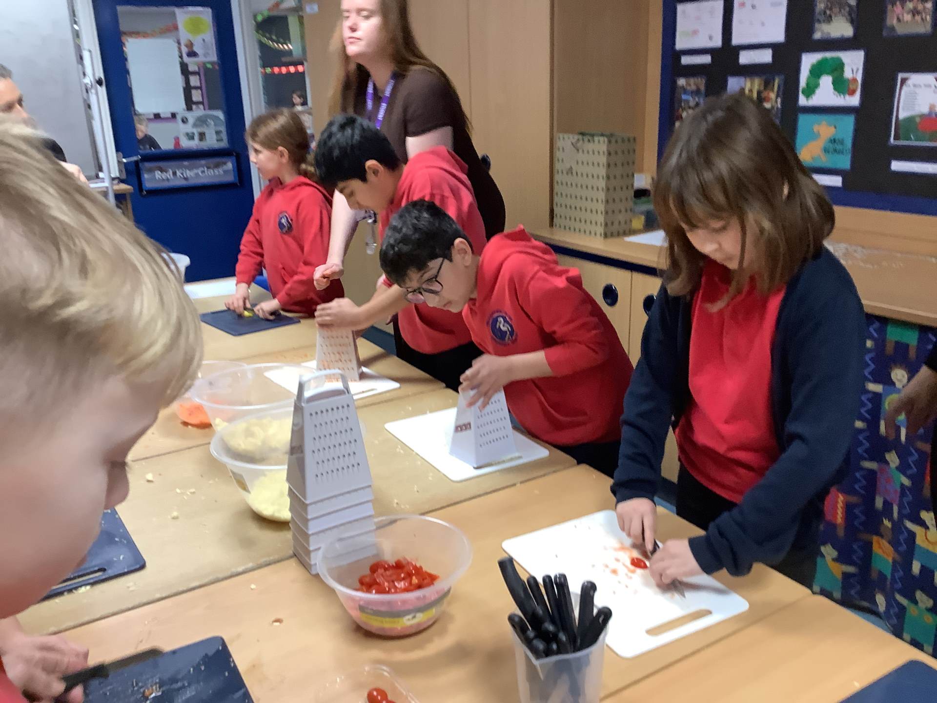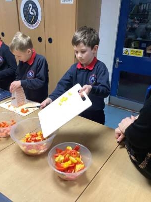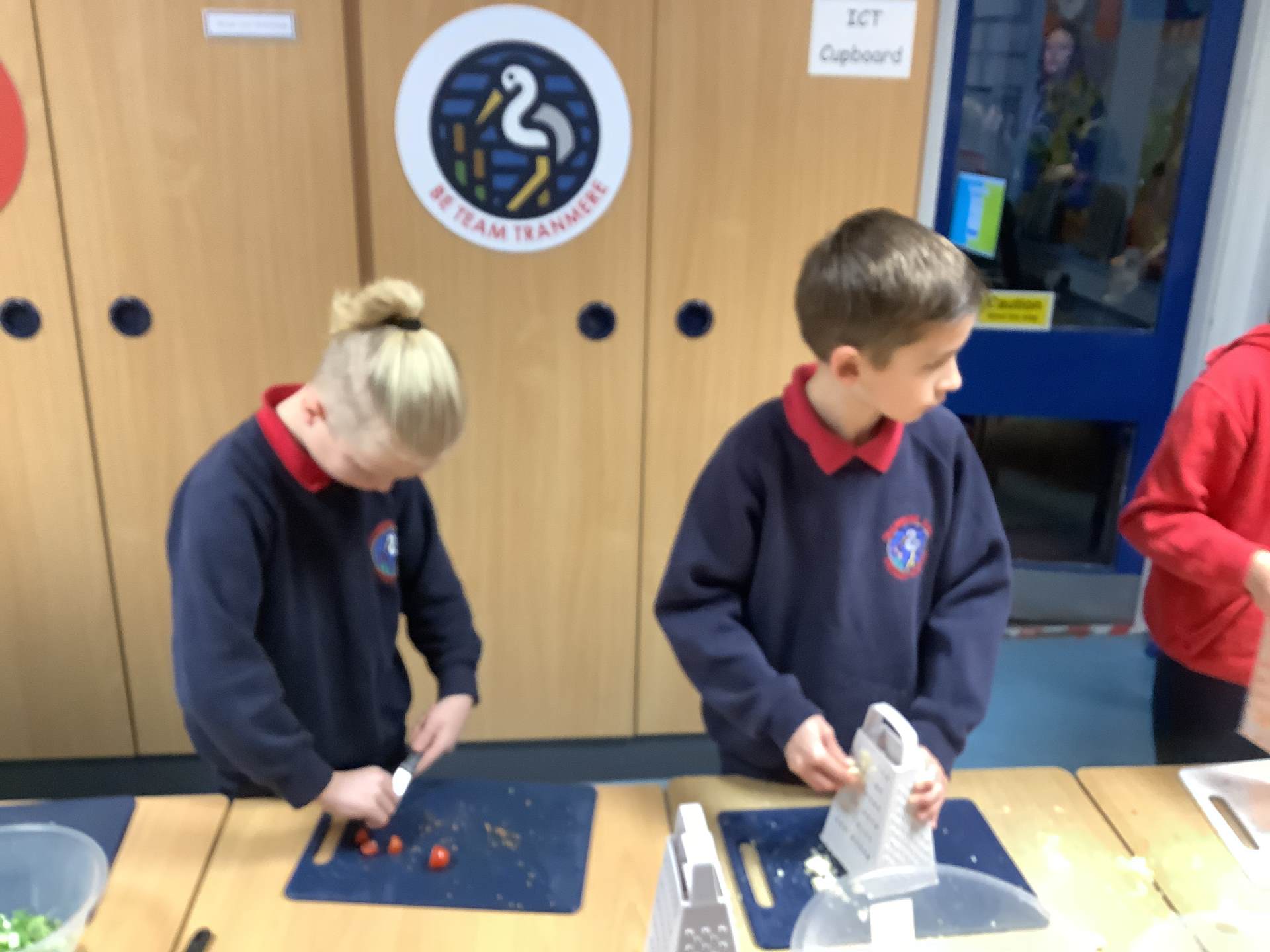 On Wednesday, Lower Key Stage Two made their own healthy pasta bake - it was packed with vegetables! To make it, we boiled pasta, grated cheese and carrot, chopped peppers and tomatoes, snipped spring onions and basil. We then added our own tomato sauce and mixed it all together. Once done, we baked it in the oven and our pasta bake was finished! We loved tasting it at home. Have a look at how much fun we had when we created it!
