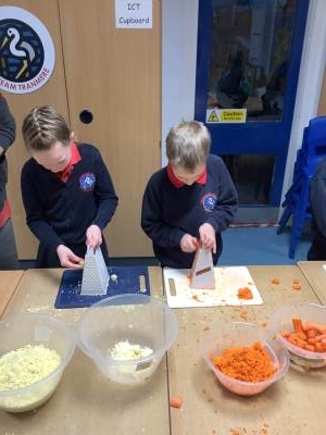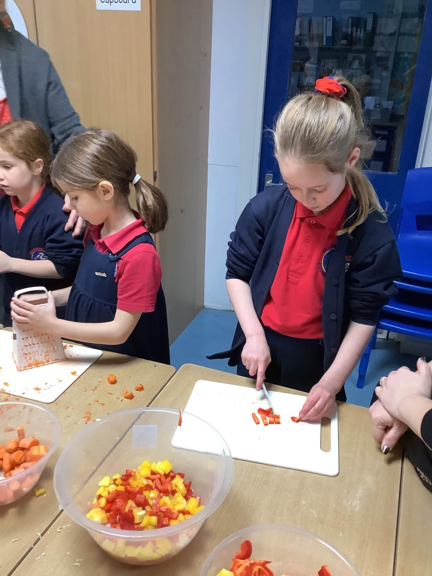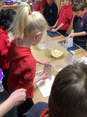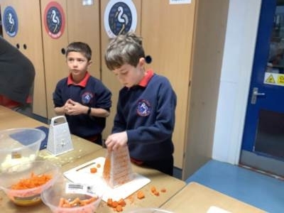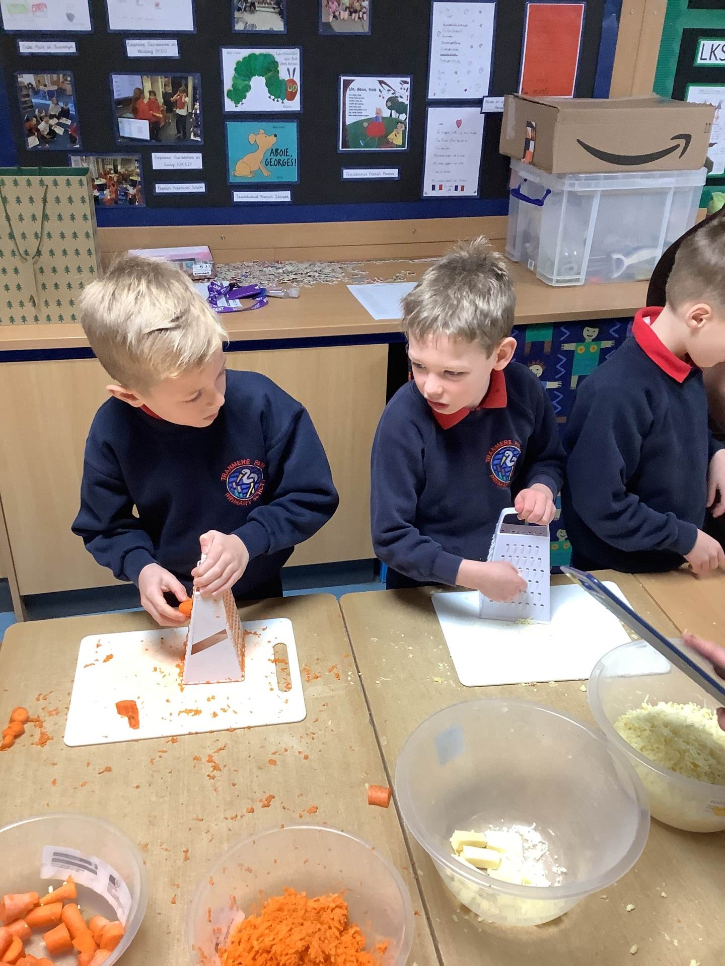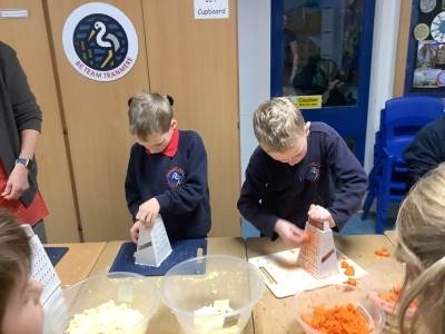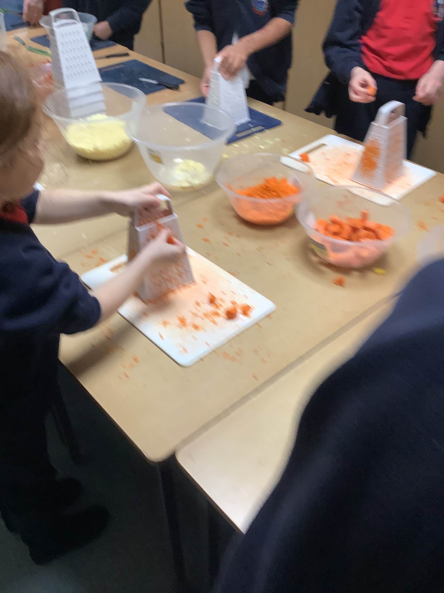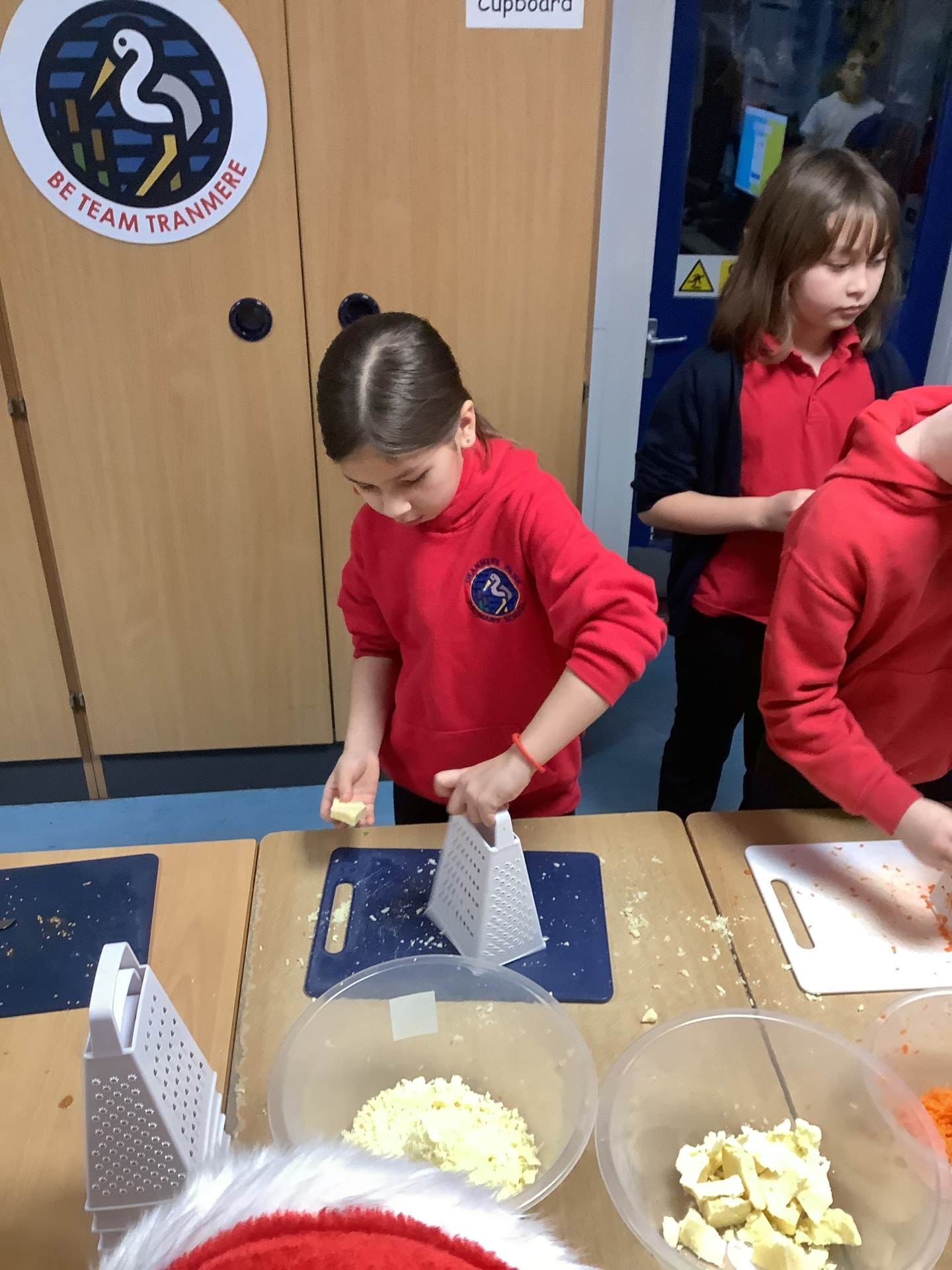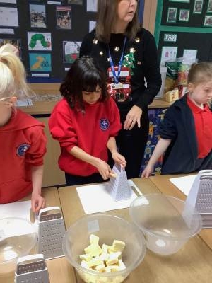 On Wednesday, Lower Key Stage Two made their own healthy pasta bake - it was packed with vegetables! To make it, we boiled pasta, grated cheese and carrot, chopped peppers and tomatoes, snipped spring onions and basil. We then added our own tomato sauce and mixed it all together. Once done, we baked it in the oven and our pasta bake was finished! We loved tasting it at home. Have a look at how much fun we had when we created it!