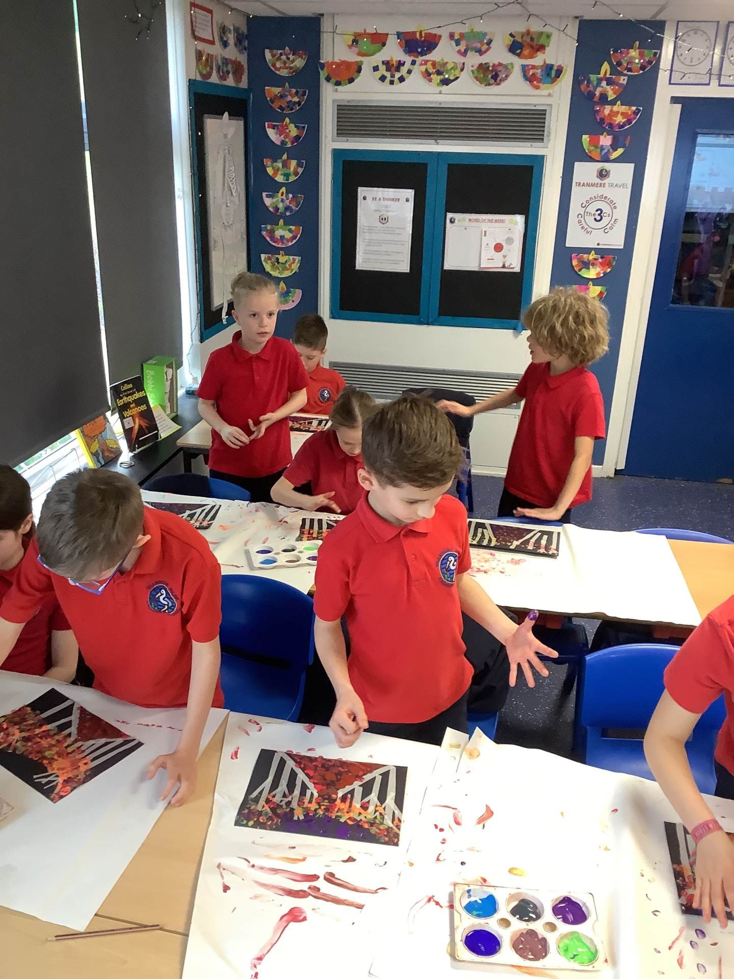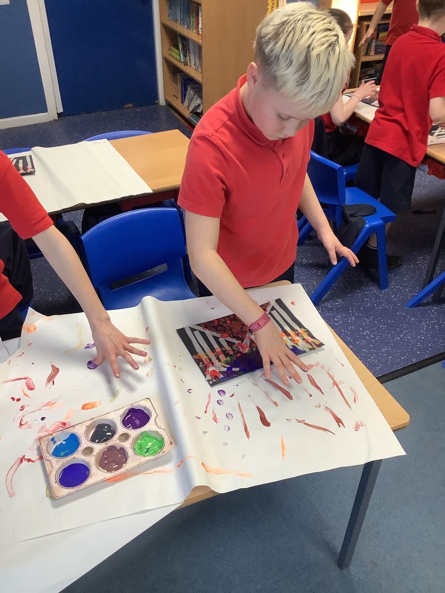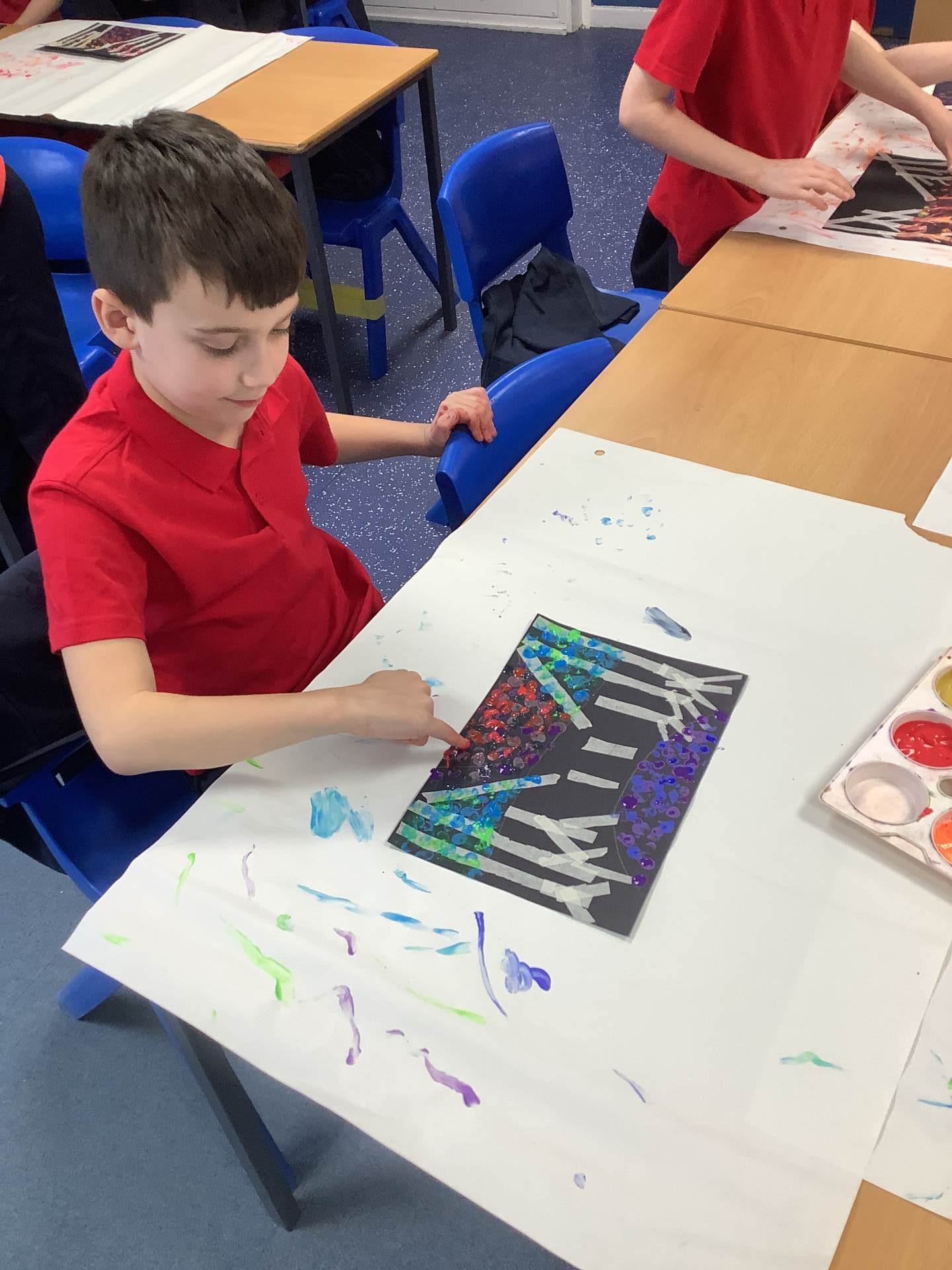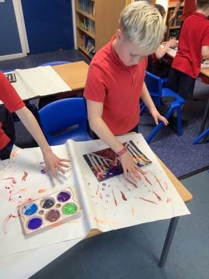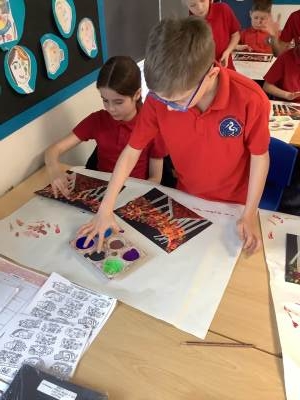 One of the artists we looked at was Leonid Afremov and we loved the colours that he used in his paintings. We decided to have a go and re-create one of his most famous paintings. To do this, we used black card and masking tape to create the background. We then used the paints to mix together the colours. After this, we took the masking tape off and created our finished piece. Have a look at our process - we can't wait to show you our finished creations!