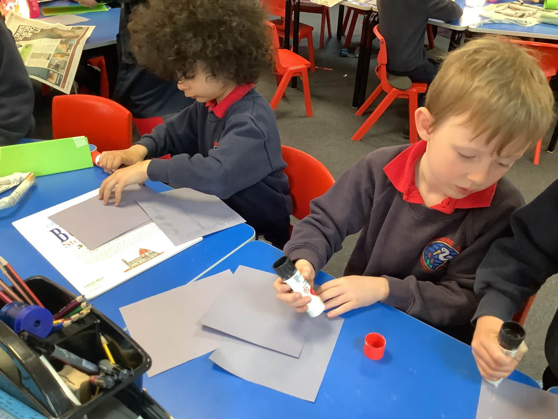 Today, the children practised laminating (layering sheets of paper/card to make it stronger), rolling, shaping (cylinders and triangular prisms are strong shapes) and we also used struts to turn squares into triangles, as triangles are stronger than squares. The children will be utilising these techniques when designing their towers this week.