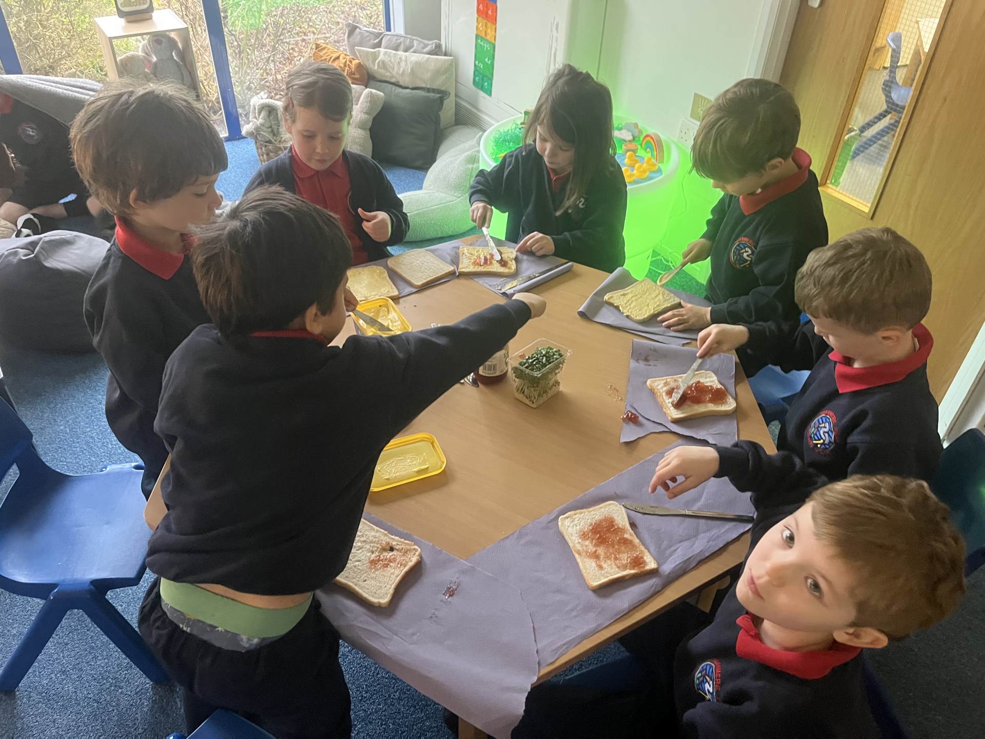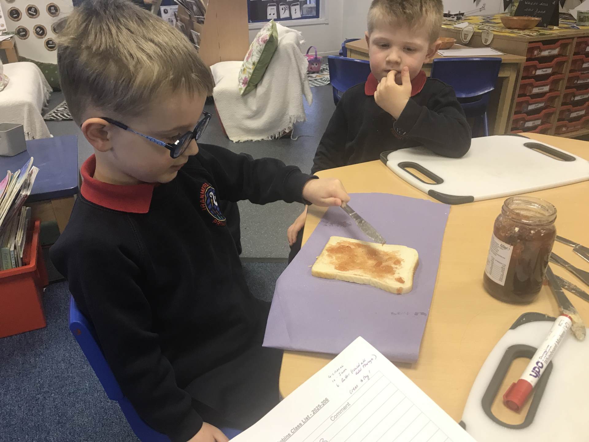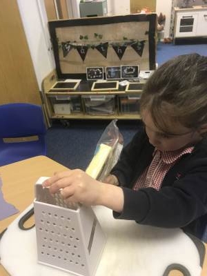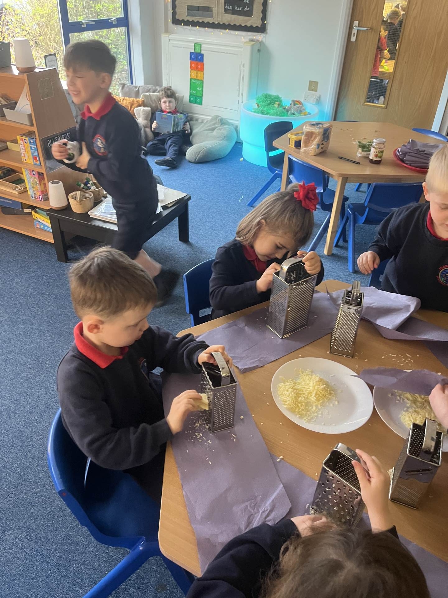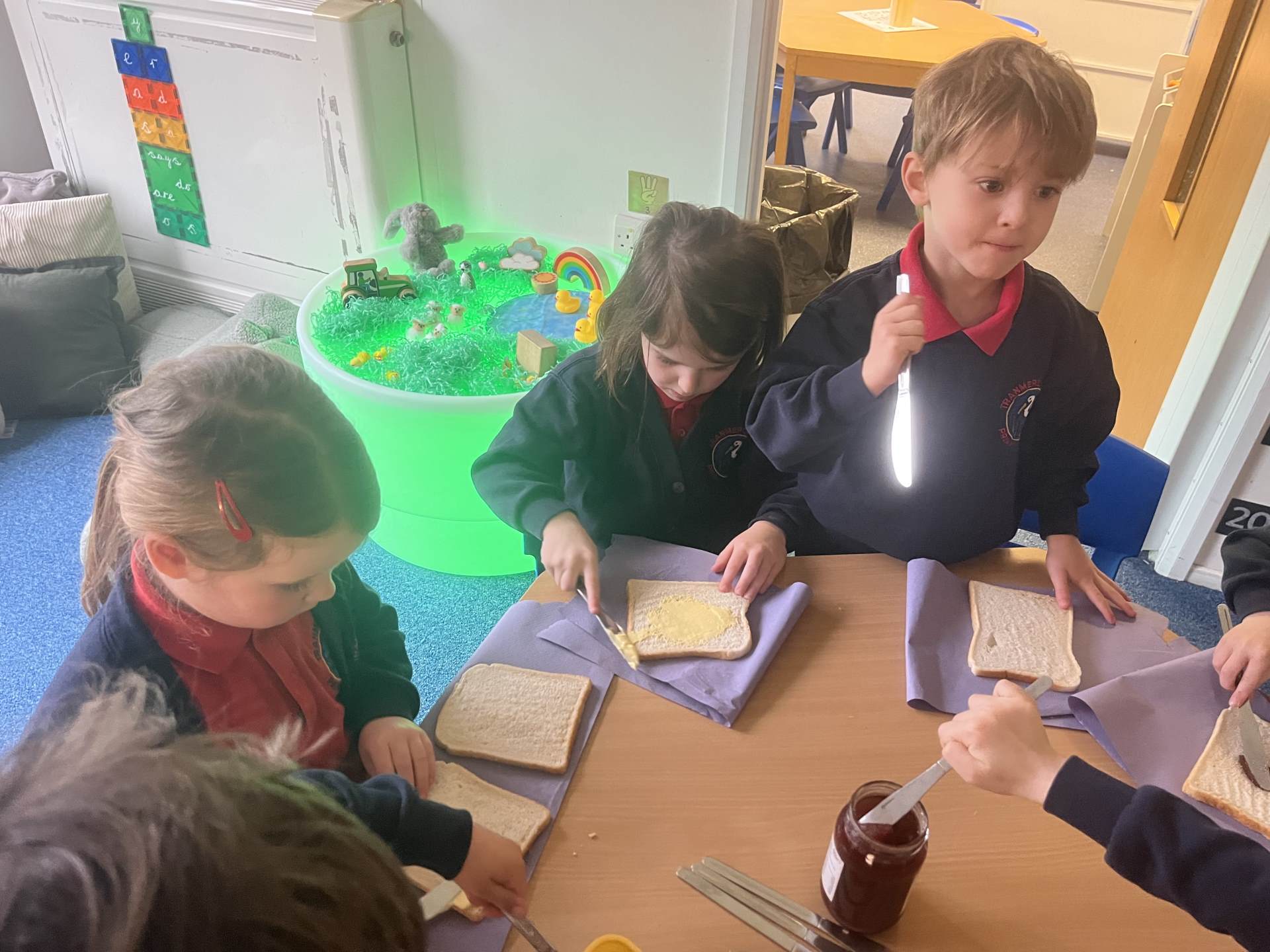 In the morning, the children helped to prepare their own snacks, practising important skills such as spreading, cutting, grating, tearing, sprinkling and making choices about what they would like to eat. This linked closely to our learning about where food comes from and how we prepare it.