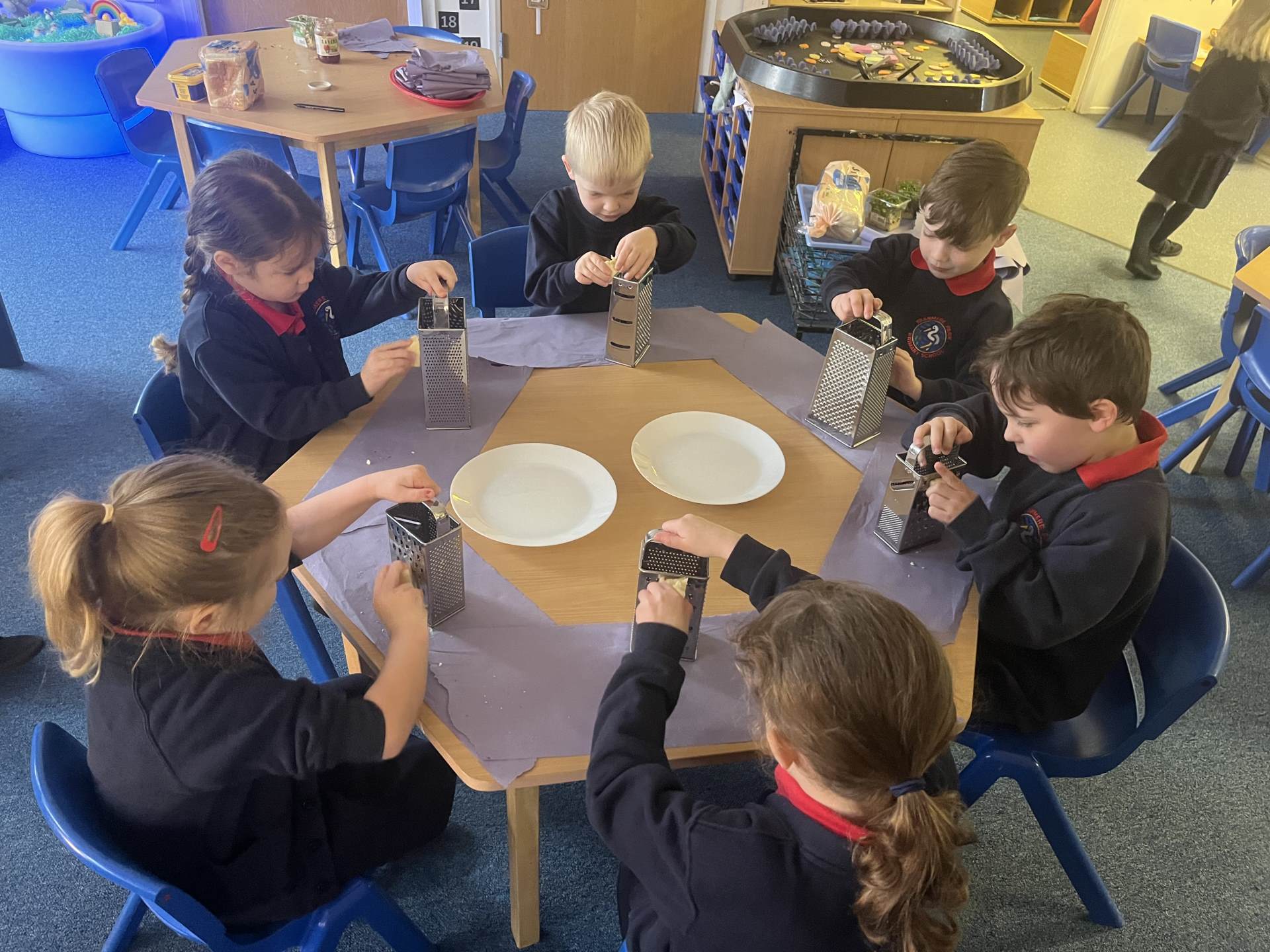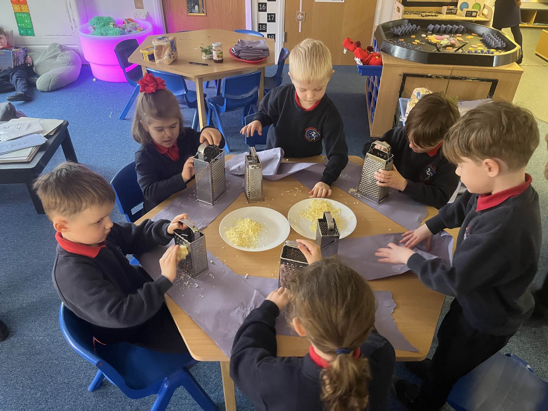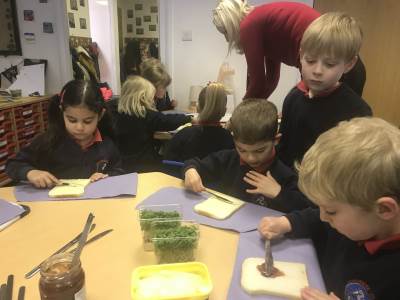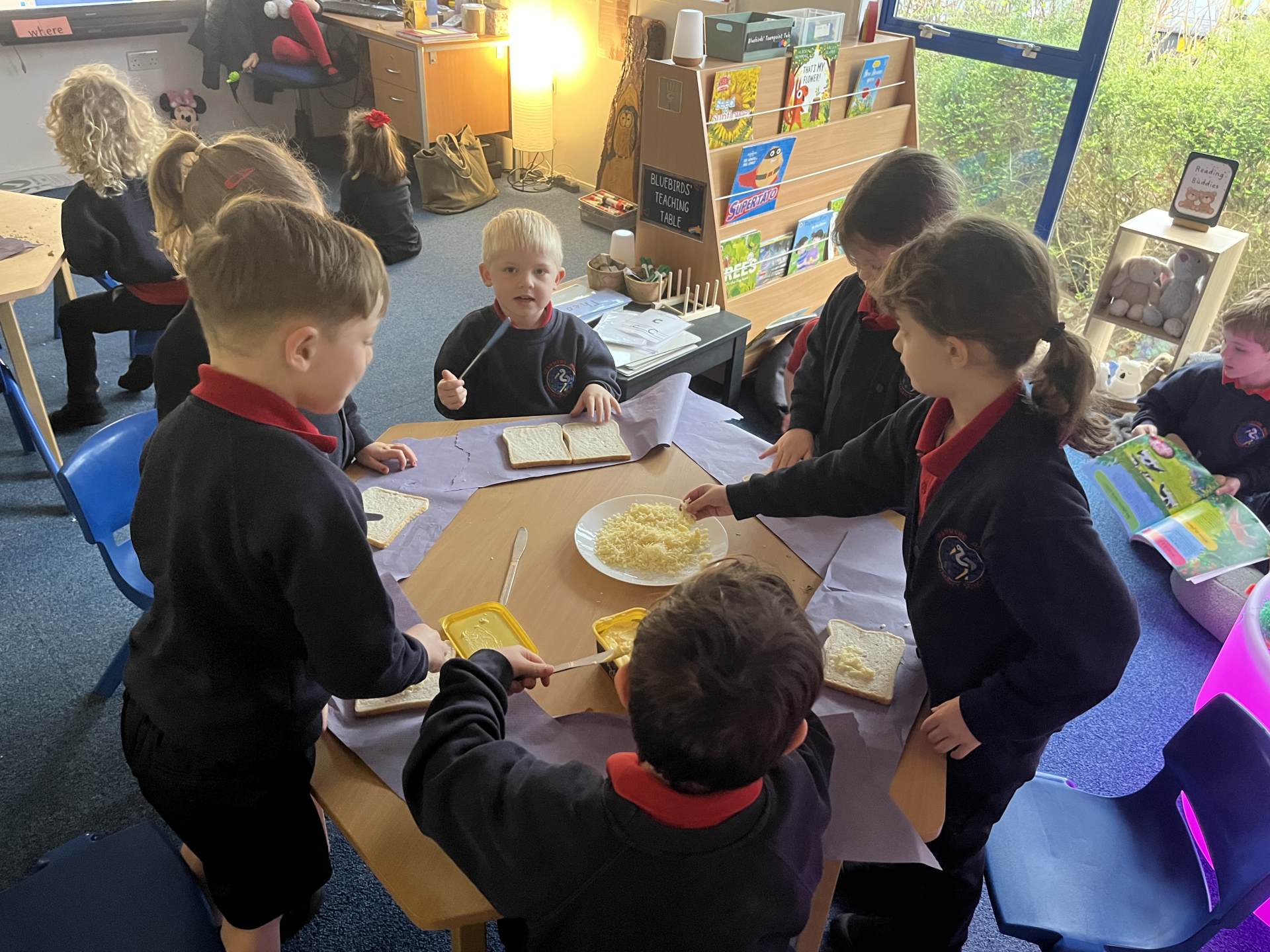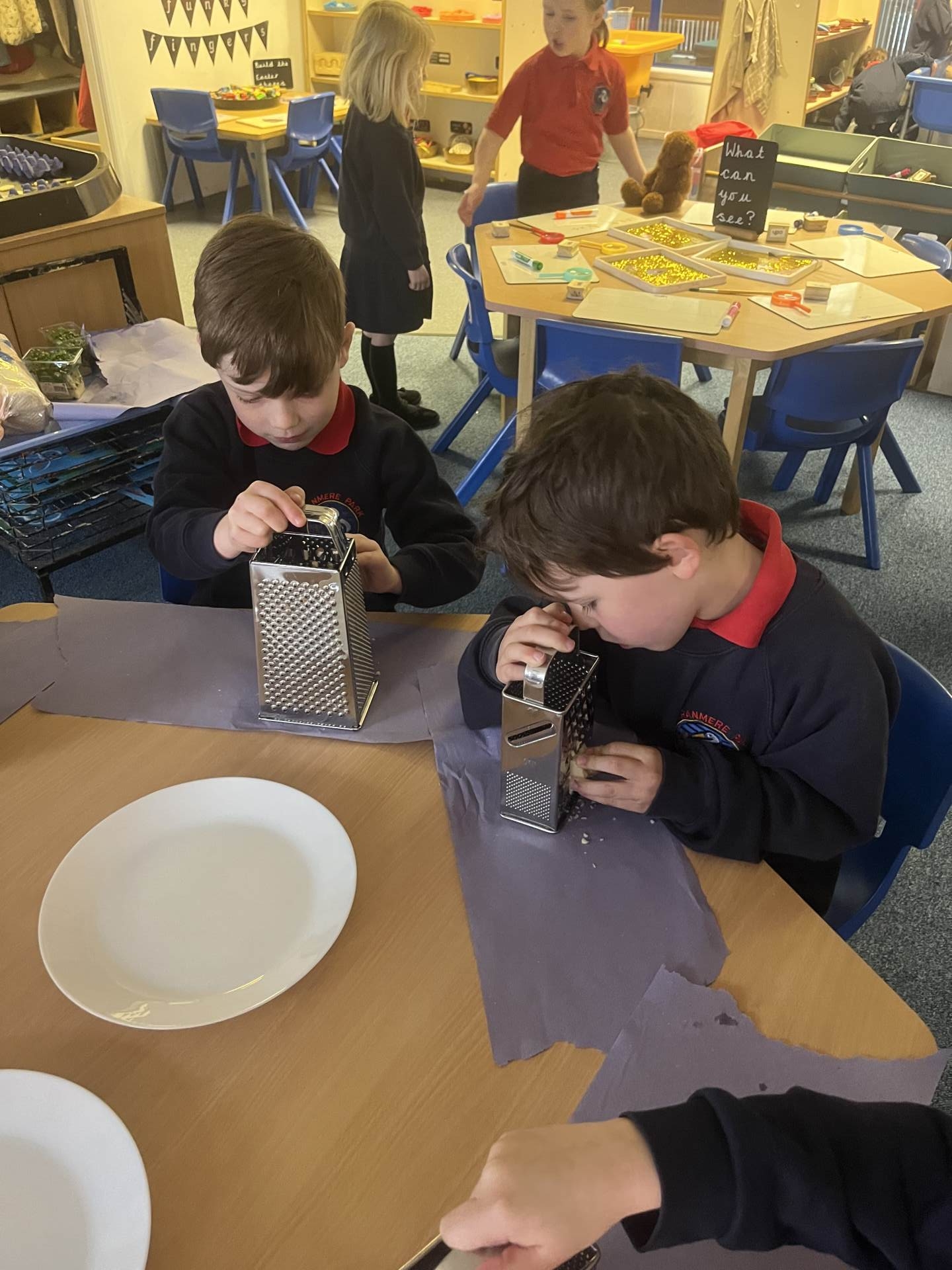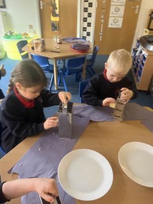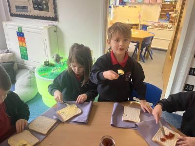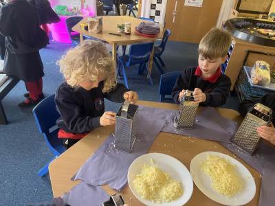 In the morning, the children helped to prepare their own snacks, practising important skills such as spreading, cutting, grating, tearing, sprinkling and making choices about what they would like to eat. This linked closely to our learning about where food comes from and how we prepare it.