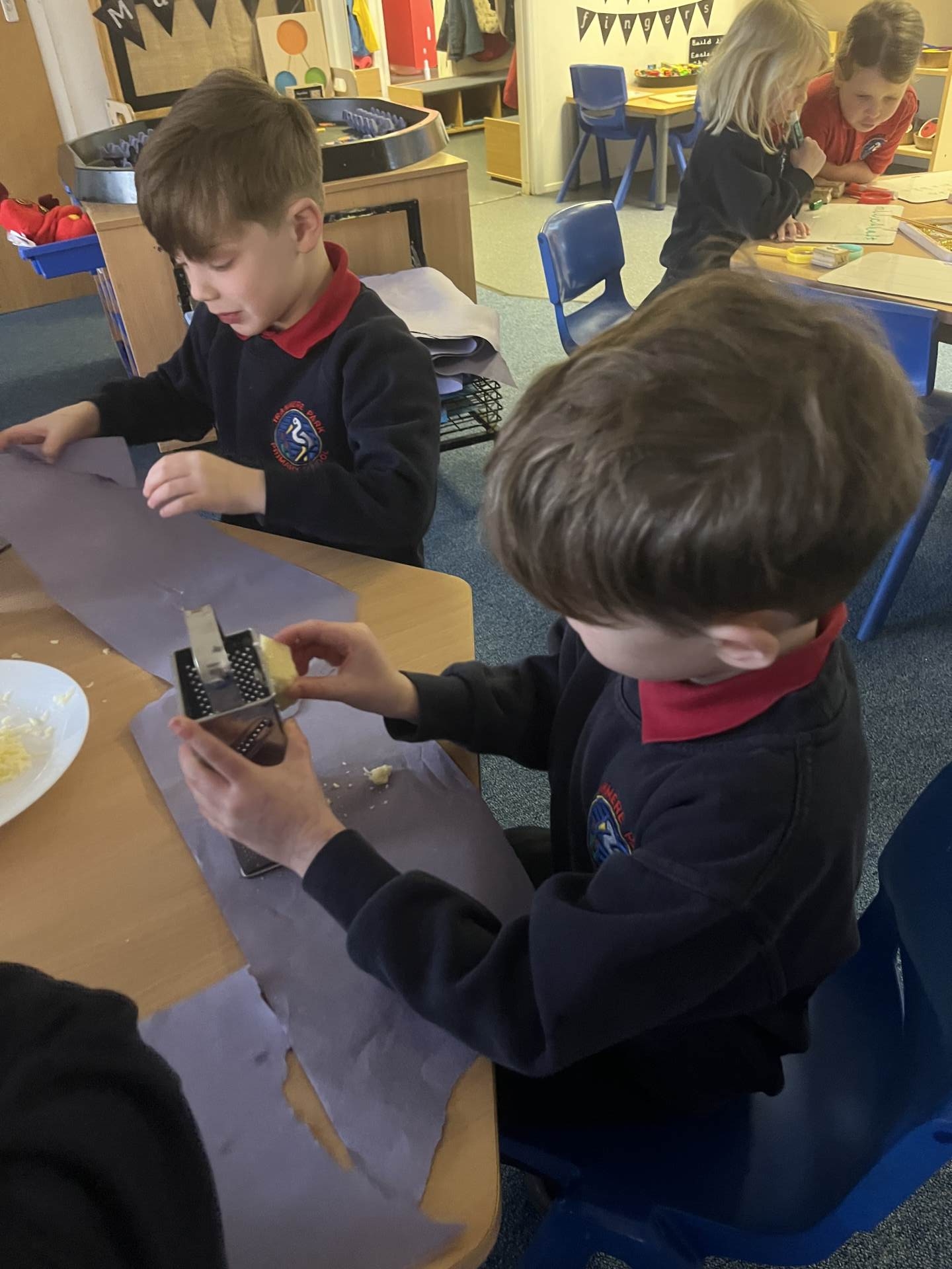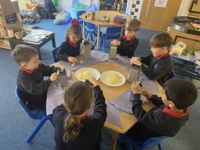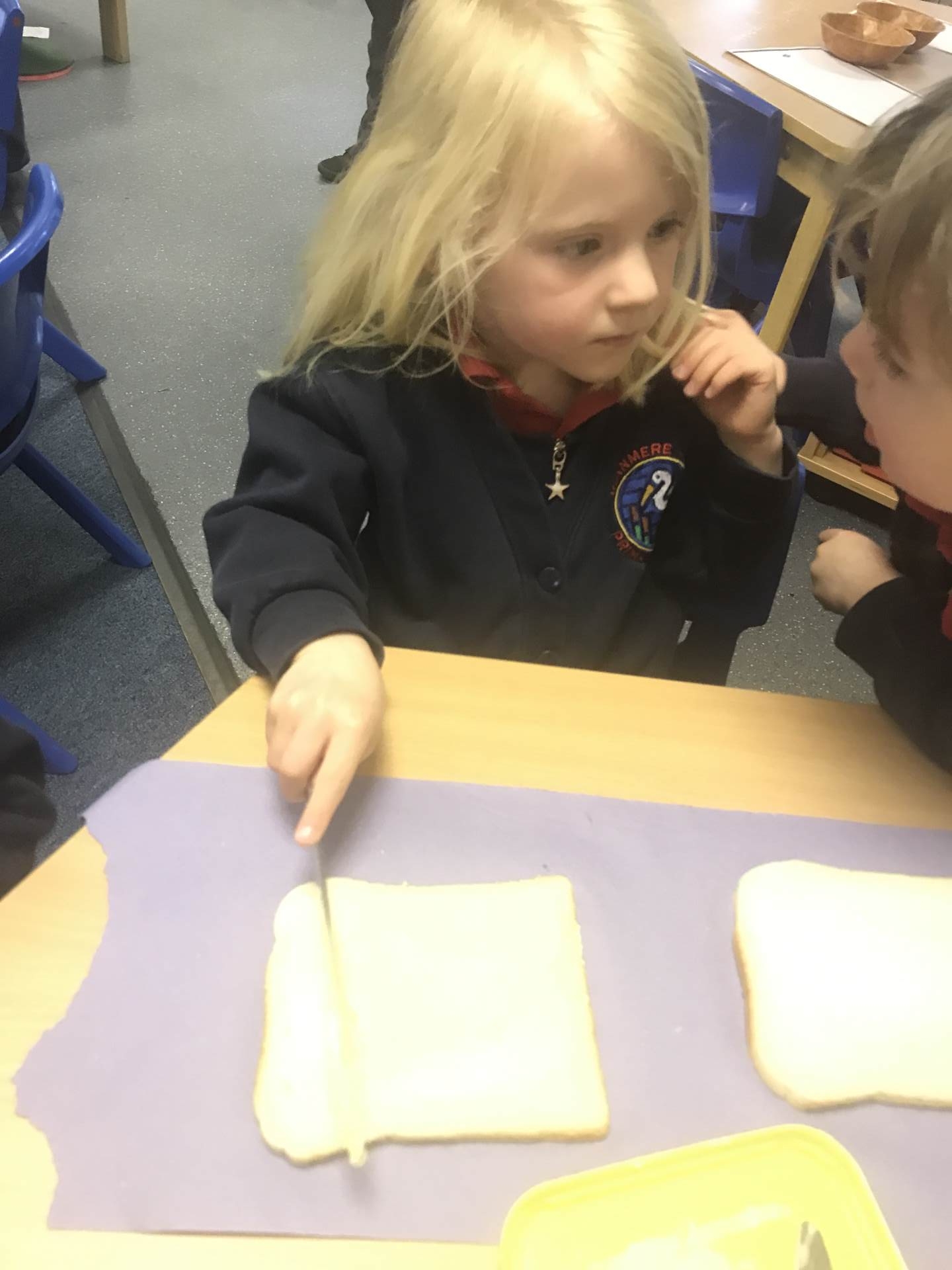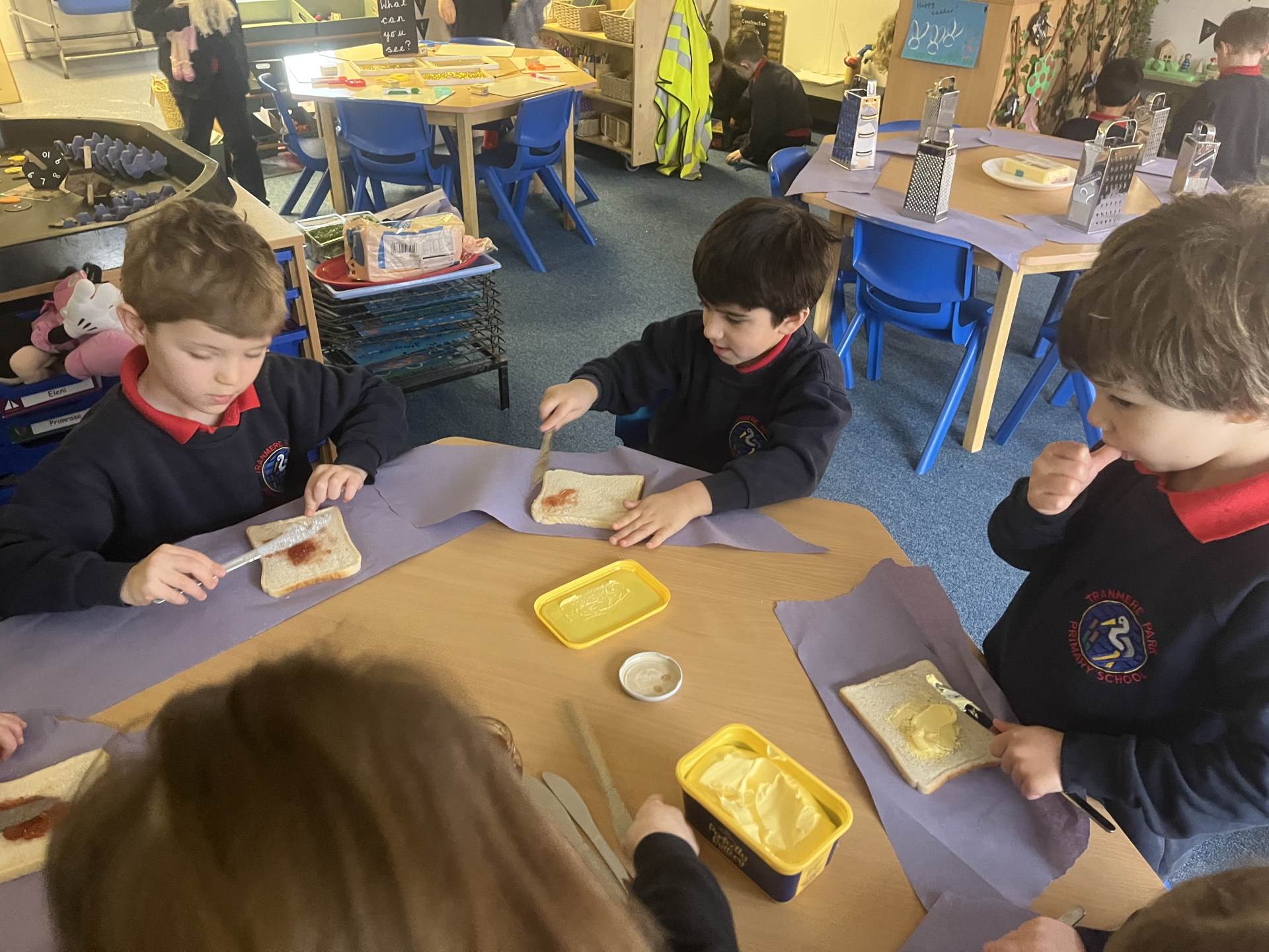 In the morning, the children helped to prepare their own snacks, practising important skills such as spreading, cutting, grating, tearing, sprinkling and making choices about what they would like to eat. This linked closely to our learning about where food comes from and how we prepare it.