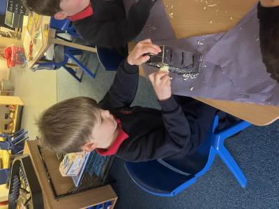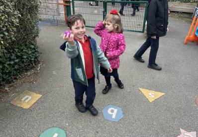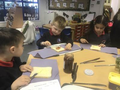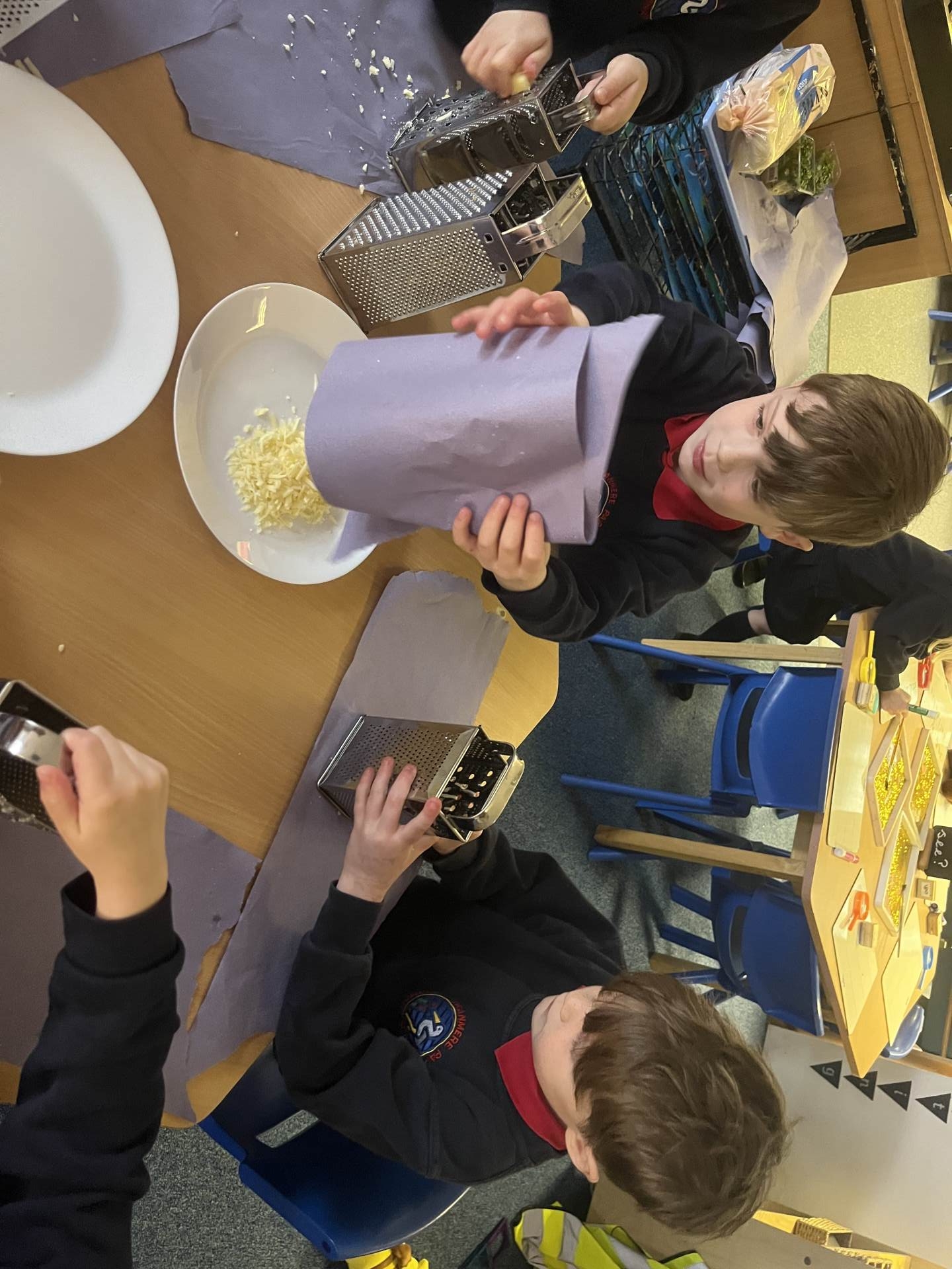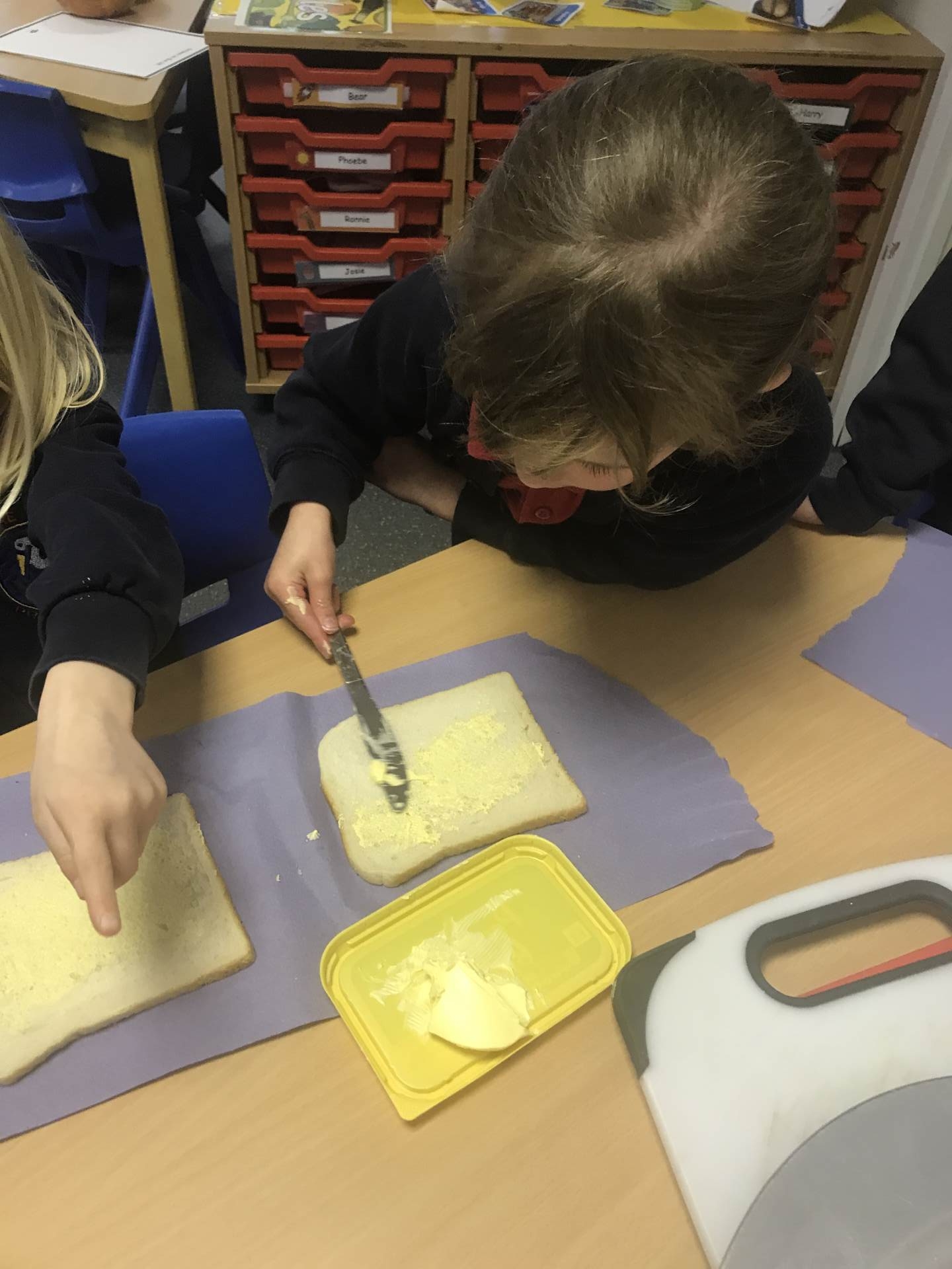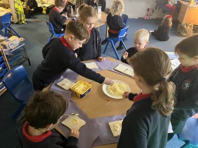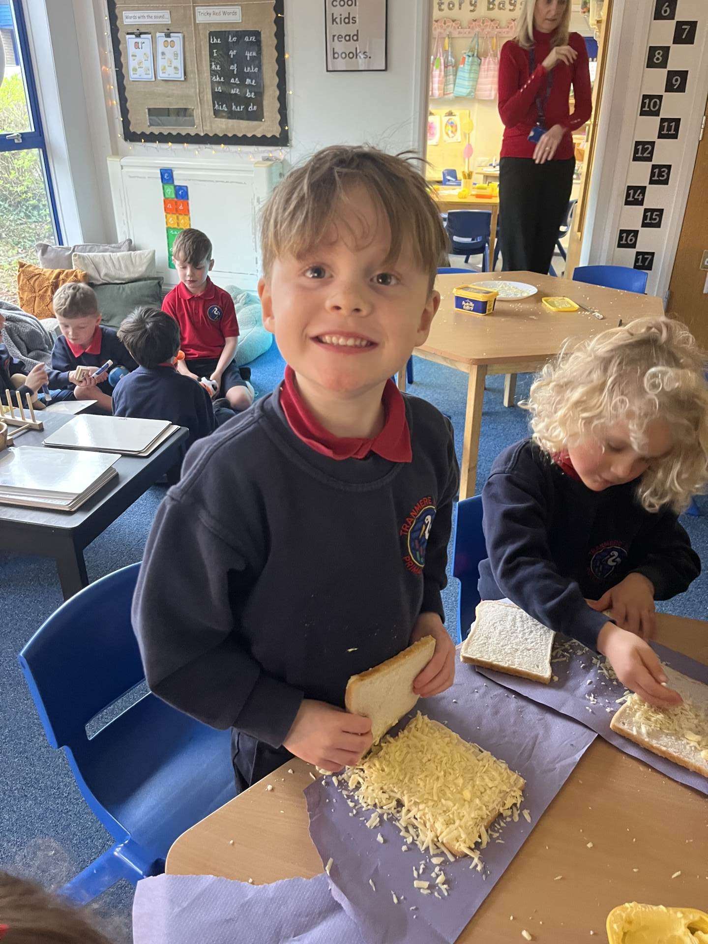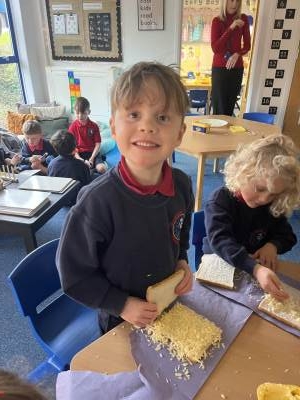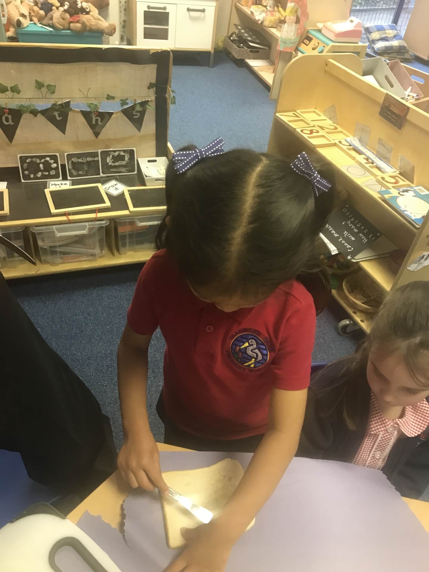 In the morning, the children helped to prepare their own snacks, practising important skills such as spreading, cutting, grating, tearing, sprinkling and making choices about what they would like to eat. This linked closely to our learning about where food comes from and how we prepare it.