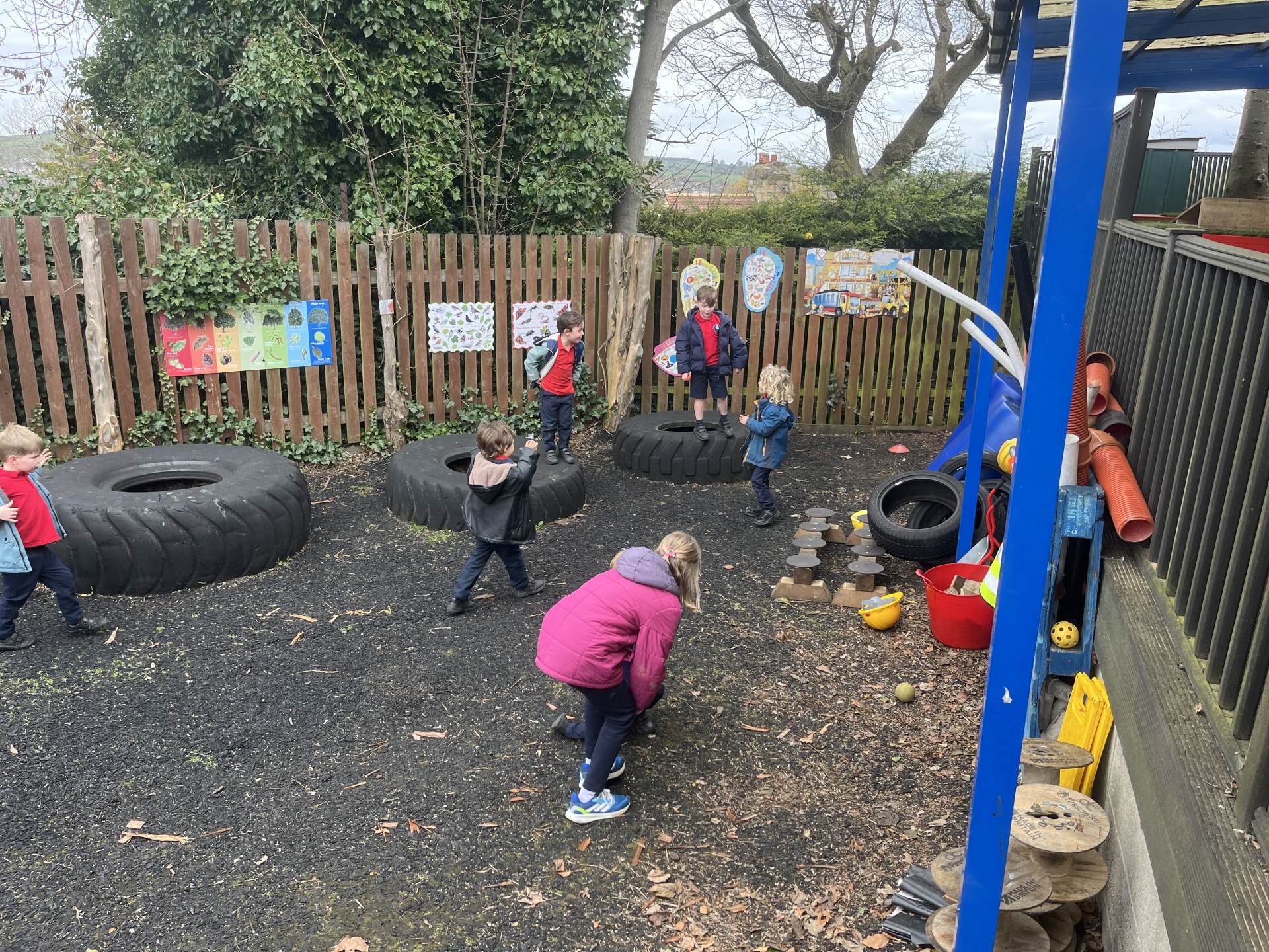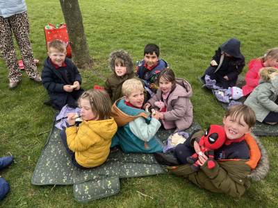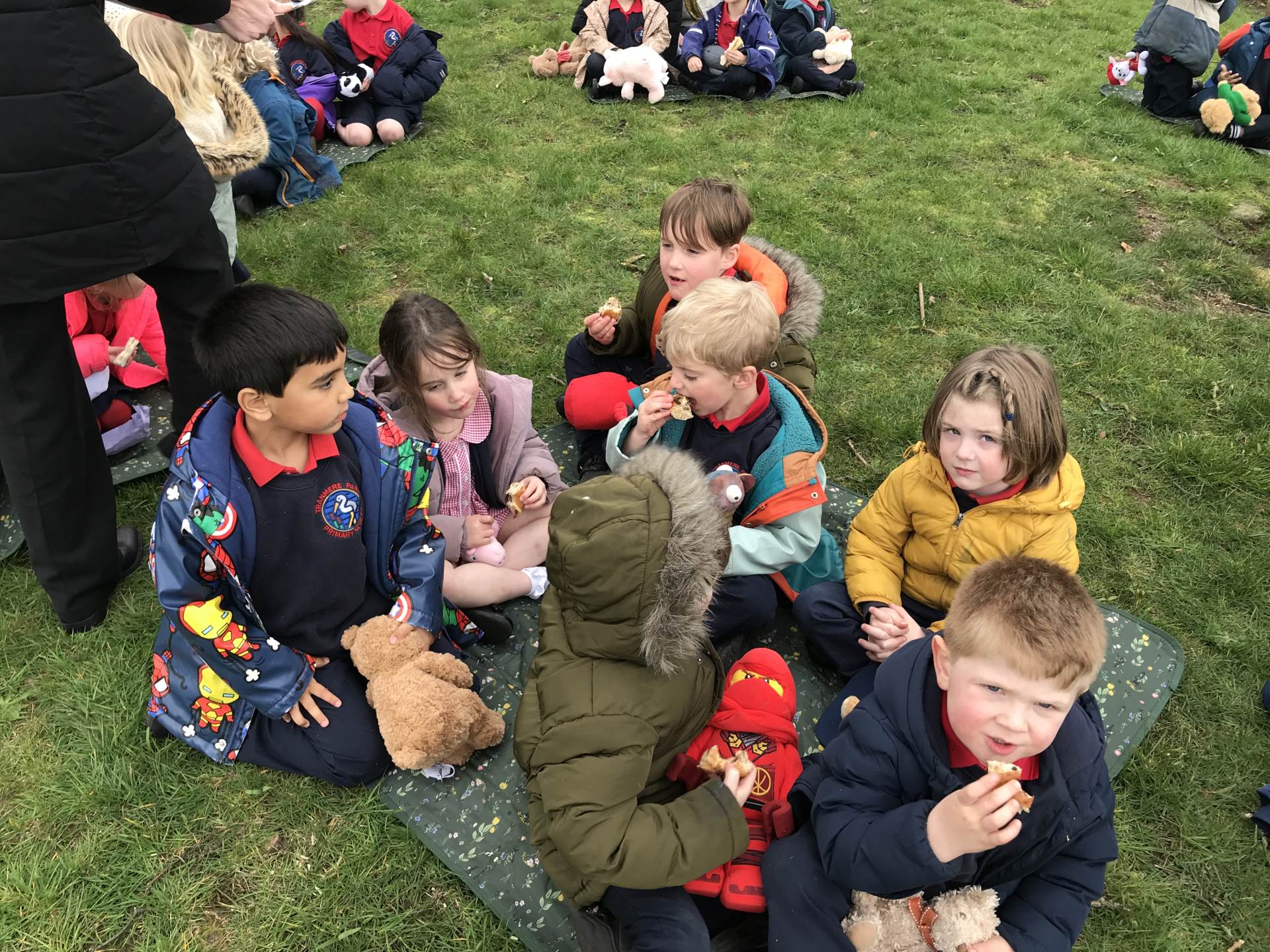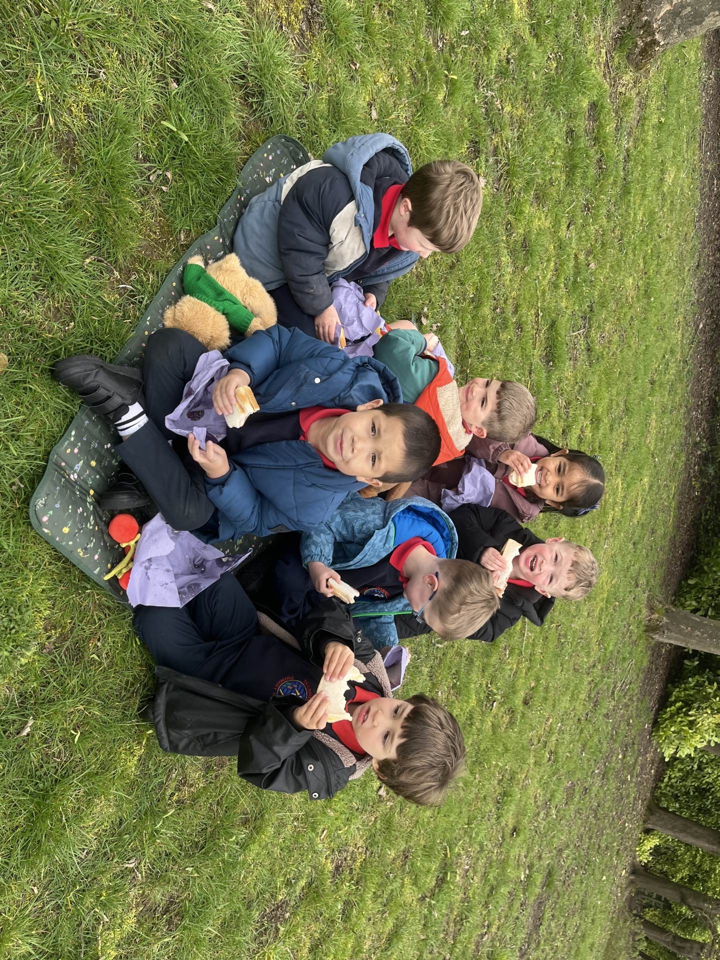 In the afternoon, we took our teddies outside and enjoyed our picnic together on the banks. The children had a lovely time sharing their food, talking with friends, and enjoying the outdoor space with their cuddly companions.