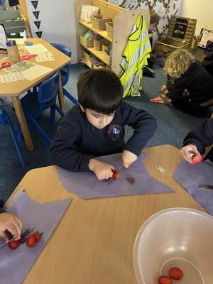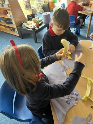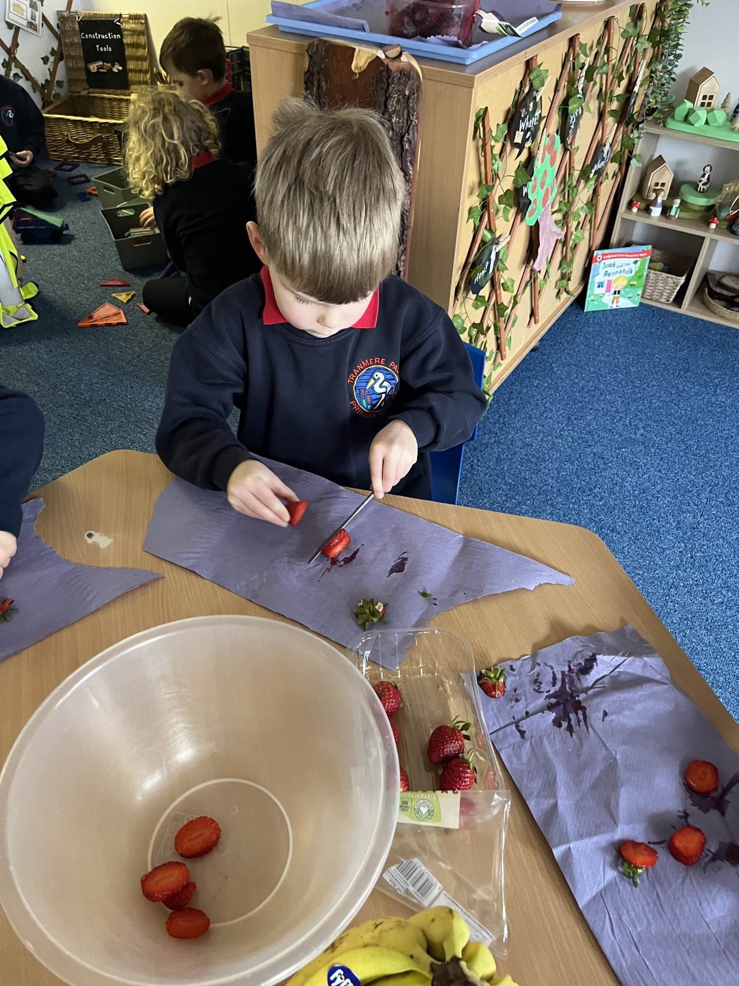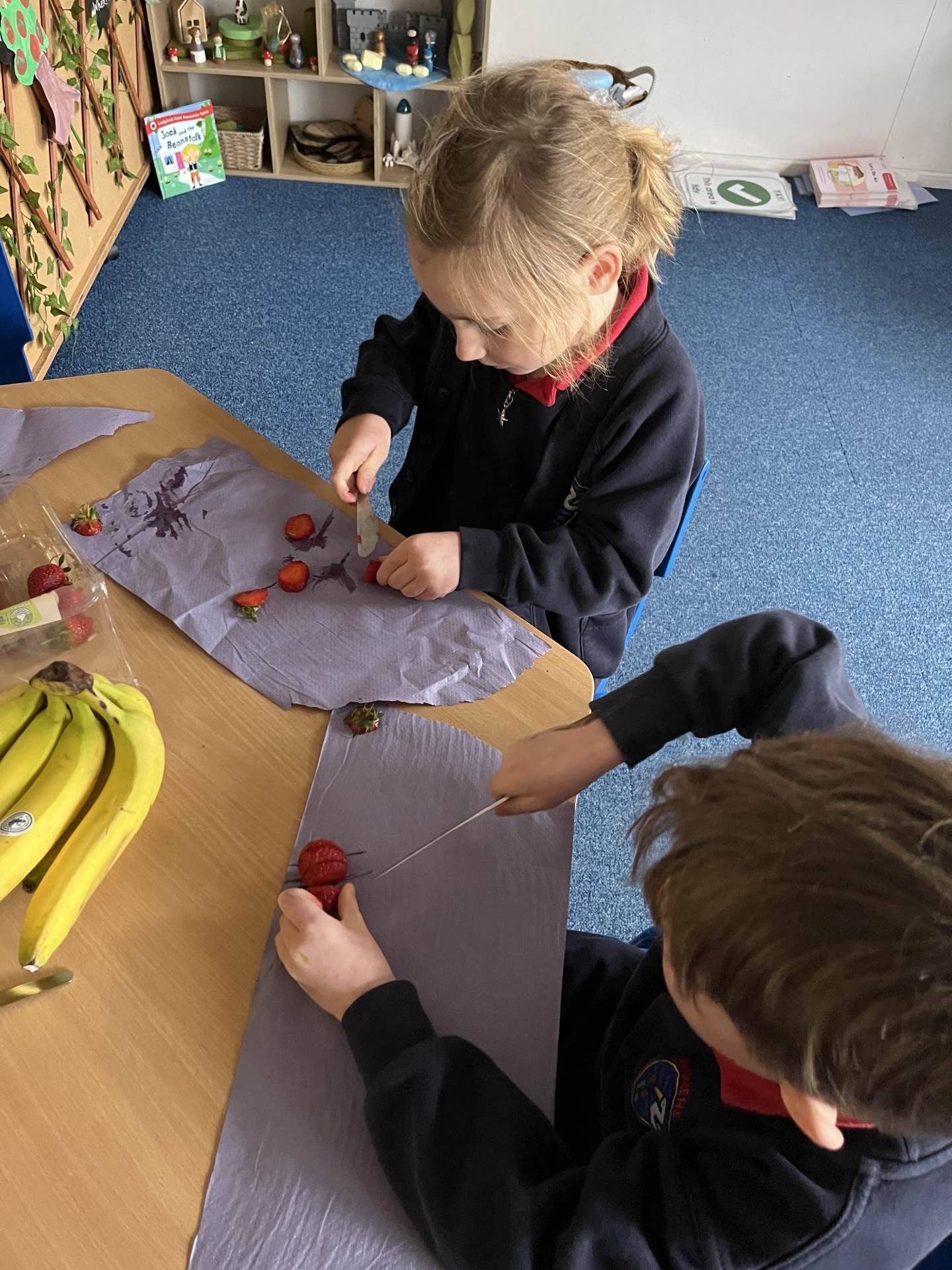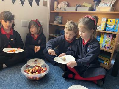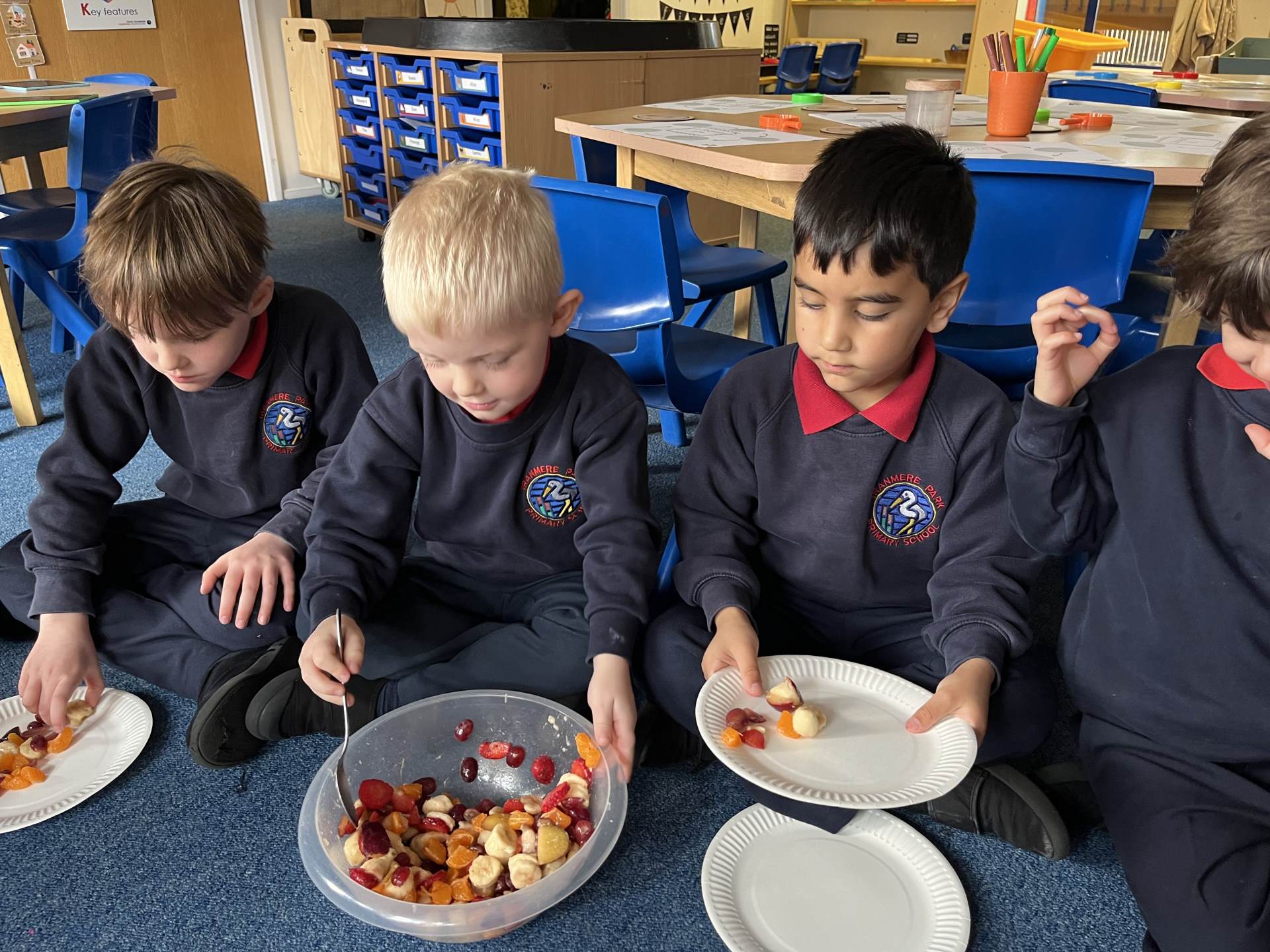 Our main task this week was to make a fruit salad using fresh fruits grown by farmers. During the activity, we talked about which fruits we were chopping, whether they were grown in England or abroad, and what it would mean if we didn’t have farmers to grow them for us.