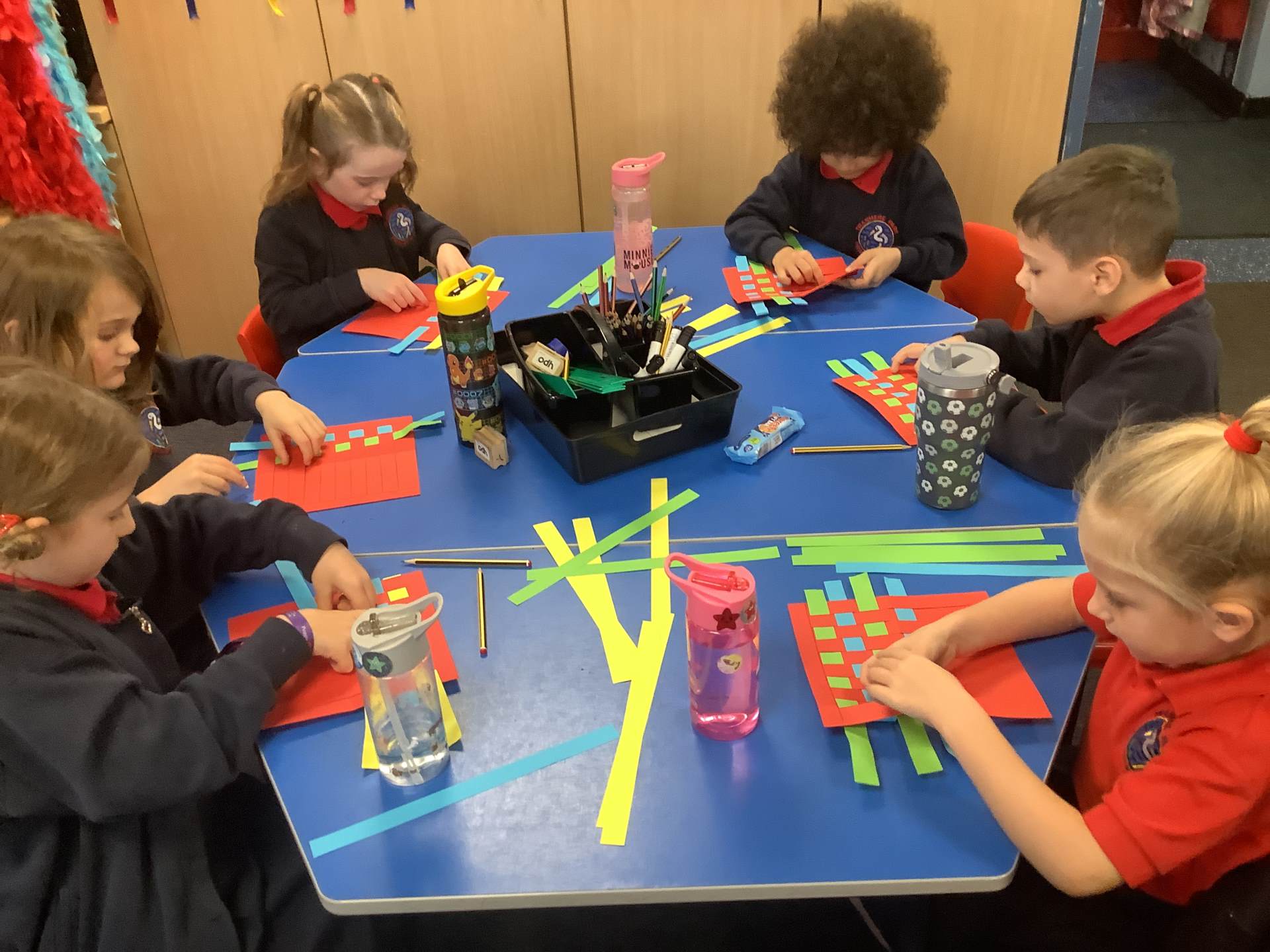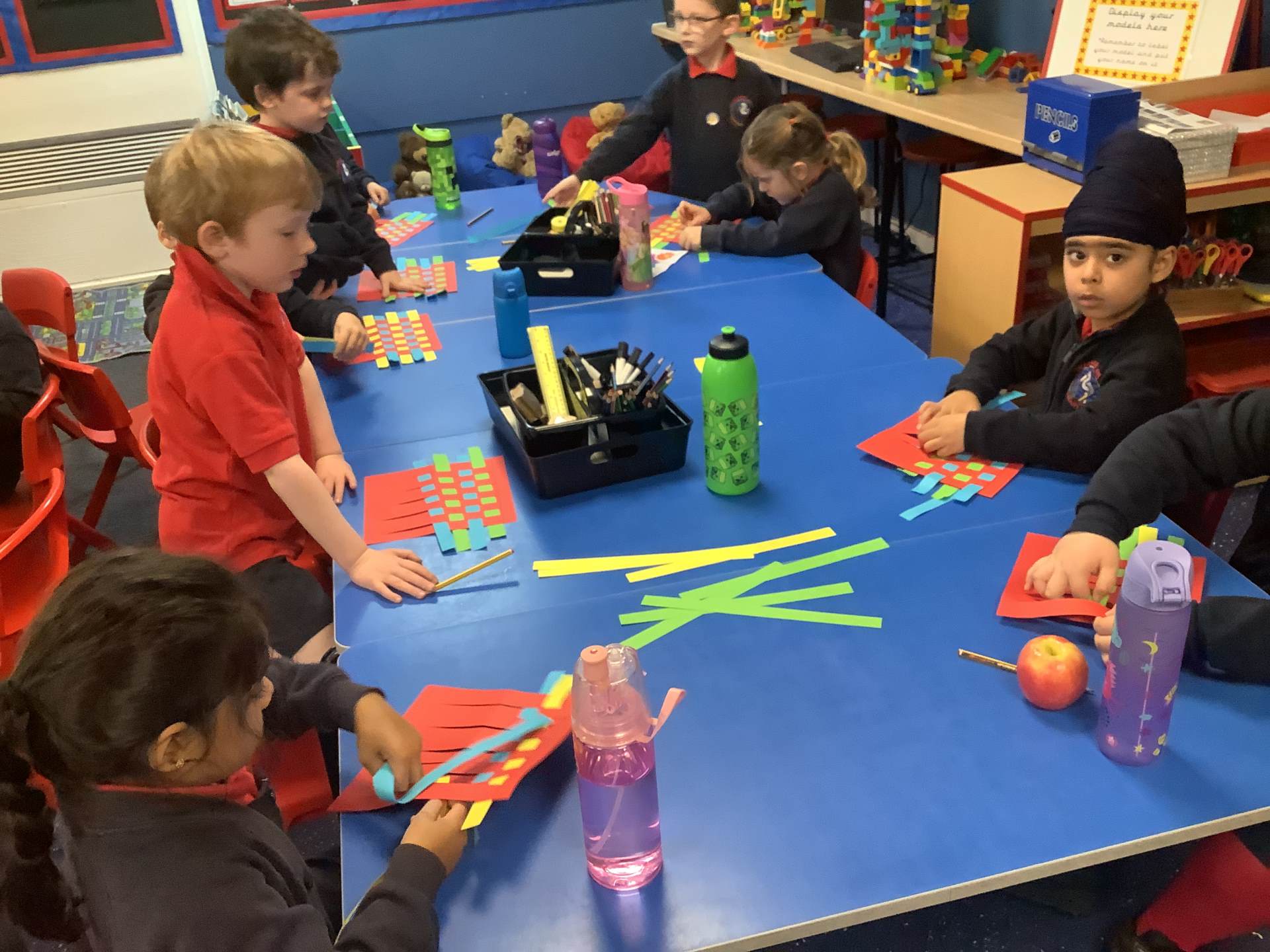 Using the warp we threaded strips of paper over and under and then under and over to create the weft.