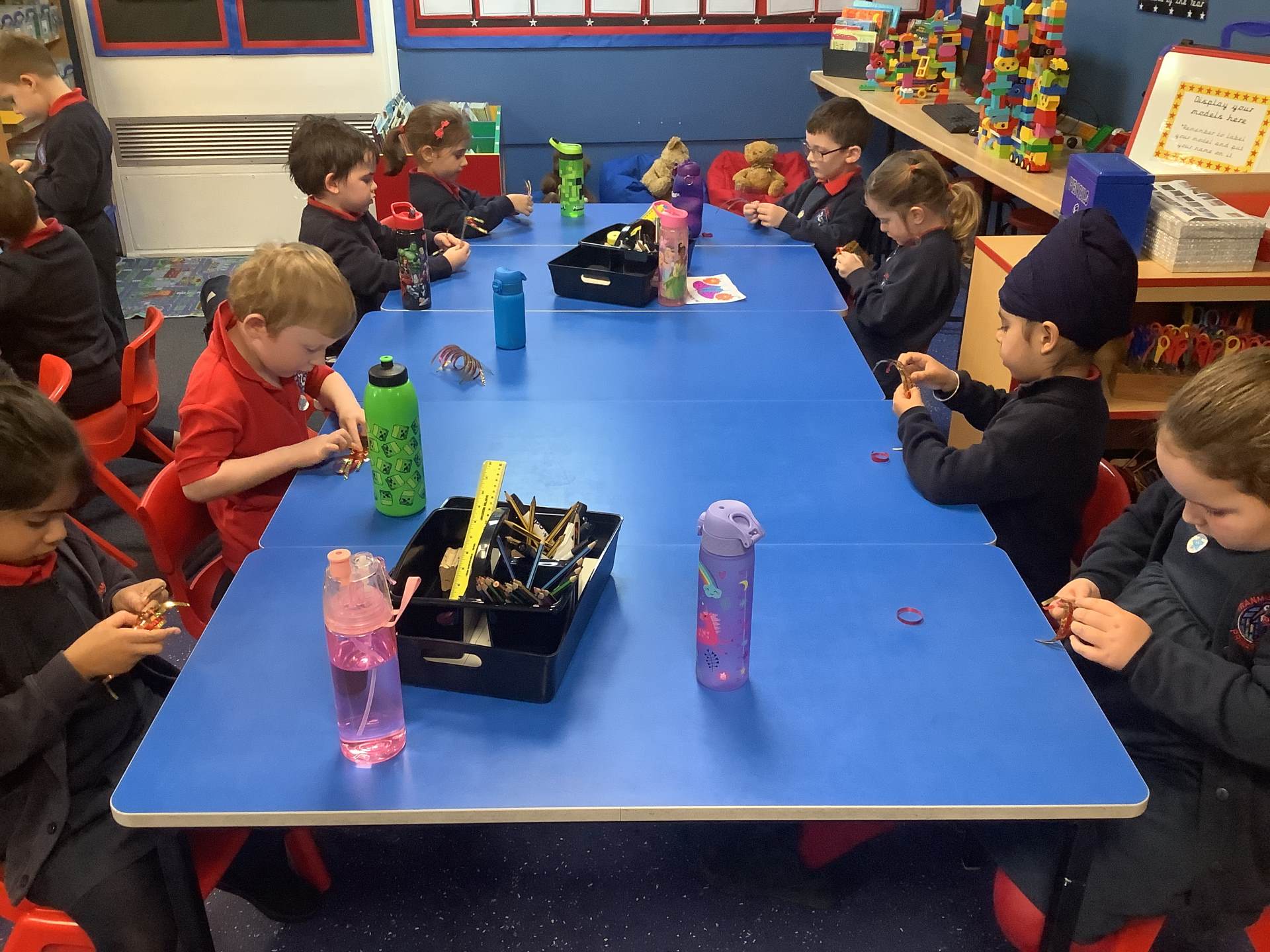 We used smaller pieces of foil ribbon and threaded alternate colours through the punchenella to create a pattern. Look at the concentration on our faces!