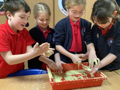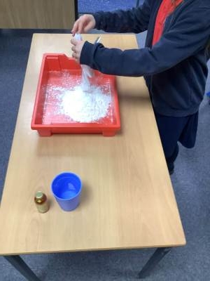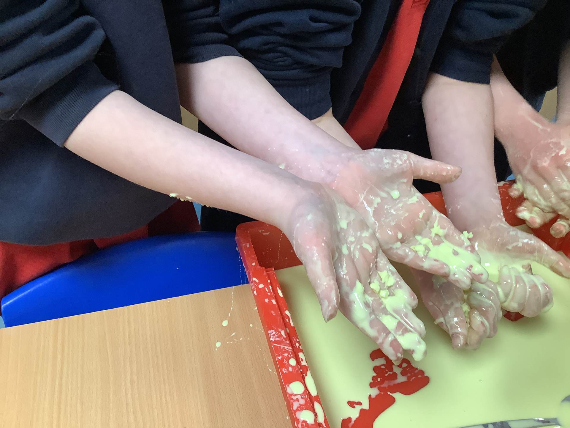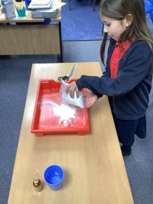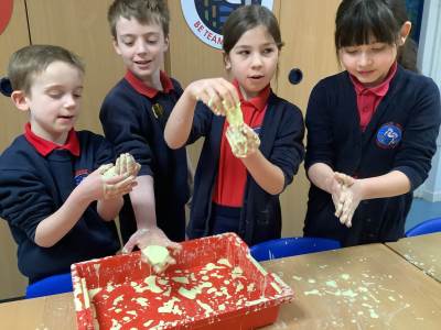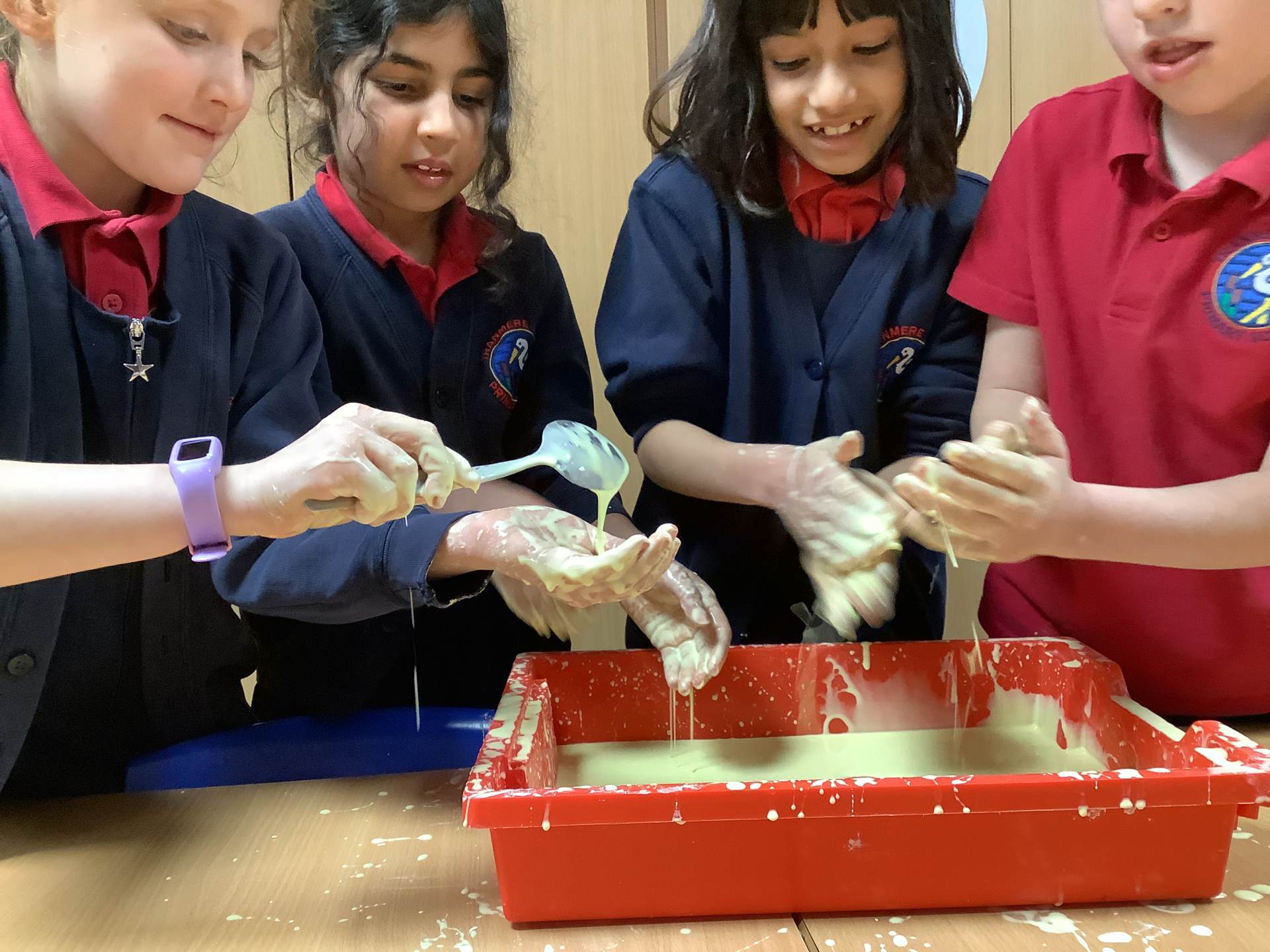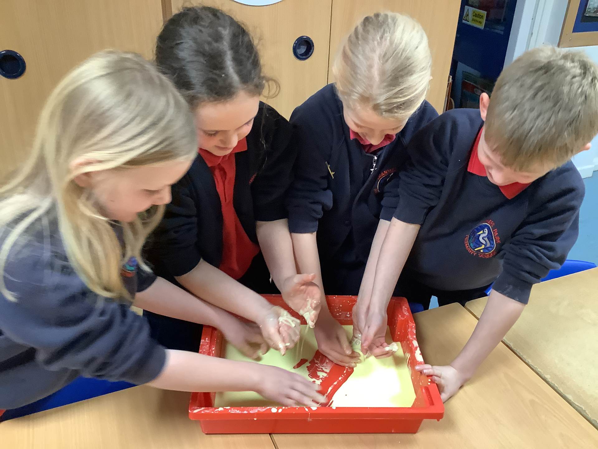 In Woodpeckers, we used corn flour, water and food colouring to create our own Non-Newtonian fluid. We spent time exploring this and discussed how it acts as a liquid and a solid depending on how much pressure you use.