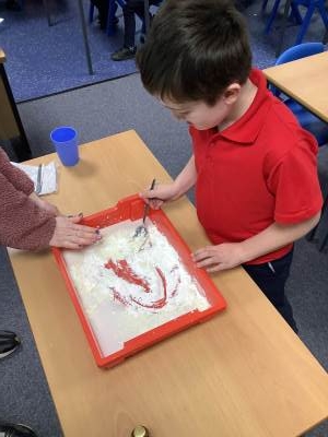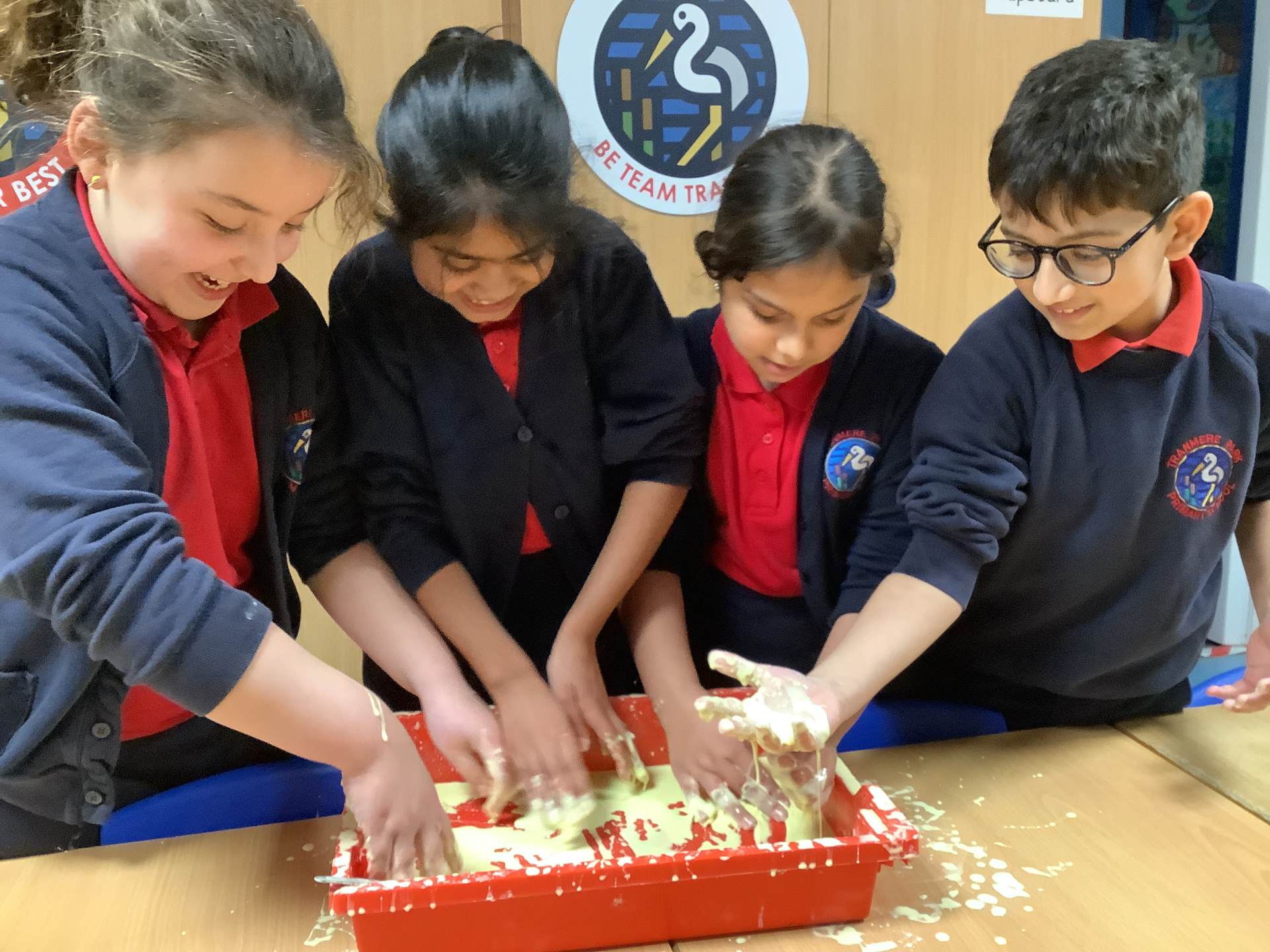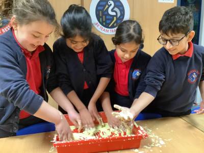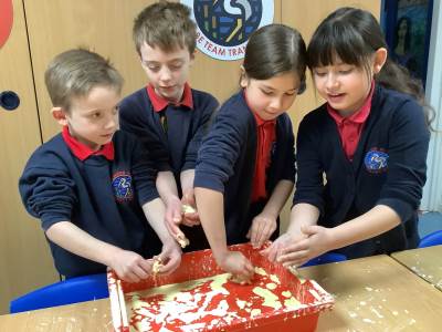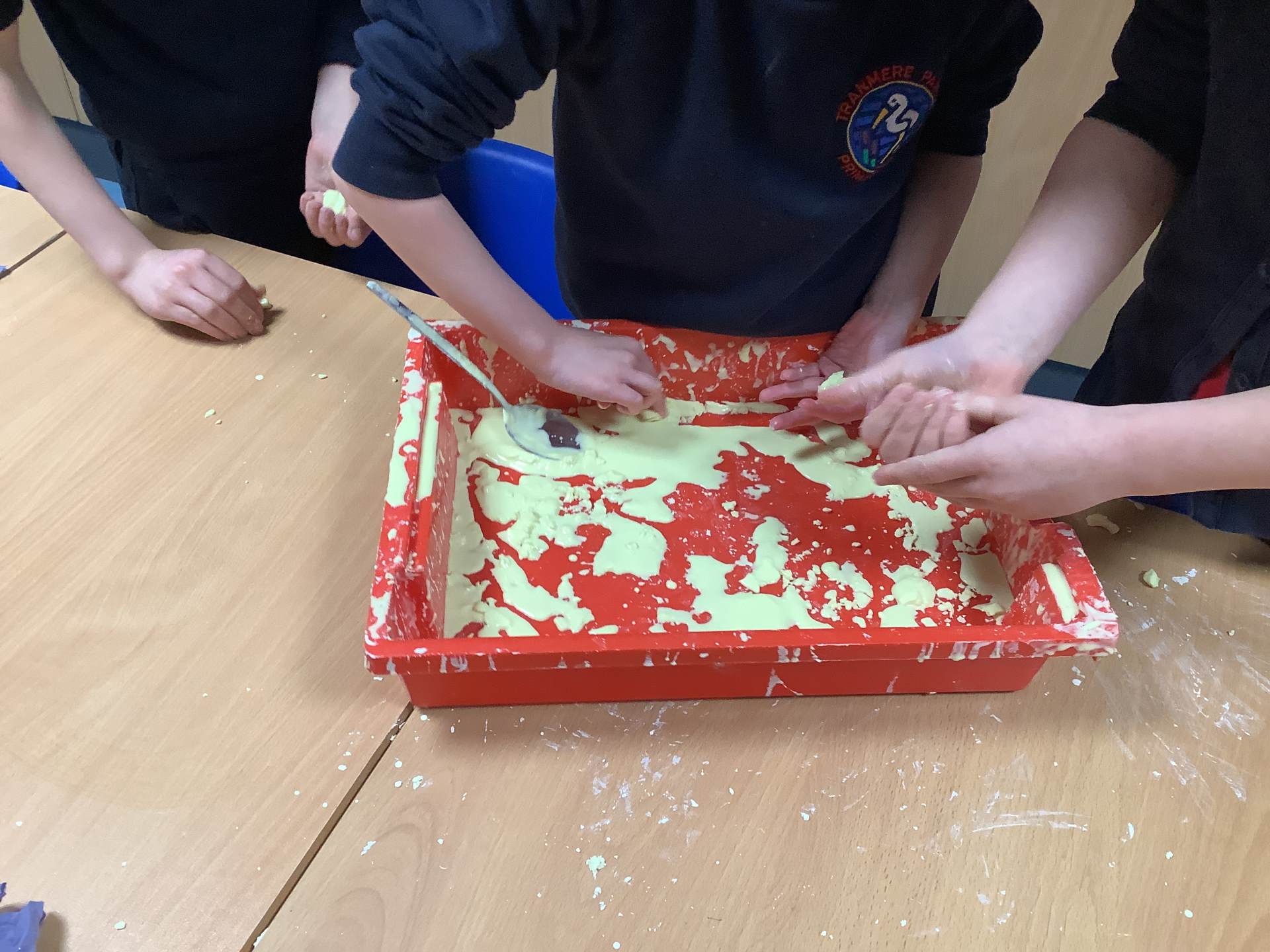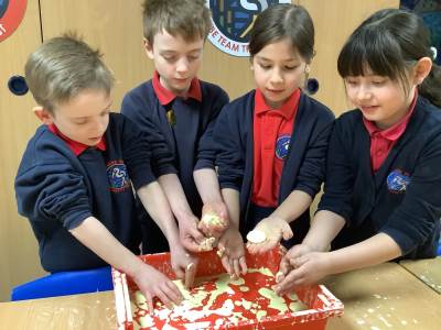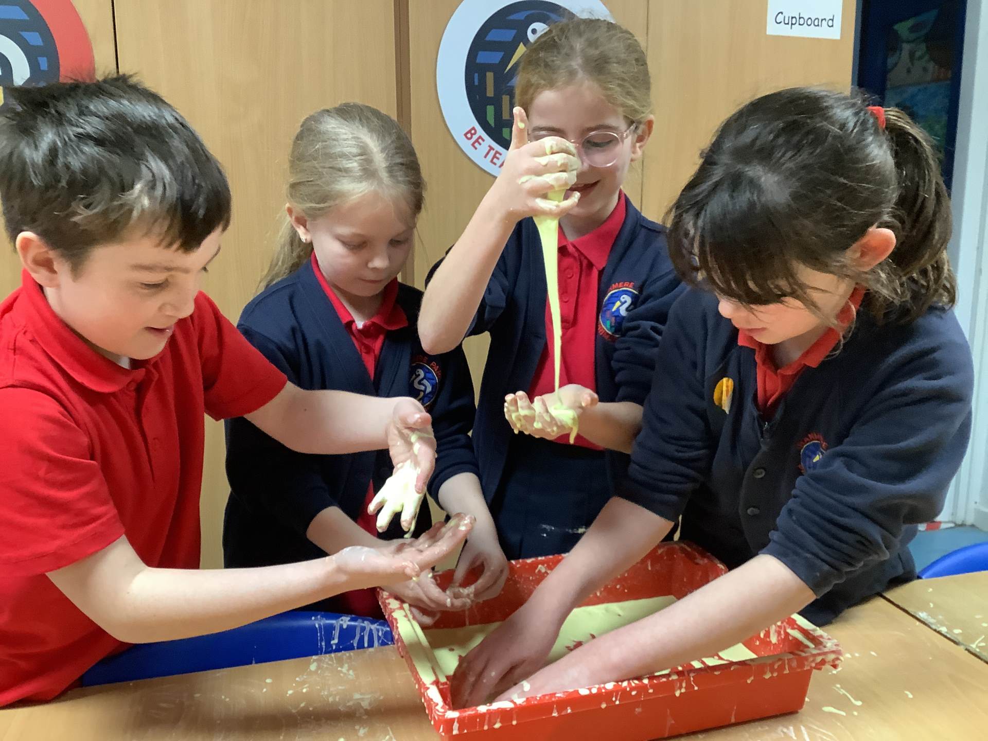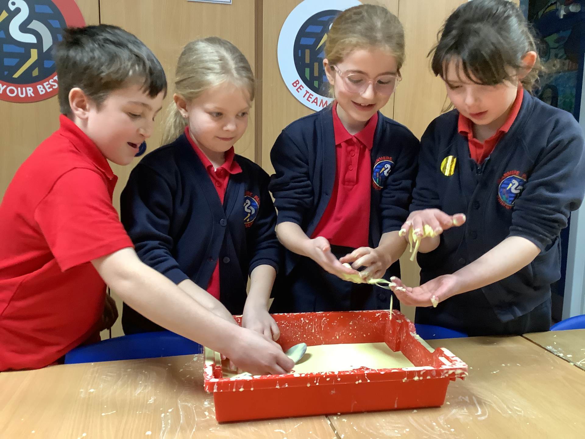 In Woodpeckers, we used corn flour, water and food colouring to create our own Non-Newtonian fluid. We spent time exploring this and discussed how it acts as a liquid and a solid depending on how much pressure you use.