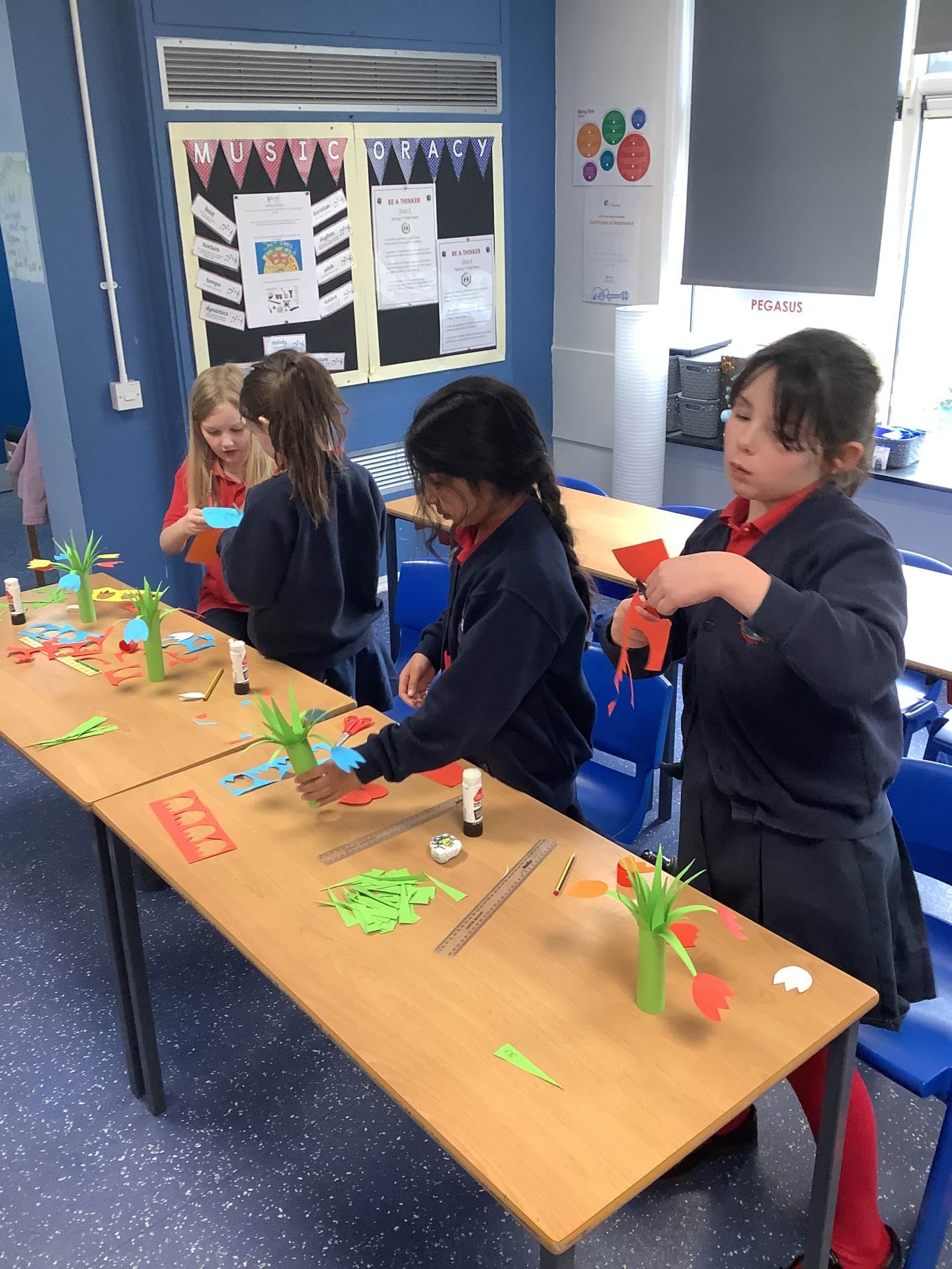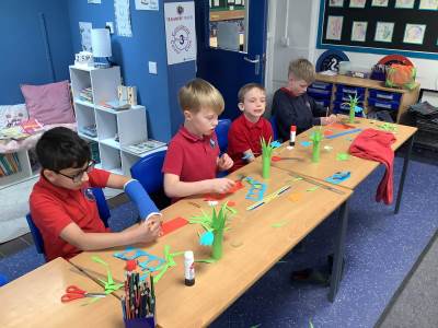 Year 3 have spent time looking at different vases of flowers and discussing what they could see. They spent time sketching these flowers and adding colour to them. As they enjoyed this activity so much, the children had the opportunity to create their own vases of flowers using different coloured paper.