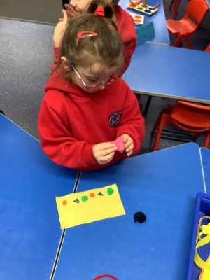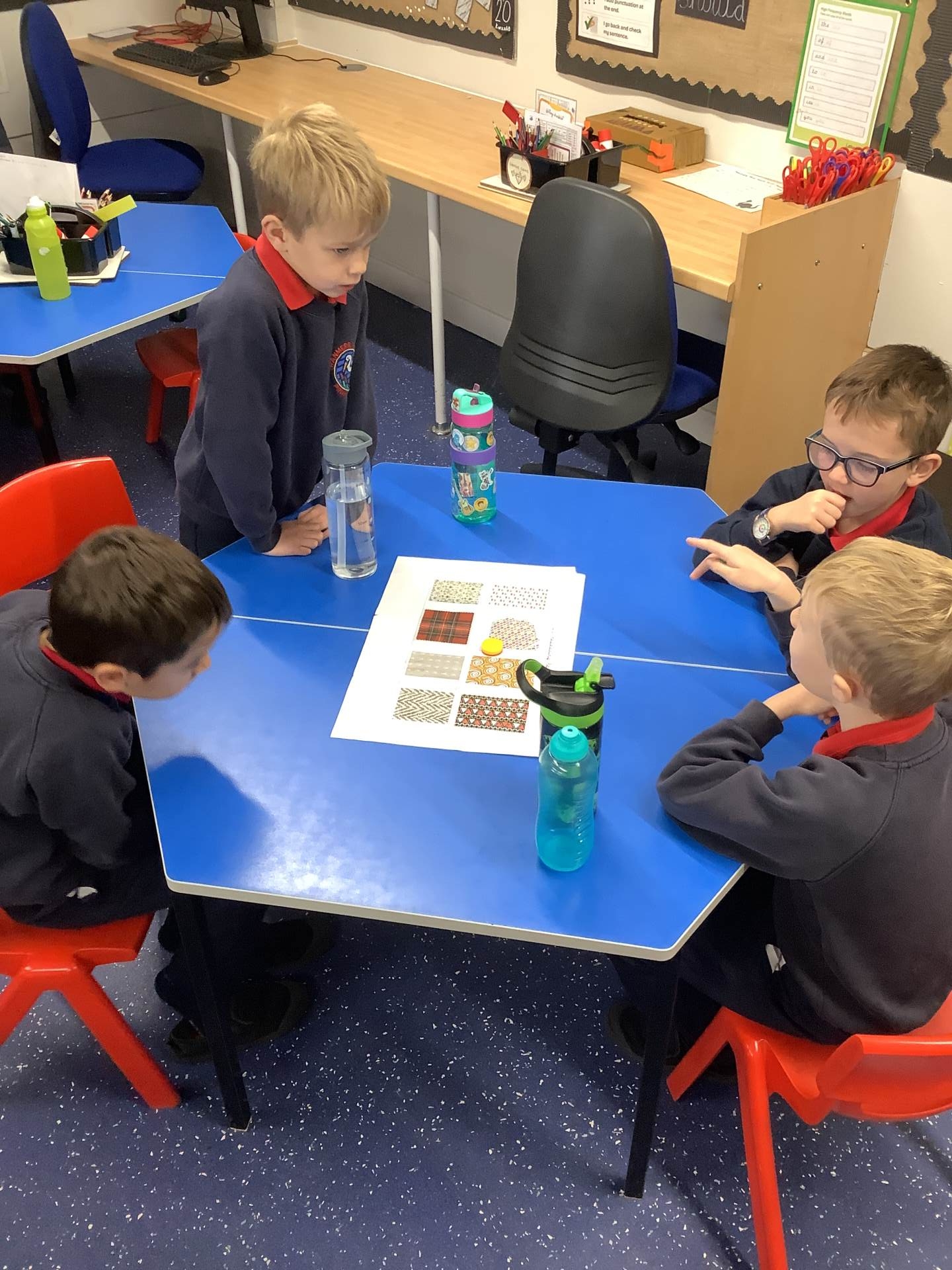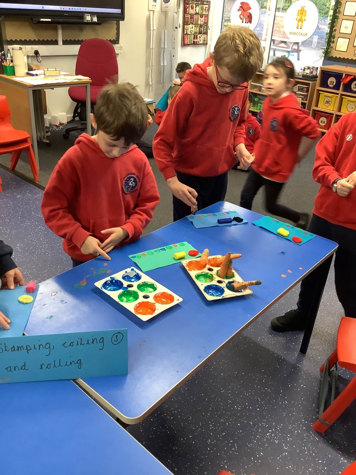 We have learnt different techniques such as stamping, fringing, coiling and rolling. During this topic, we have also looked at repeating patterns. We used counters to take turns identifying the patterns we could see and then built on what our friends had already identified.