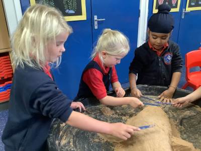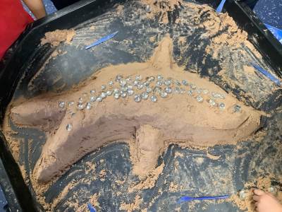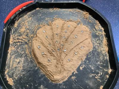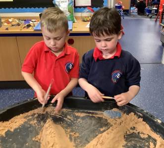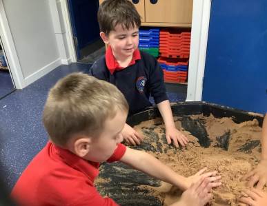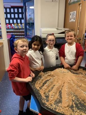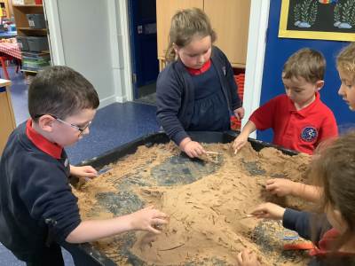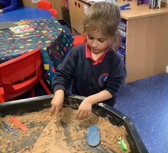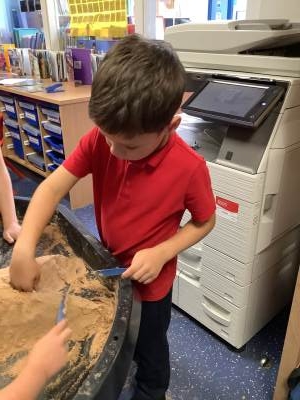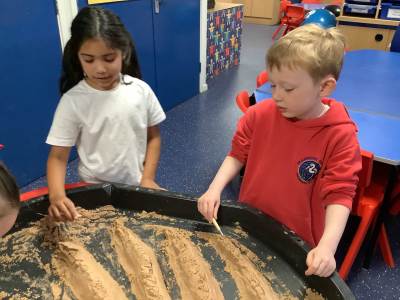This half term's topic is 'Hooray, Let's Go On Holiday.' As part of our art focus, the children have been learning about sand artists and how they can create amazingly creative sand structures using a range of different tools. We wanted to have a go at creating our own and enjoyed experimenting with the tools to see what effects we could create. We also enjoyed adding our own decorations. Here we are at work.