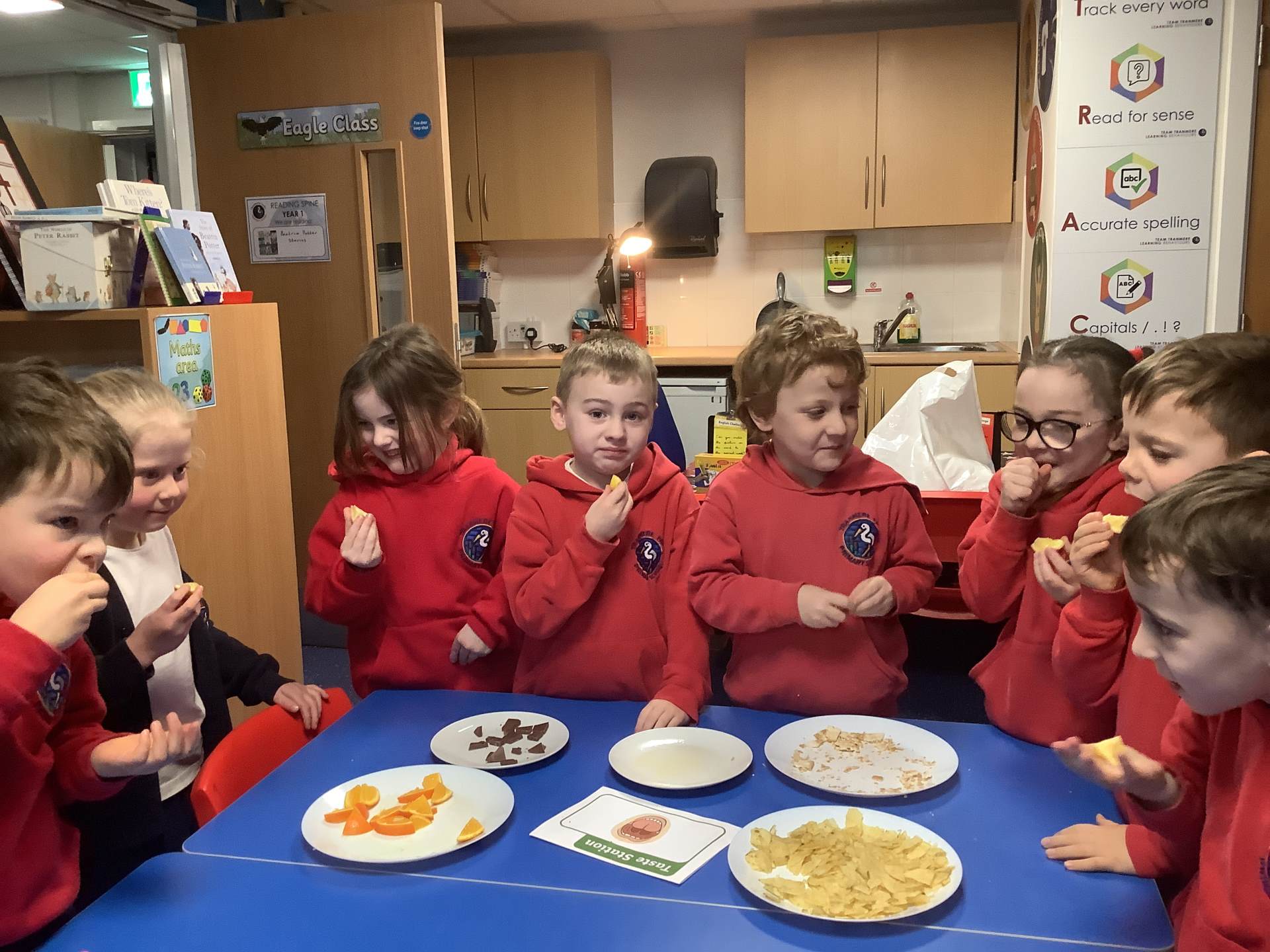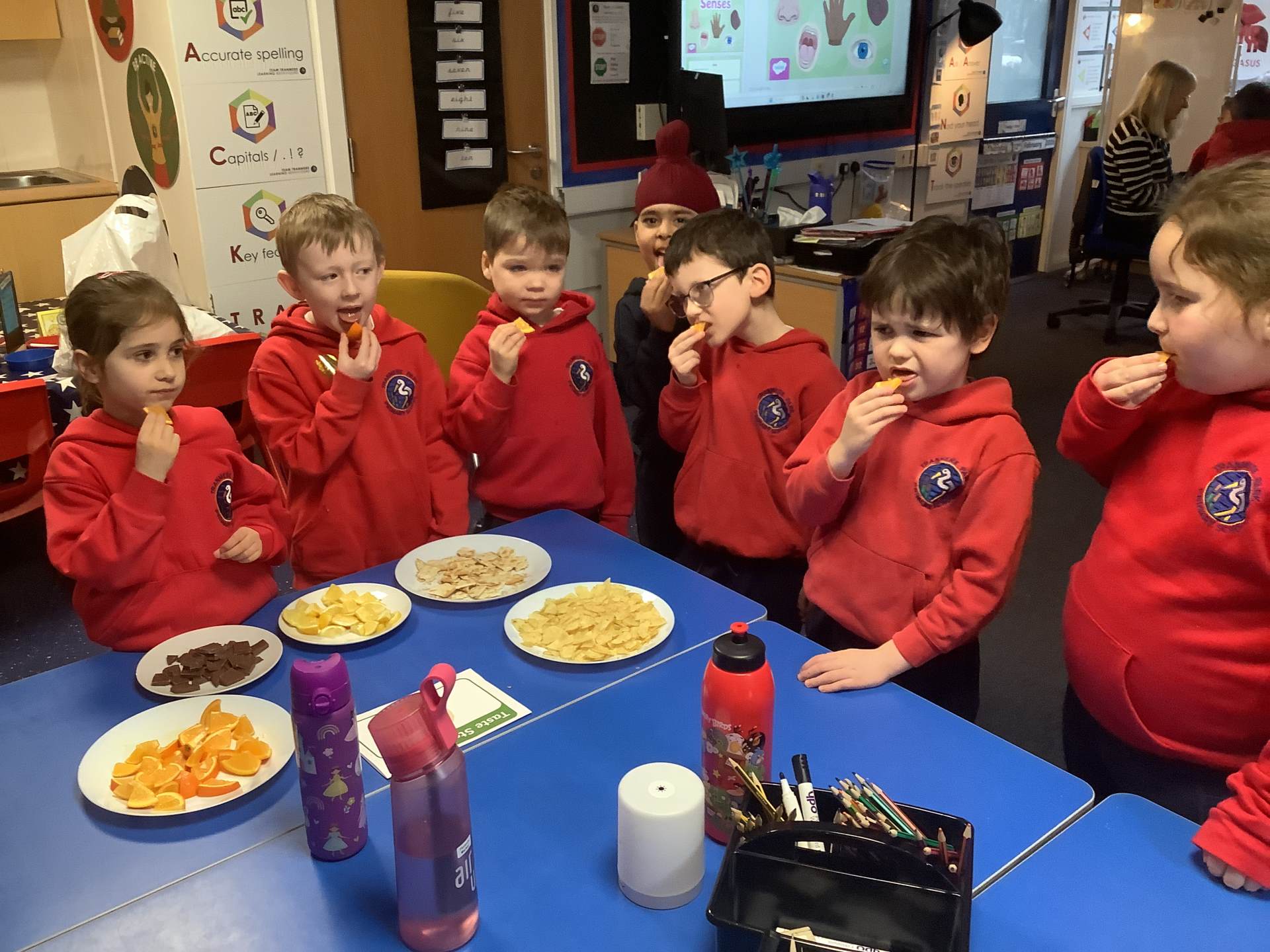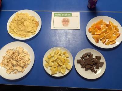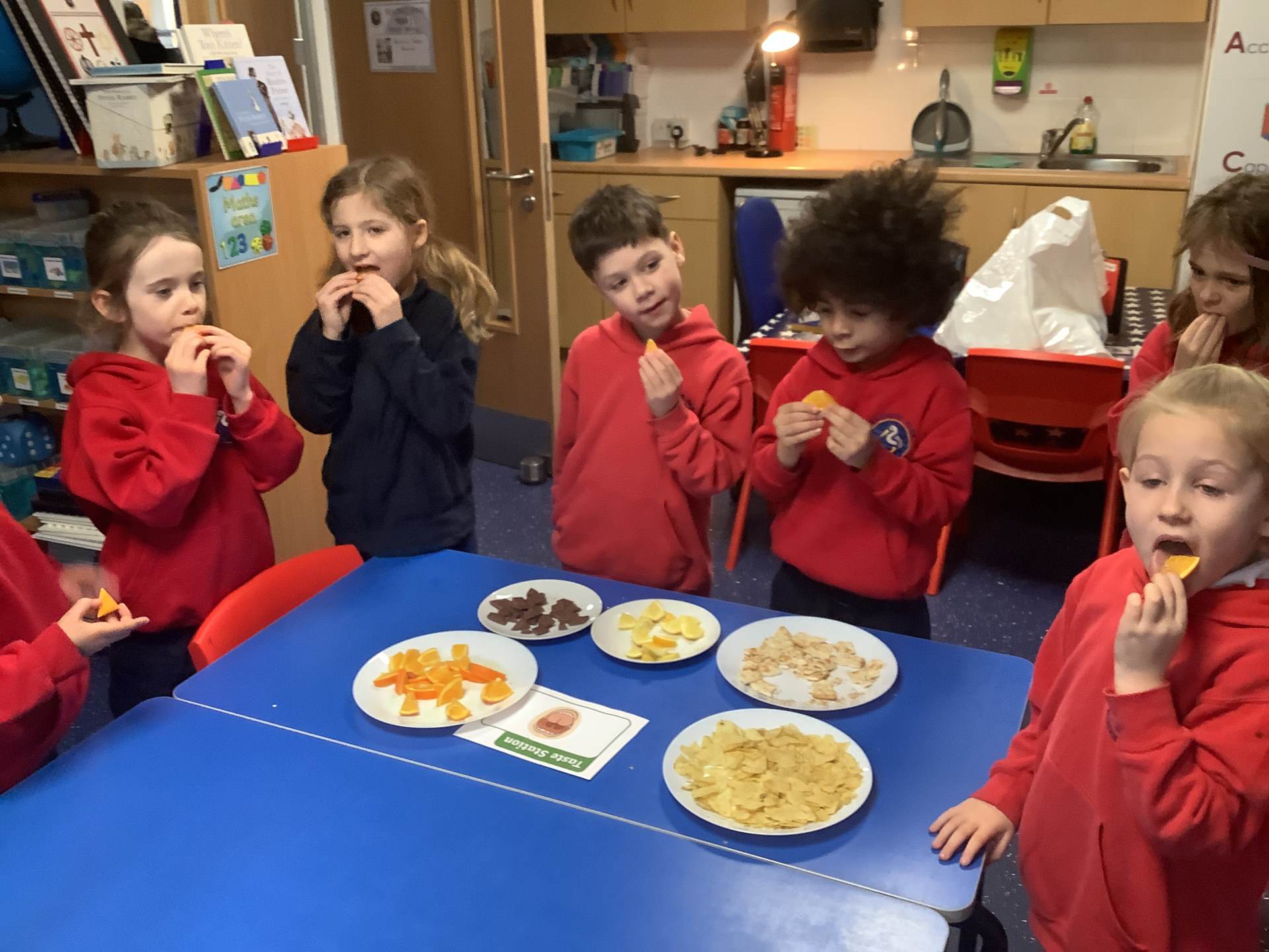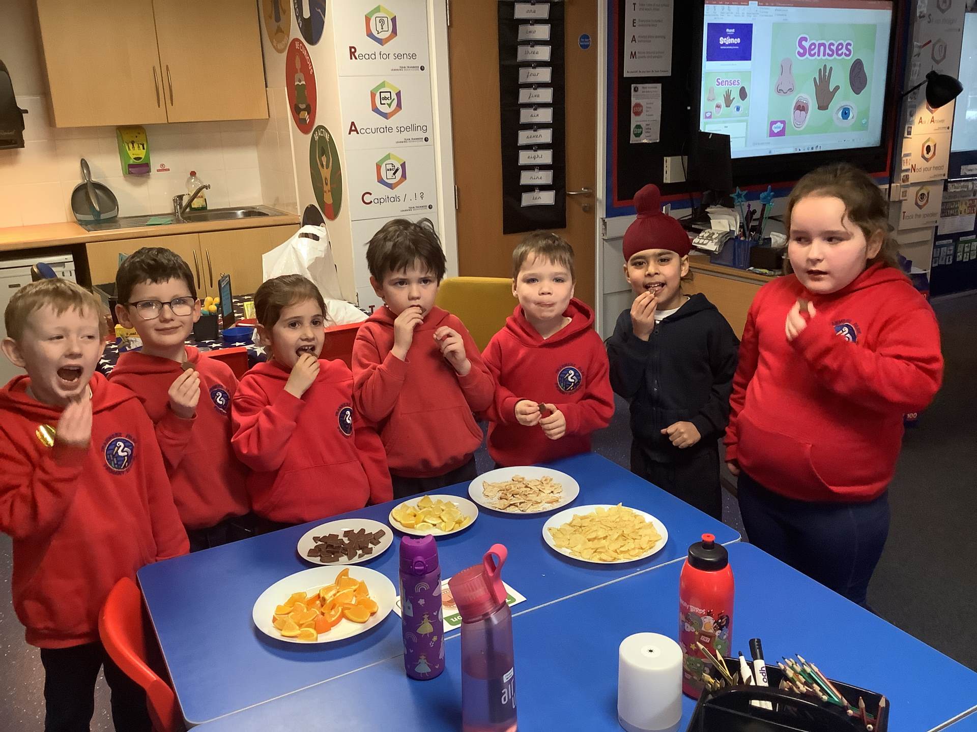 As part of our science work we discussed what we already knew about the 5 senses (sight, hearing, smell, taste, and touch) and identified which body part is used for each sense. The children then completed an investigation to see how good their senses were.