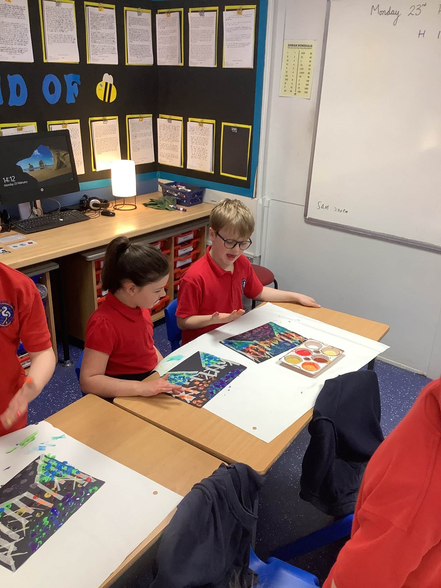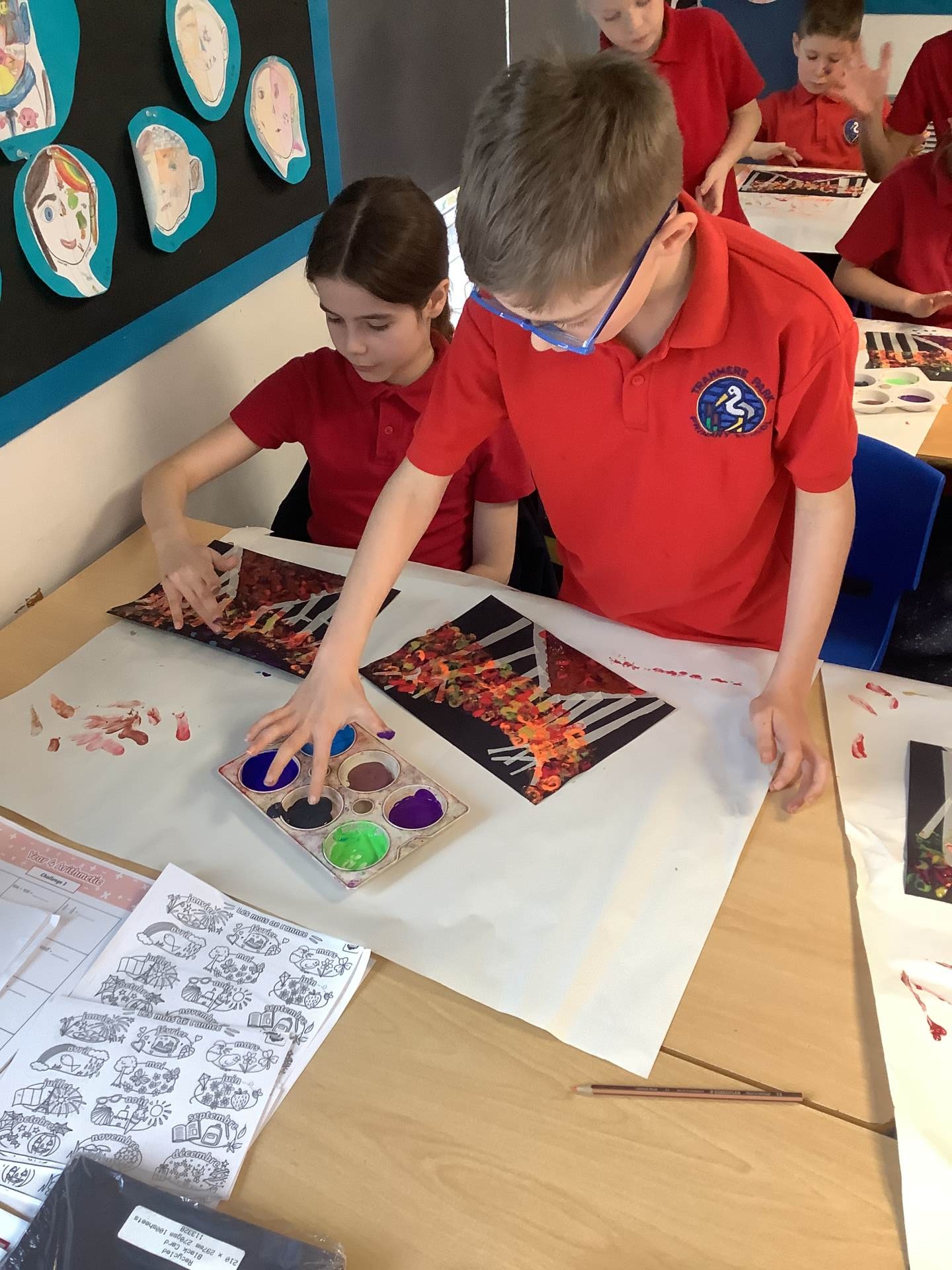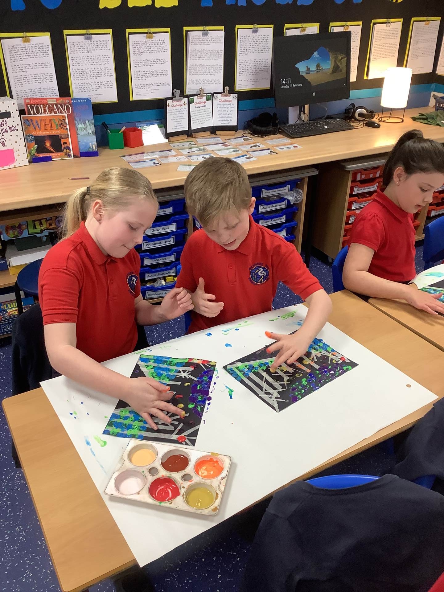 One of the artists we looked at was Leonid Afremov and we loved the colours that he used in his paintings. We decided to have a go and re-create one of his most famous paintings. To do this, we used black card and masking tape to create the background. We then used the paints to mix together the colours. After this, we took the masking tape off and created our finished piece. Have a look at our process - we can't wait to show you our finished creations!