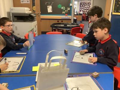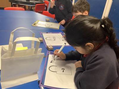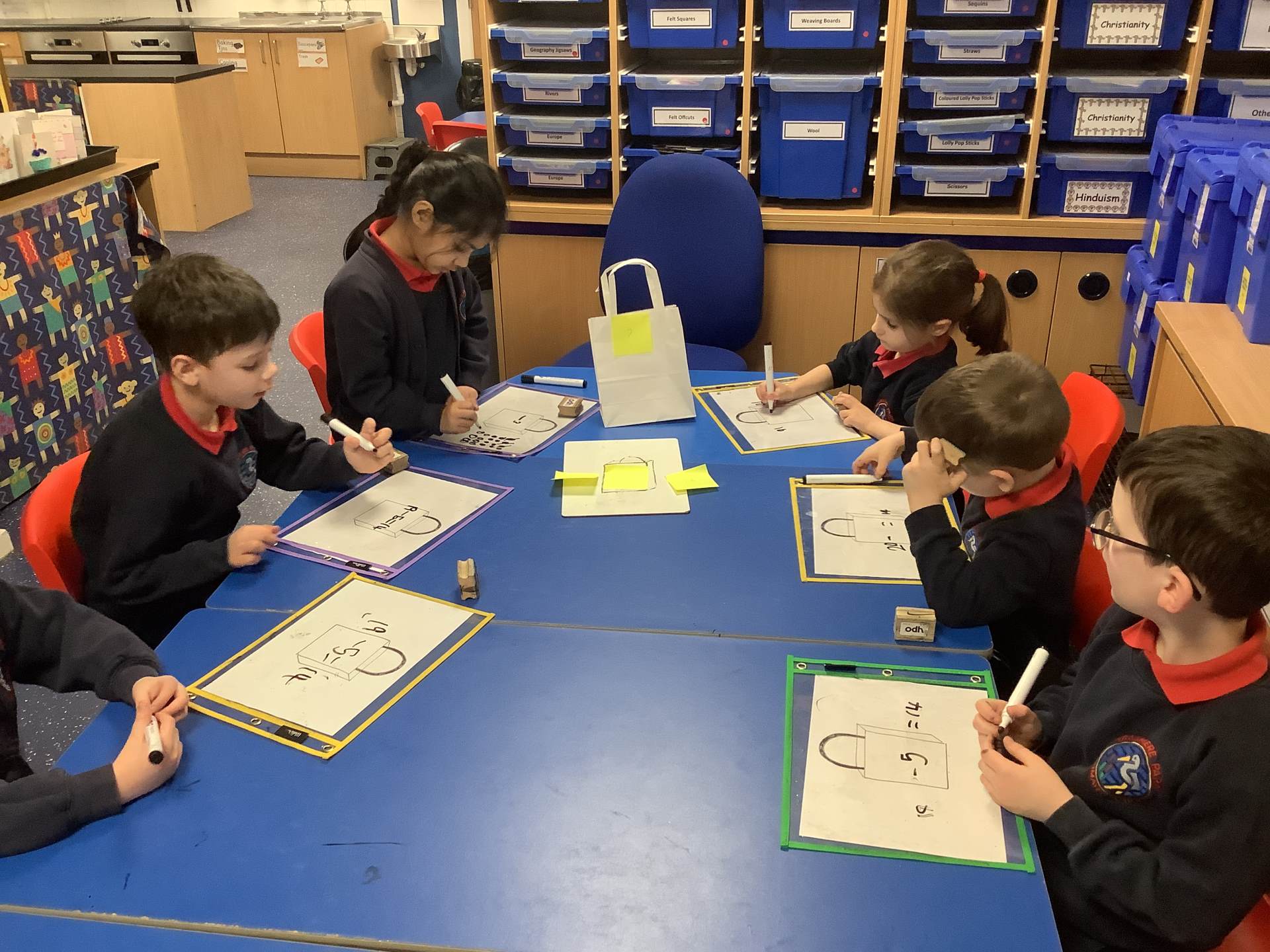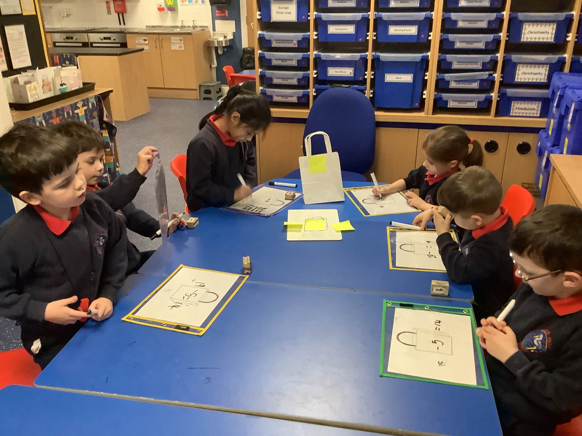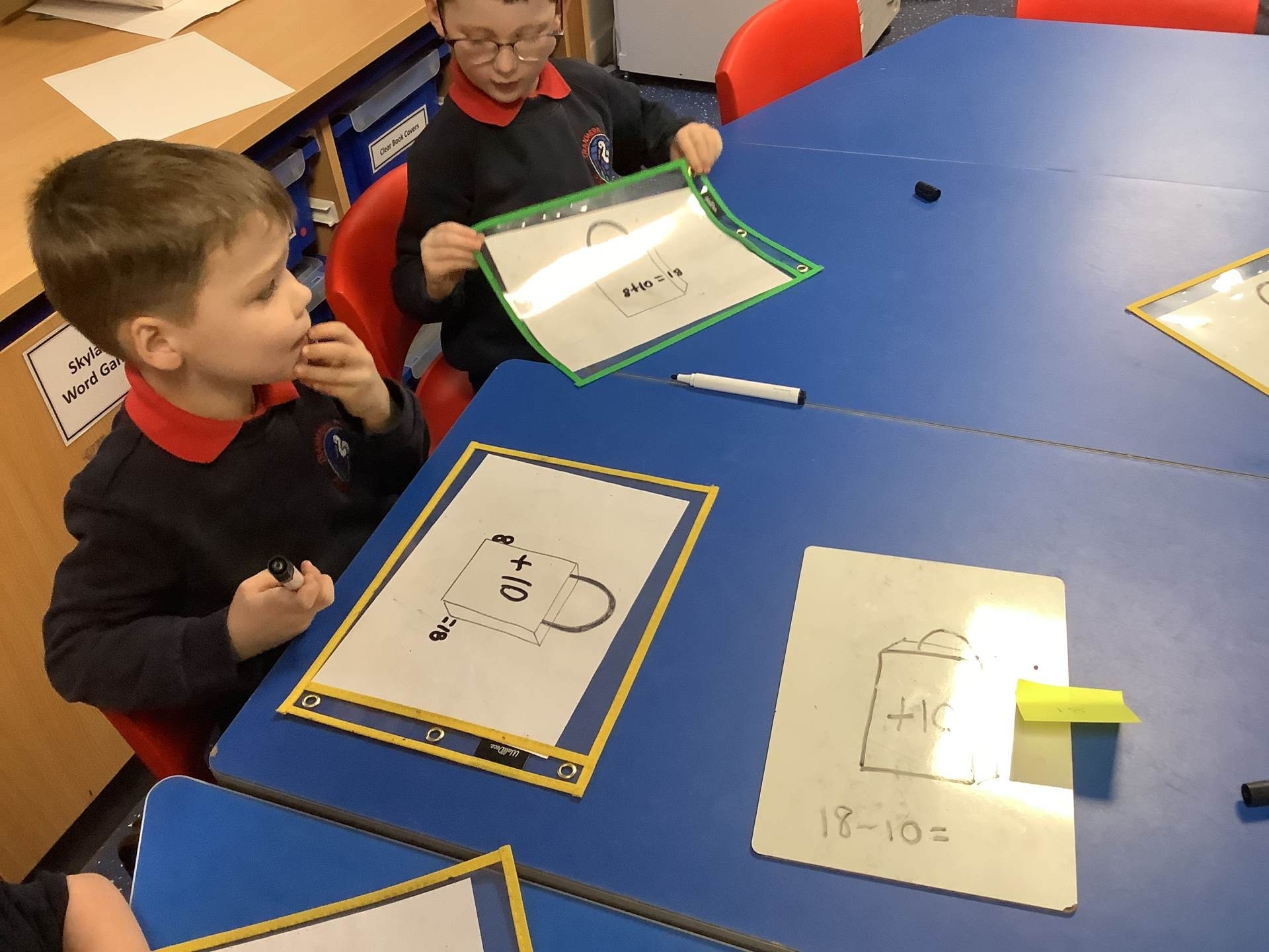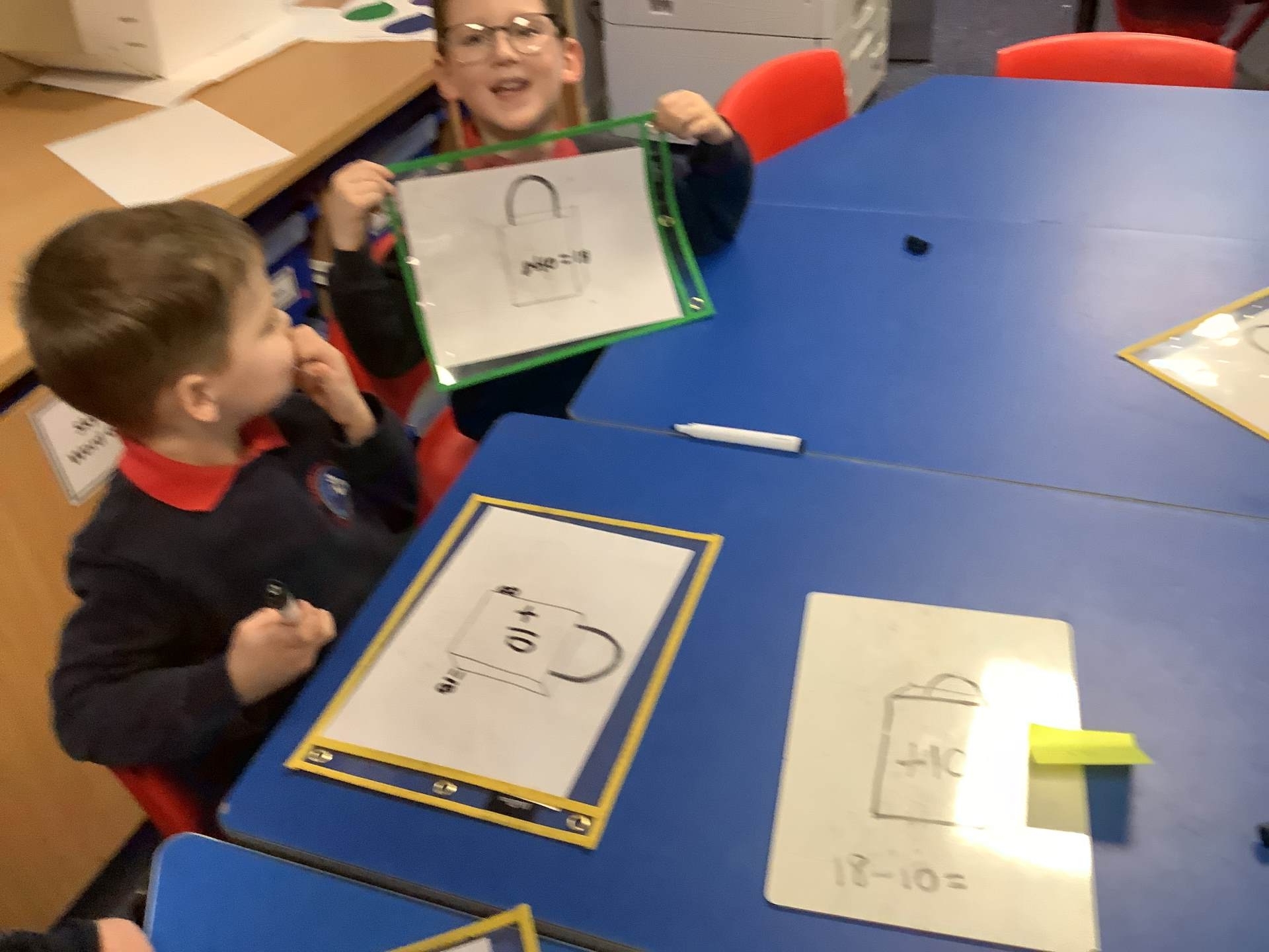 In maths this week we have been learning about subtraction. Today, our mastery group worked together to solve the 'what's in the bag?' problem. The magic bag took numbers in, did something to them and then sent them out the other side. Sometimes it added a number and sometimes it subtracted a number. The children were given the number that came out and based on what the bag did to the number, they had to work out what number had gone in. The problem led to lots of interesting mathematical discussion and great calculating too!