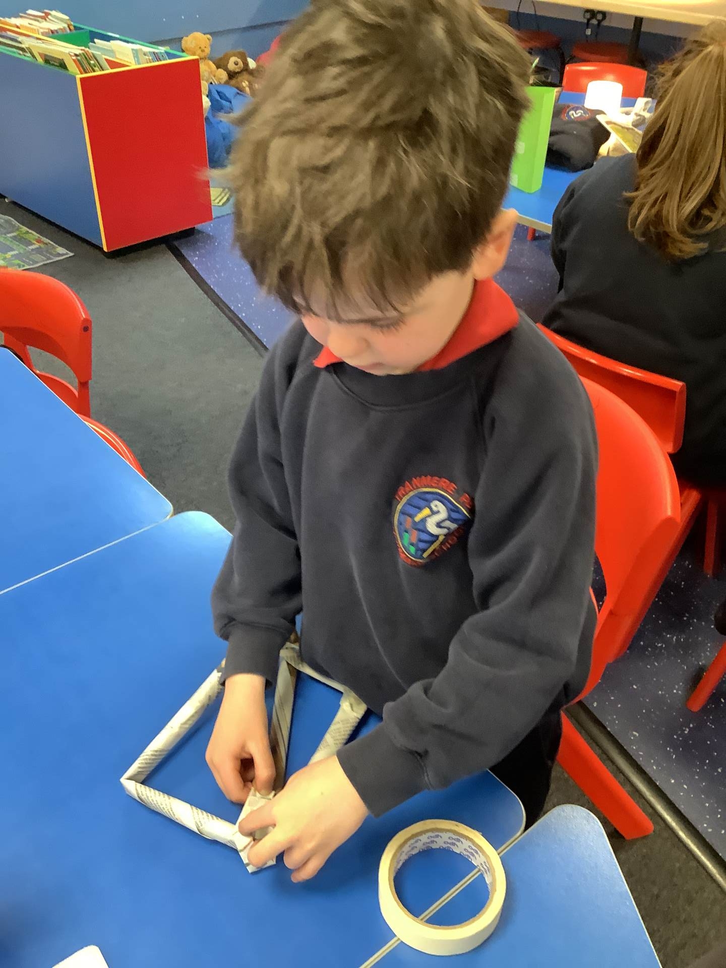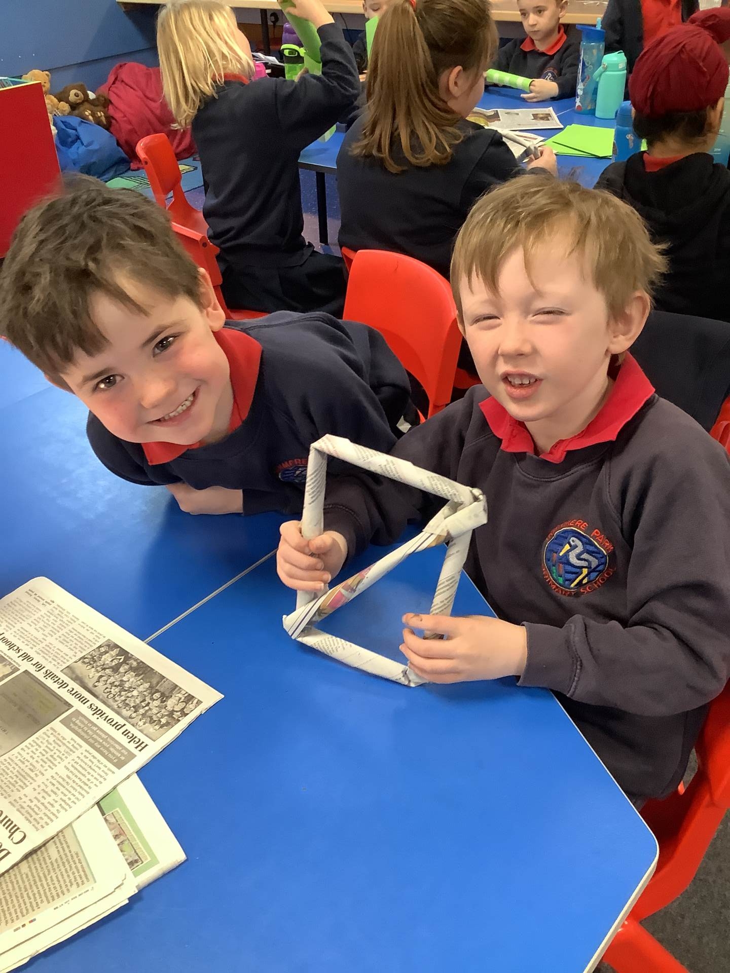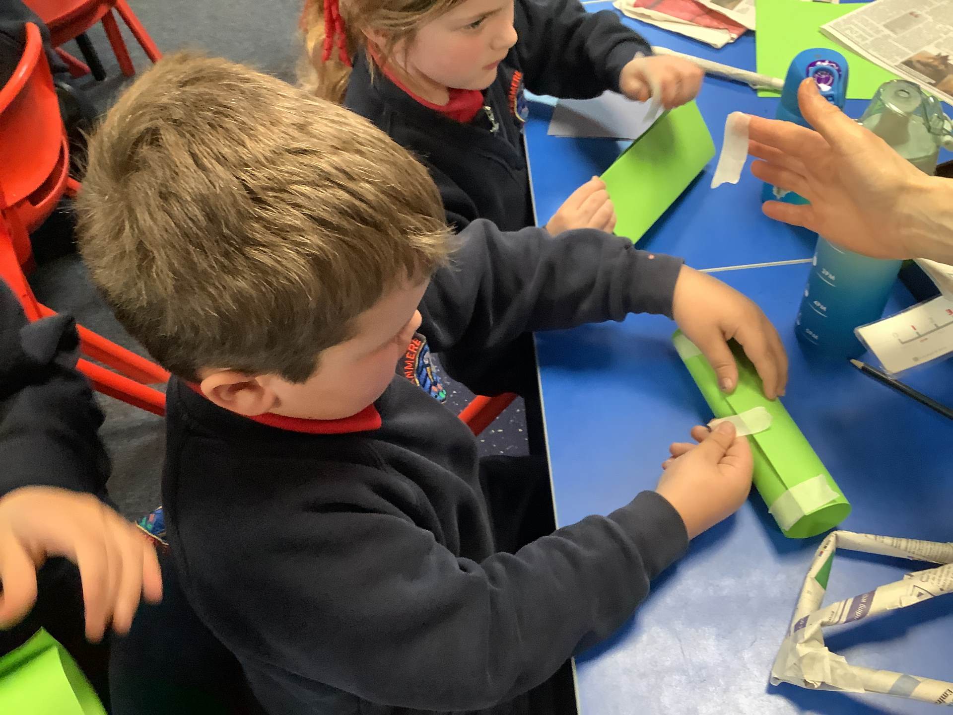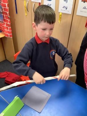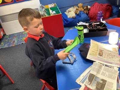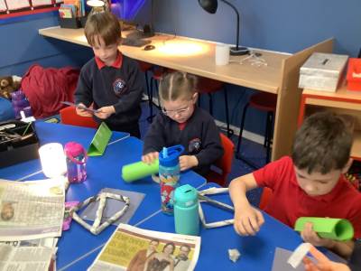 Today, the children practised laminating (layering sheets of paper/card to make it stronger), rolling, shaping (cylinders and triangular prisms are strong shapes) and we also used struts to turn squares into triangles, as triangles are stronger than squares. The children will be utilising these techniques when designing their towers this week.