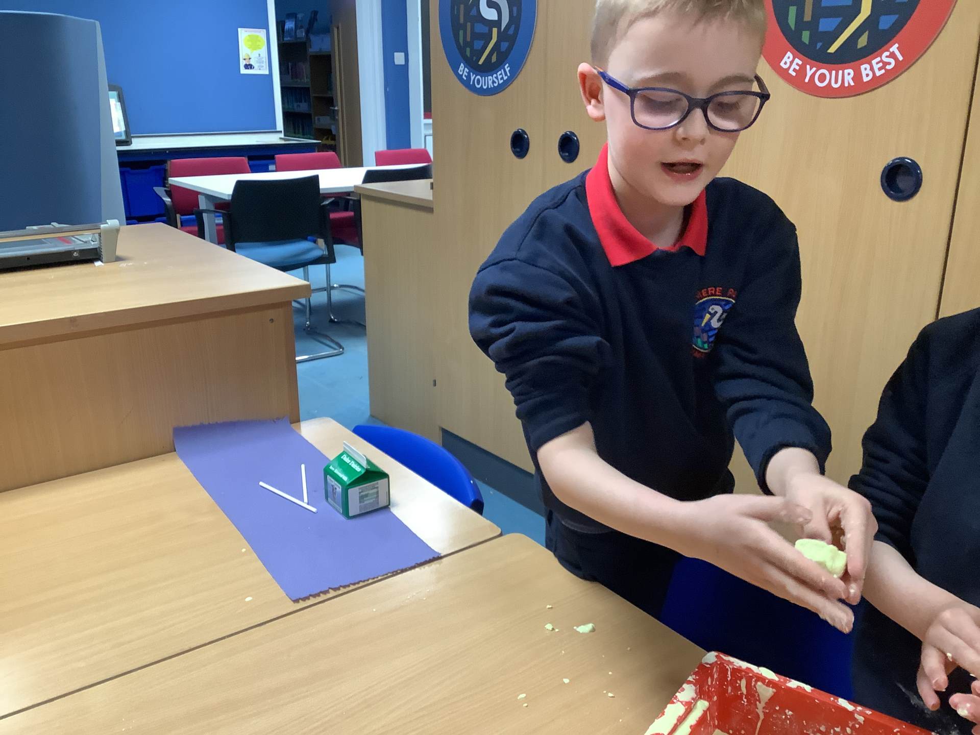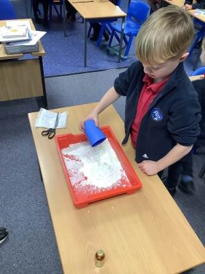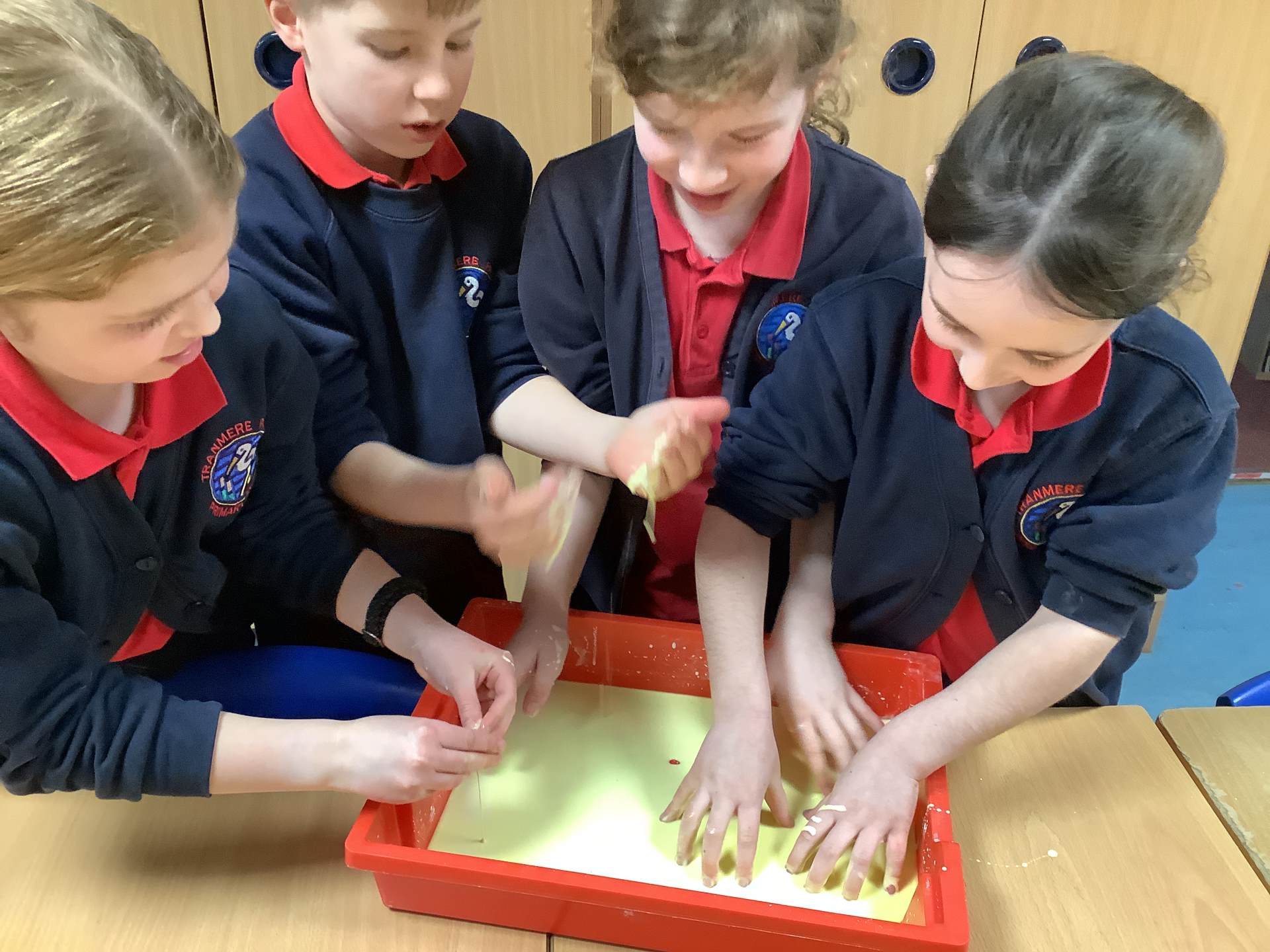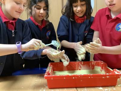 In Woodpeckers, we used corn flour, water and food colouring to create our own Non-Newtonian fluid. We spent time exploring this and discussed how it acts as a liquid and a solid depending on how much pressure you use.