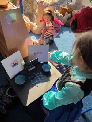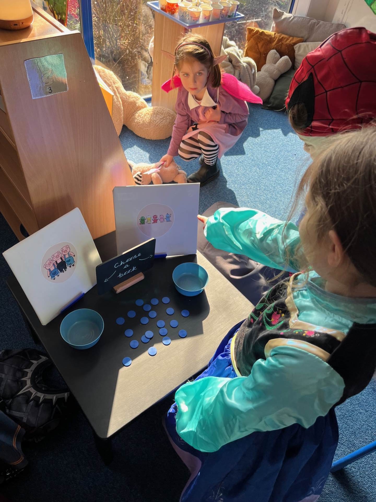 After some sessions, the story continued into play, as the children moved into the story-telling area to bring the book to life using our characters and resources. Play was enriched by adults modelling and using positional and descriptive language while setting up scenes, and by encouraging the children to use character voices and interactions as they re-enacted parts of the story together.